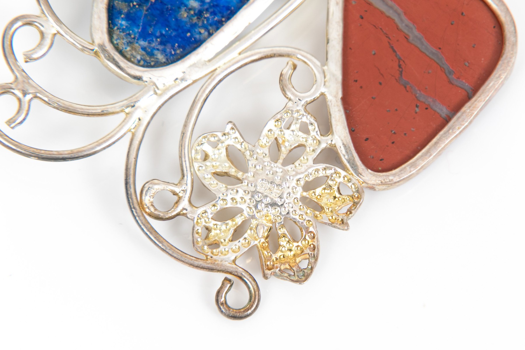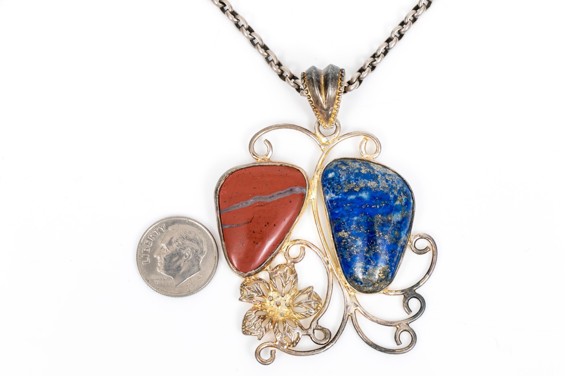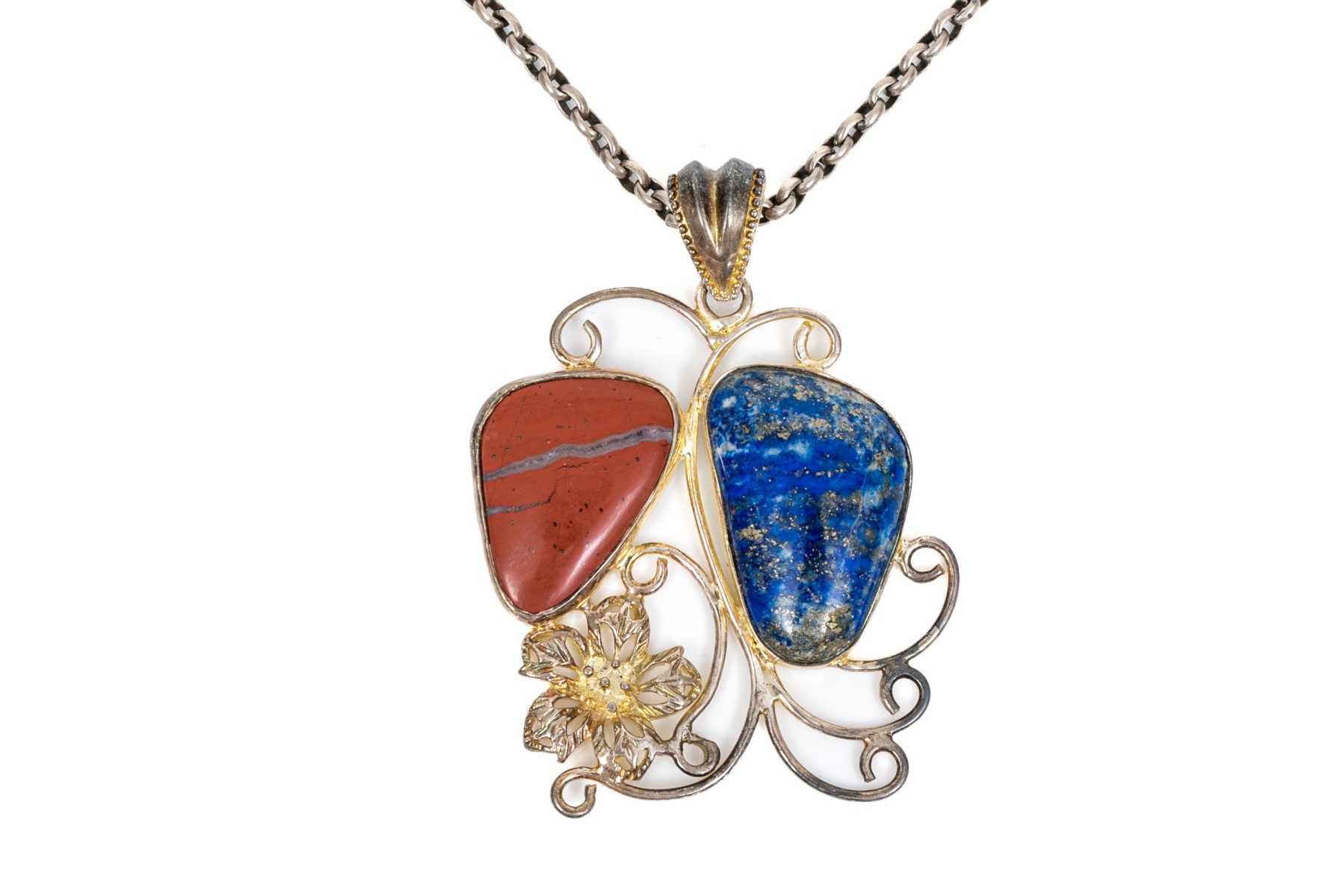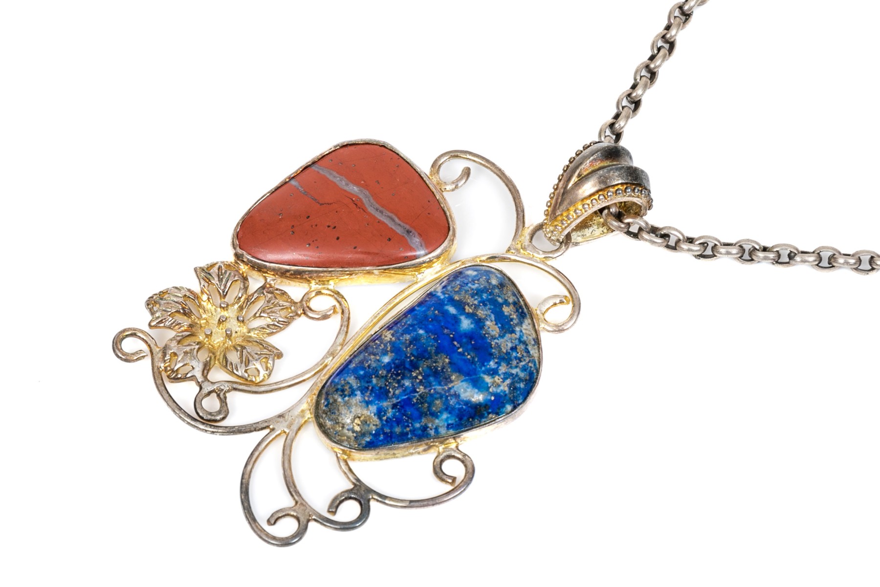 Sterling silver chunky curb chain with an impactul lapis and jasper pendant, finished with a lobster claw style clasp