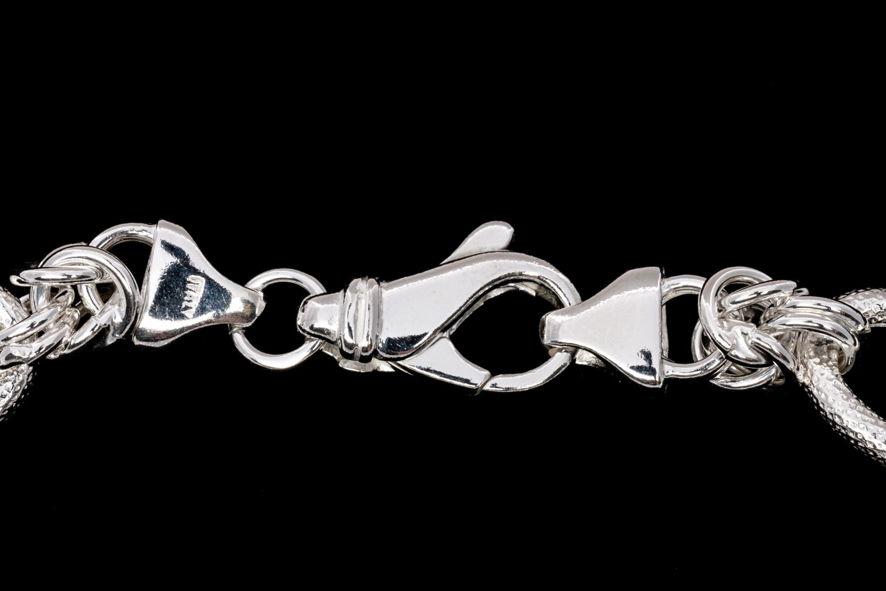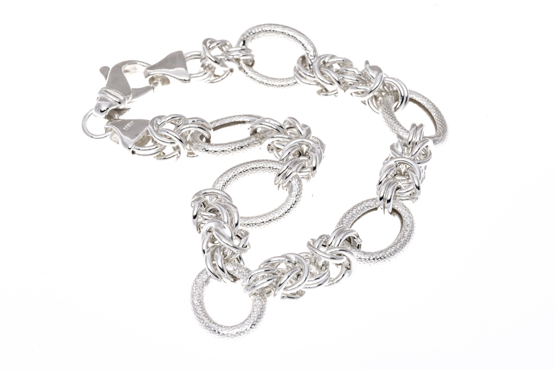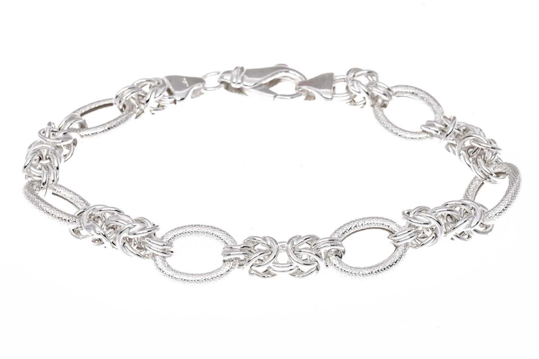 Sterling silver bracelet. This classic bracelet is a high polished, puffed byzantine style link, alternating with an oval patterned matte finish link, with a lobster claw style clasp.