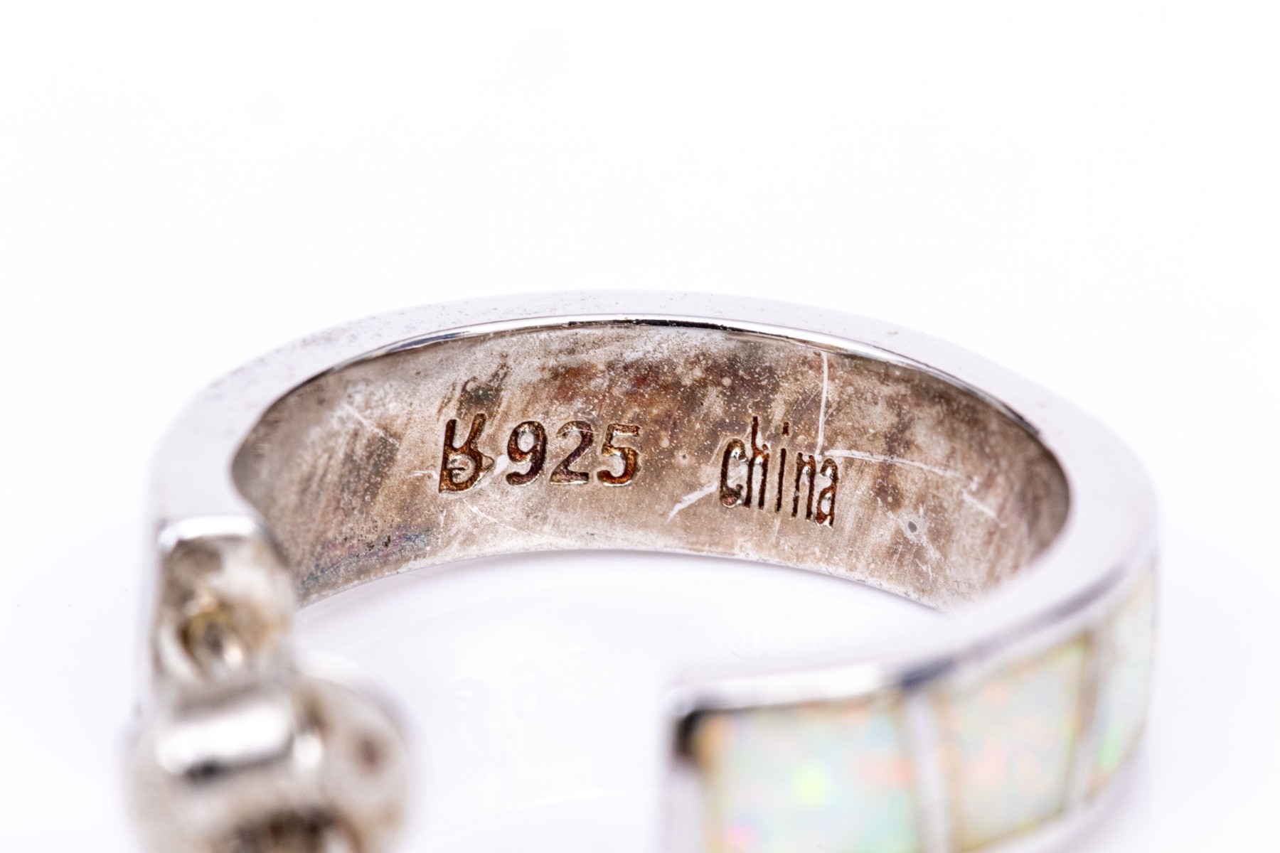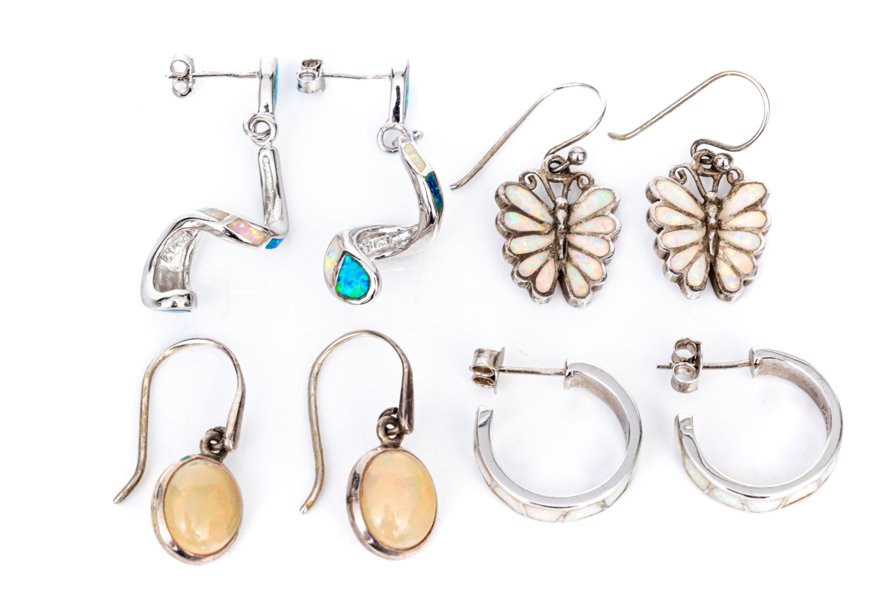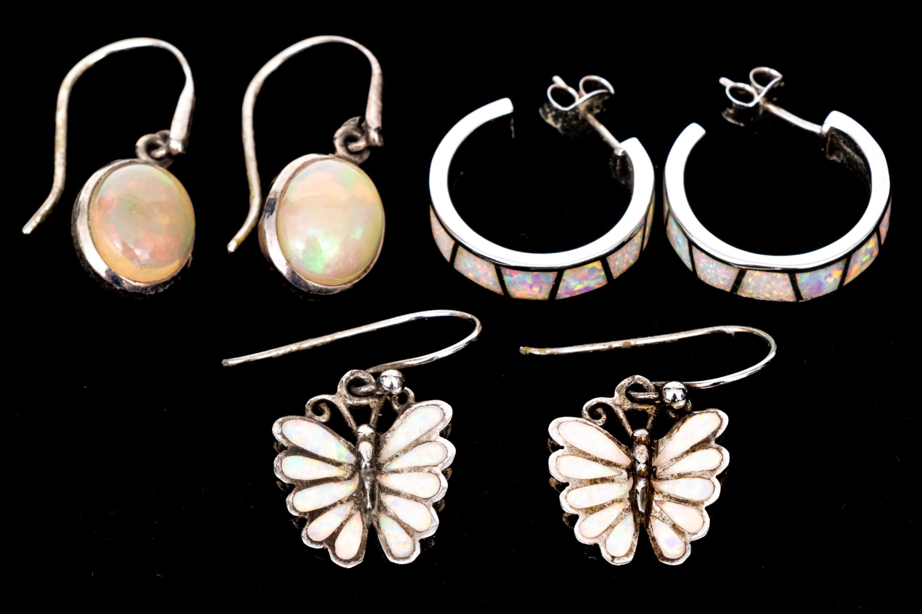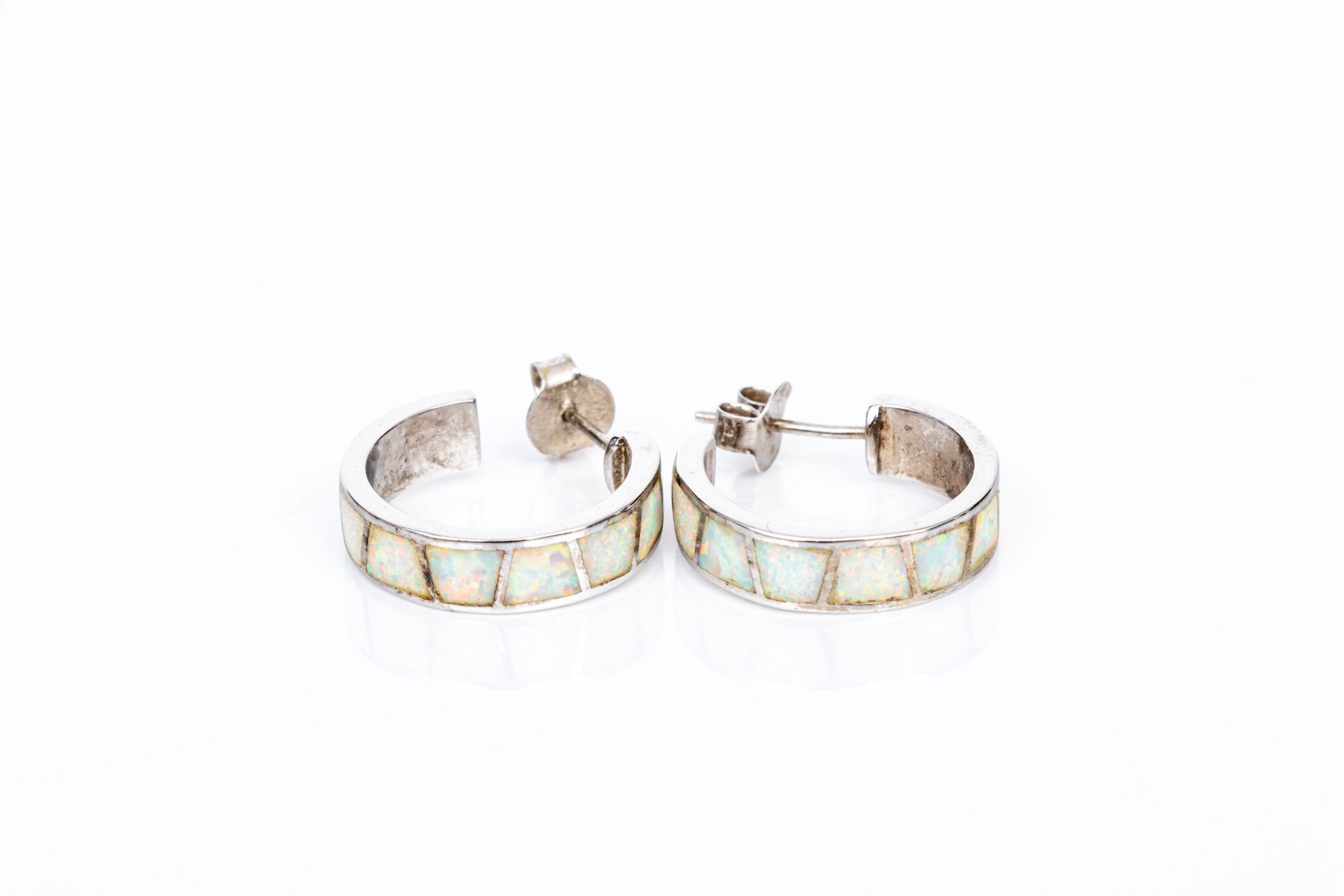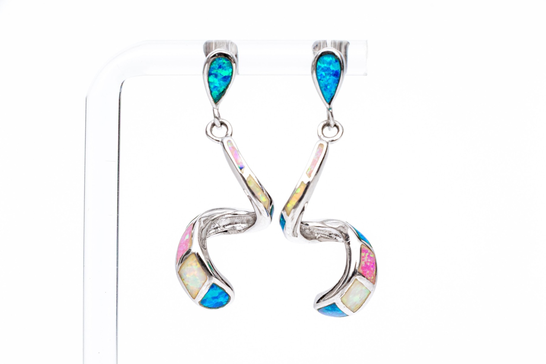 Collection of four sterling silver opal doublet inlaid earrings. This collection includes two pairs of drop pendant earrings with shepherd's style hooks, a multi-color inaid spiral with posts and clutch style backs and a pair of inlaid hoops with posts and clutch style backs. Please note: an opal doublet is an assembled man made stone.