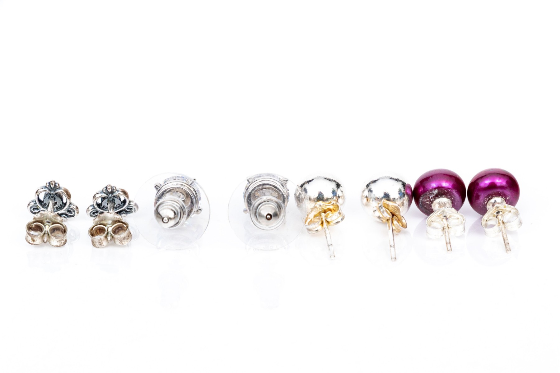 Collection of four pairs of sterling silver stud earrings. This collection includes one pair of 8mm ball studs, one pair of dark pink-purple dyed cultured freshwater pearl studs, and two pairs of cz set studs. All of the earrings have posts, three are finished with clutch style backs and one is finished with plastic disc style backs