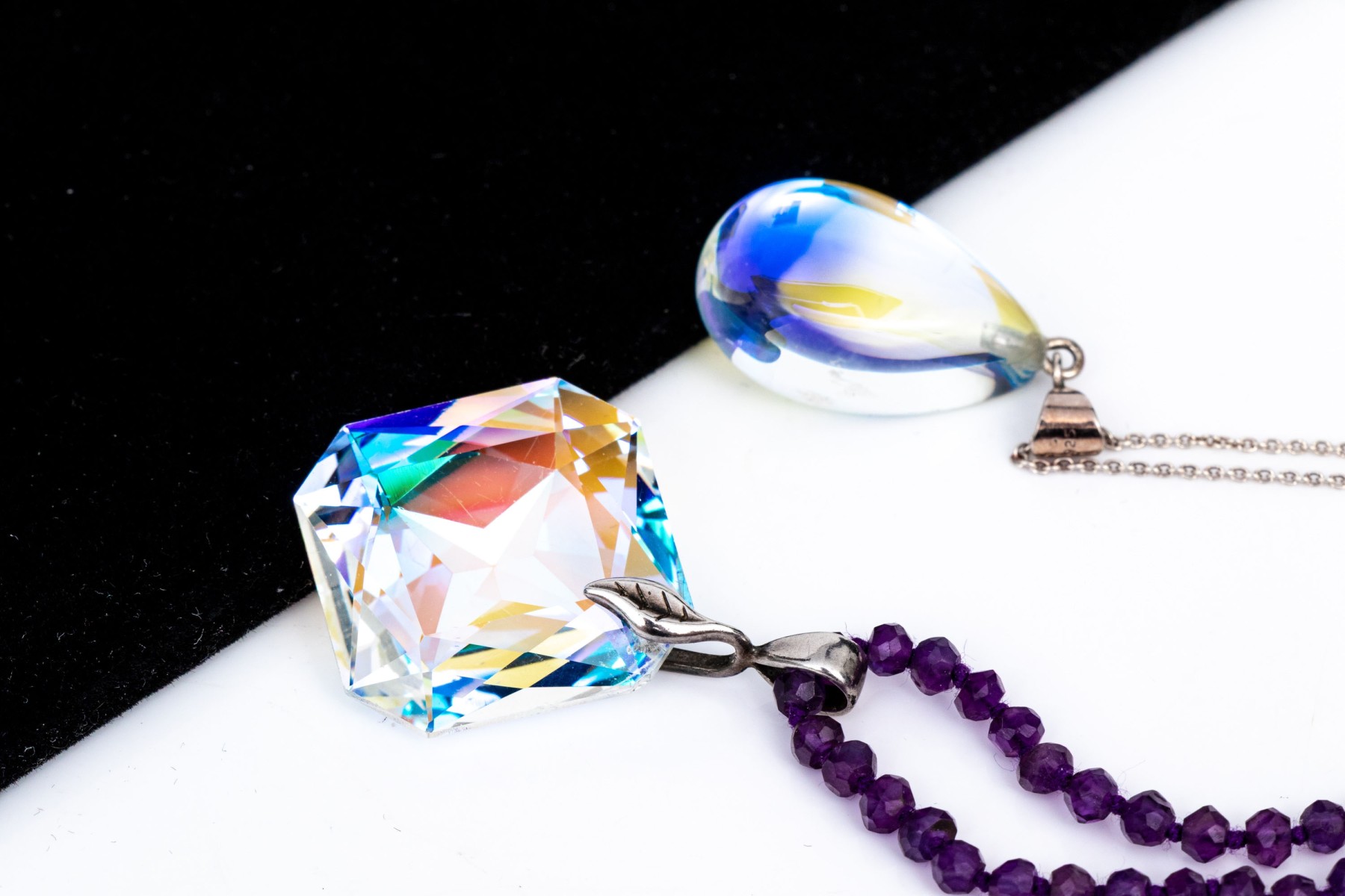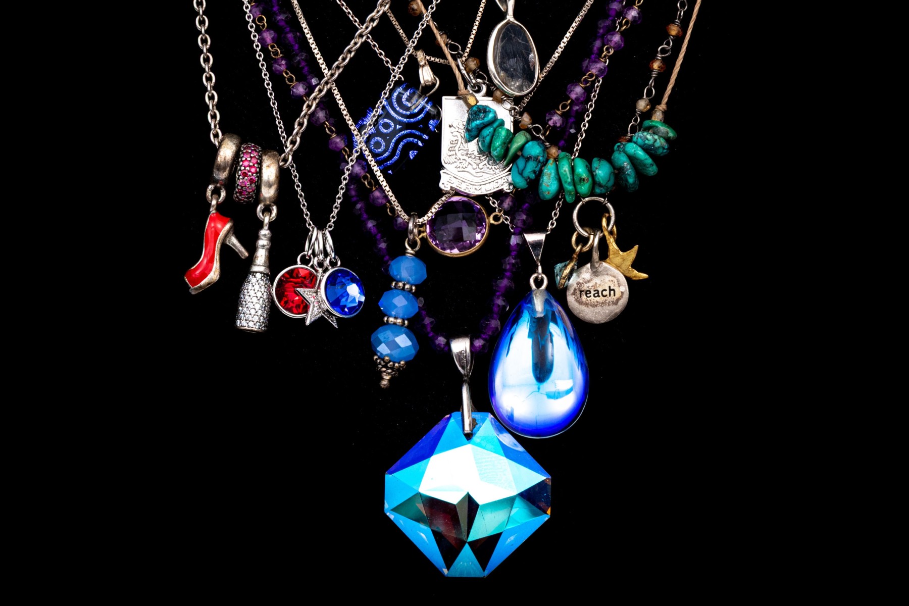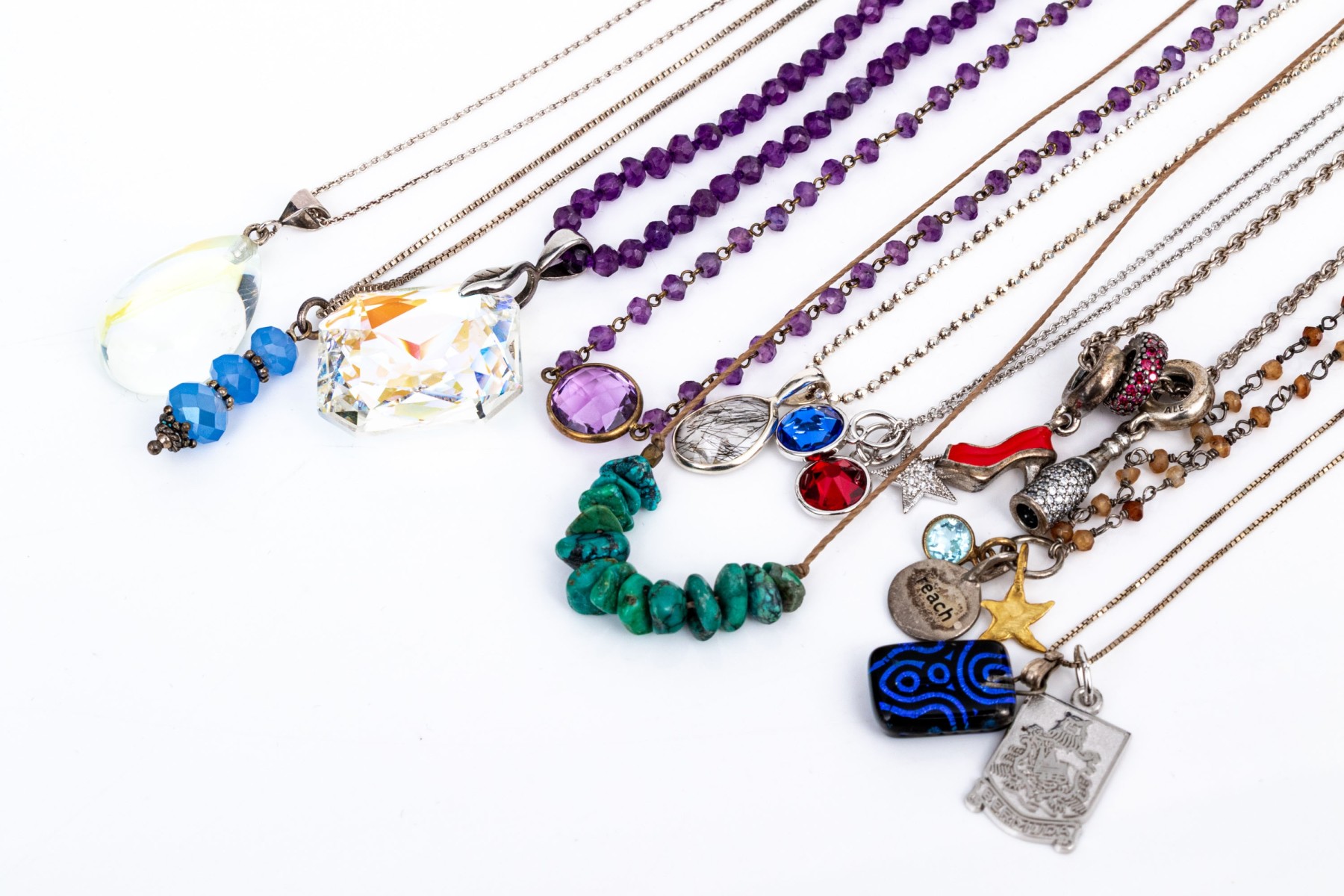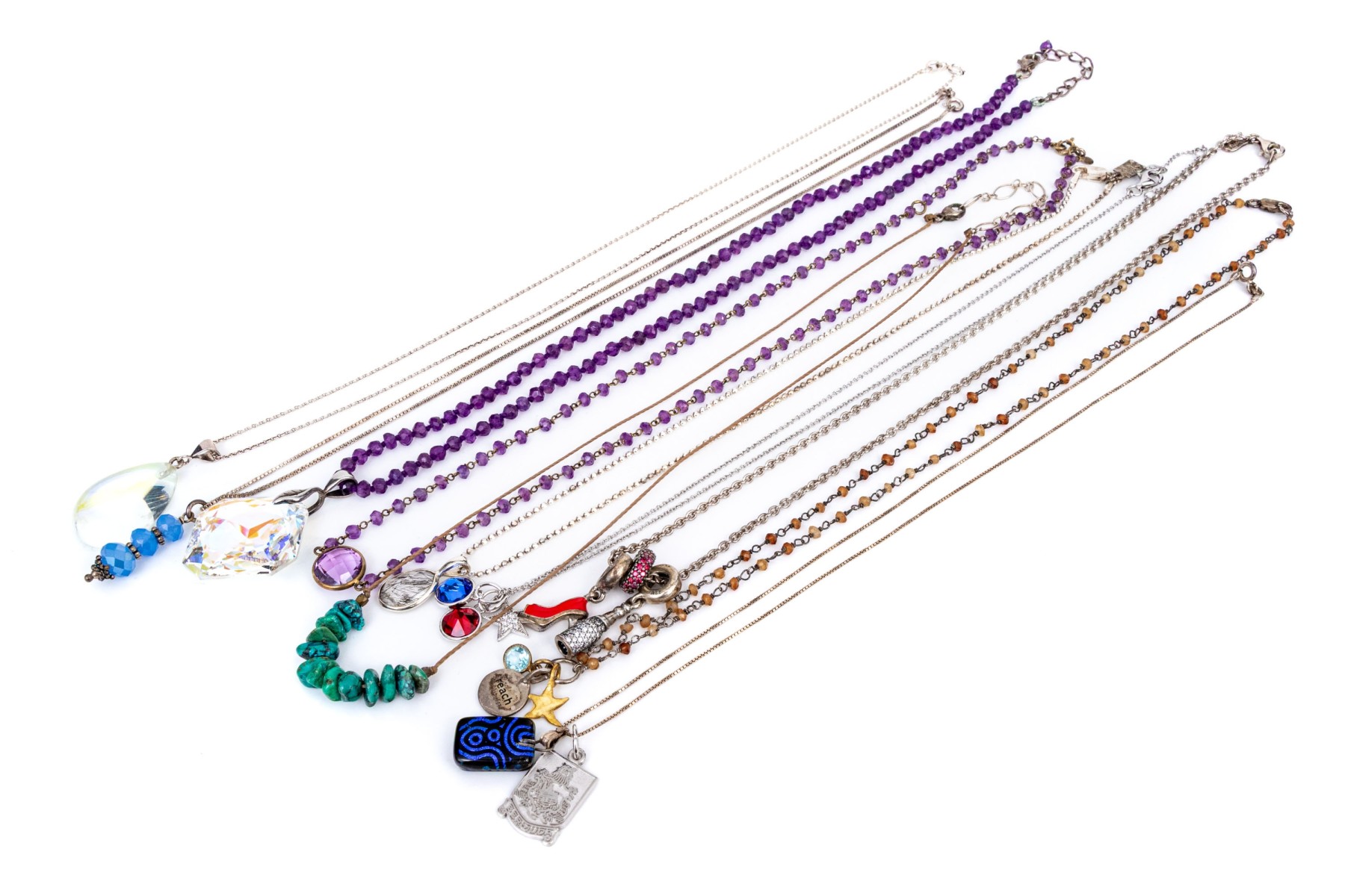 Collection of ten sterling silver necklaces, bead and chain varieties, and pendants. The collection includes beaded crystal varieties, Pandora, turquoise on string