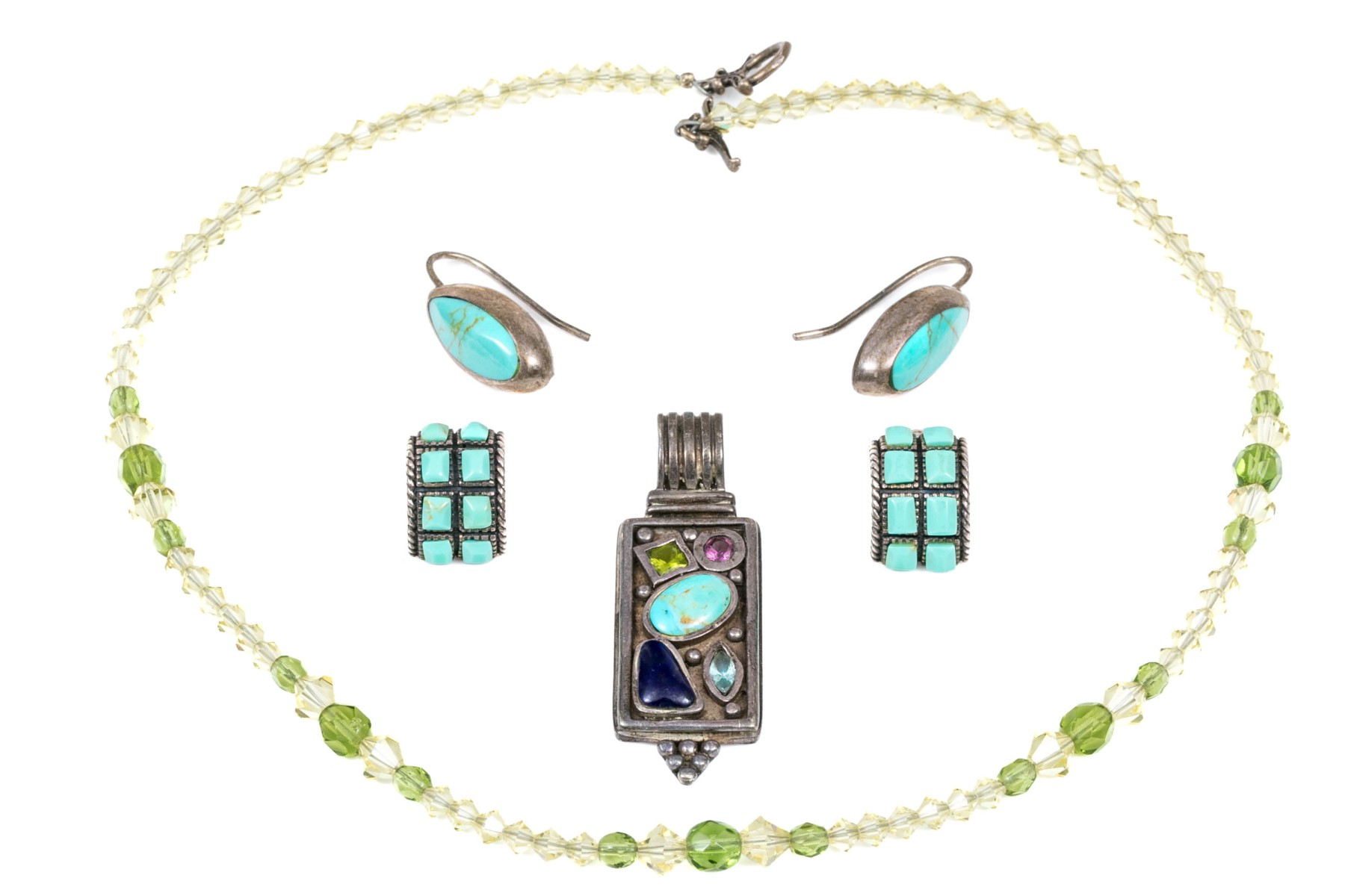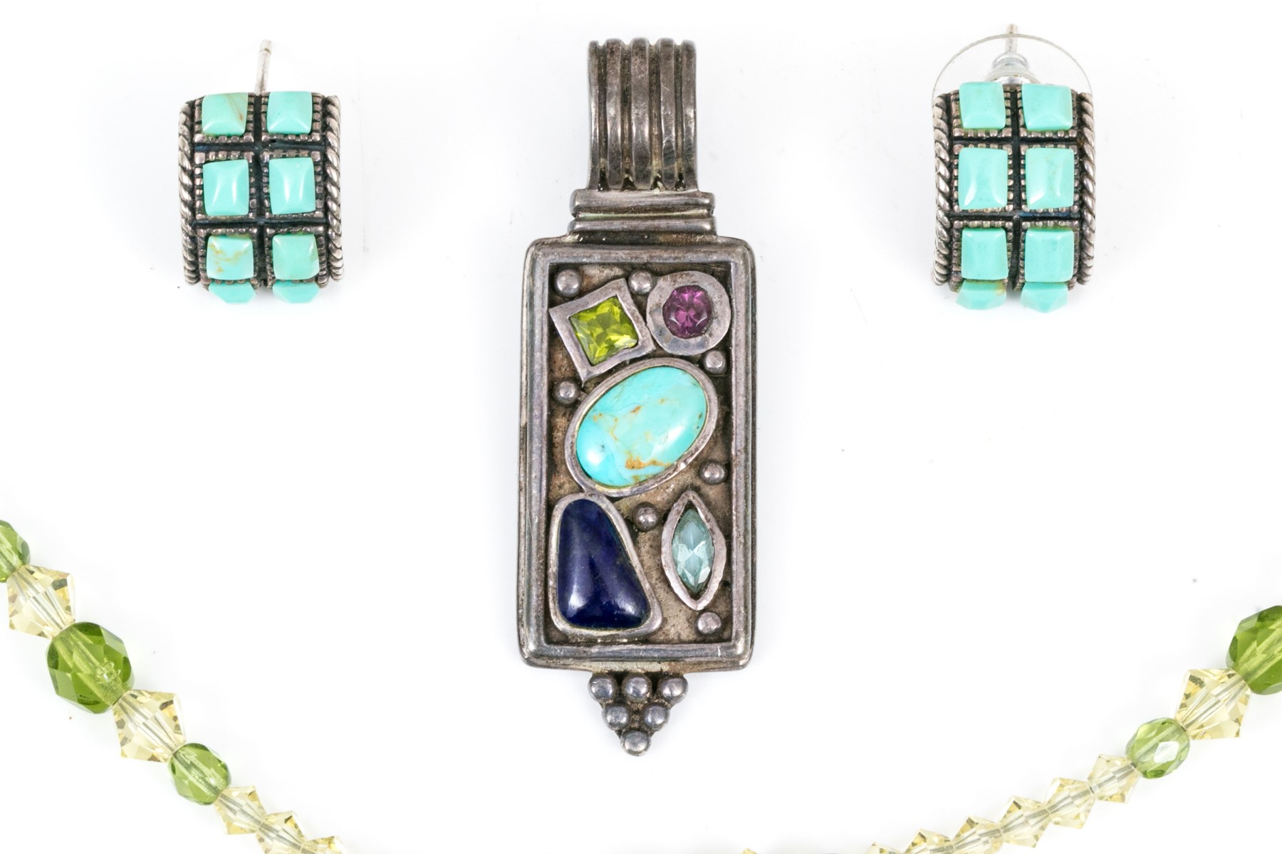 Sterling silver colorful collection of contemporary glass jewelry, with complementary bead necklace with silver plated clasp
