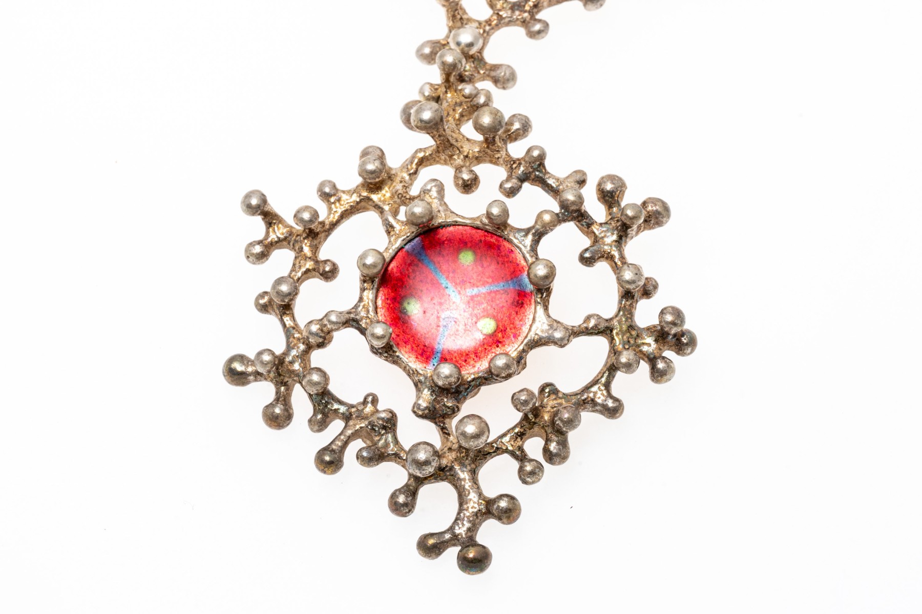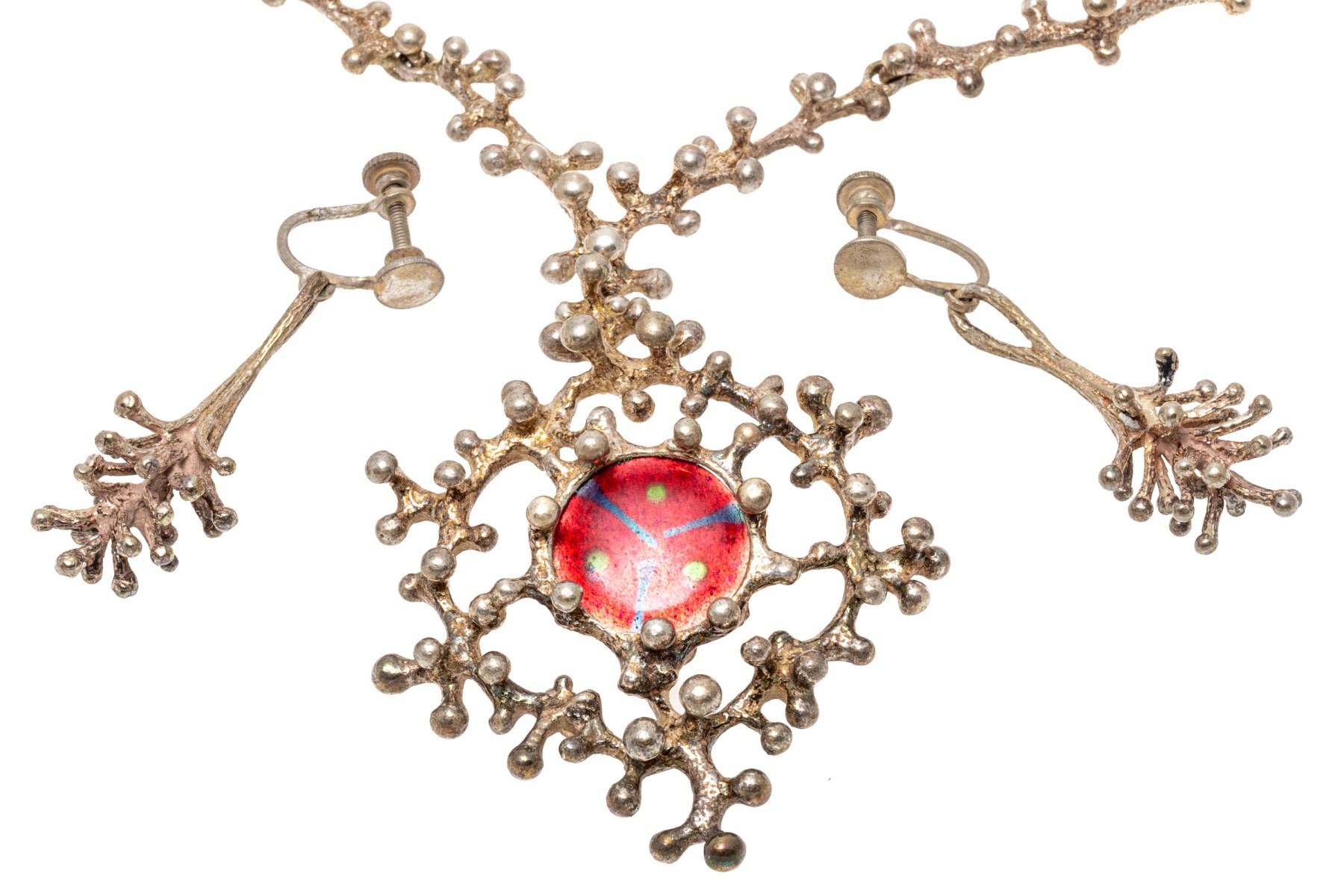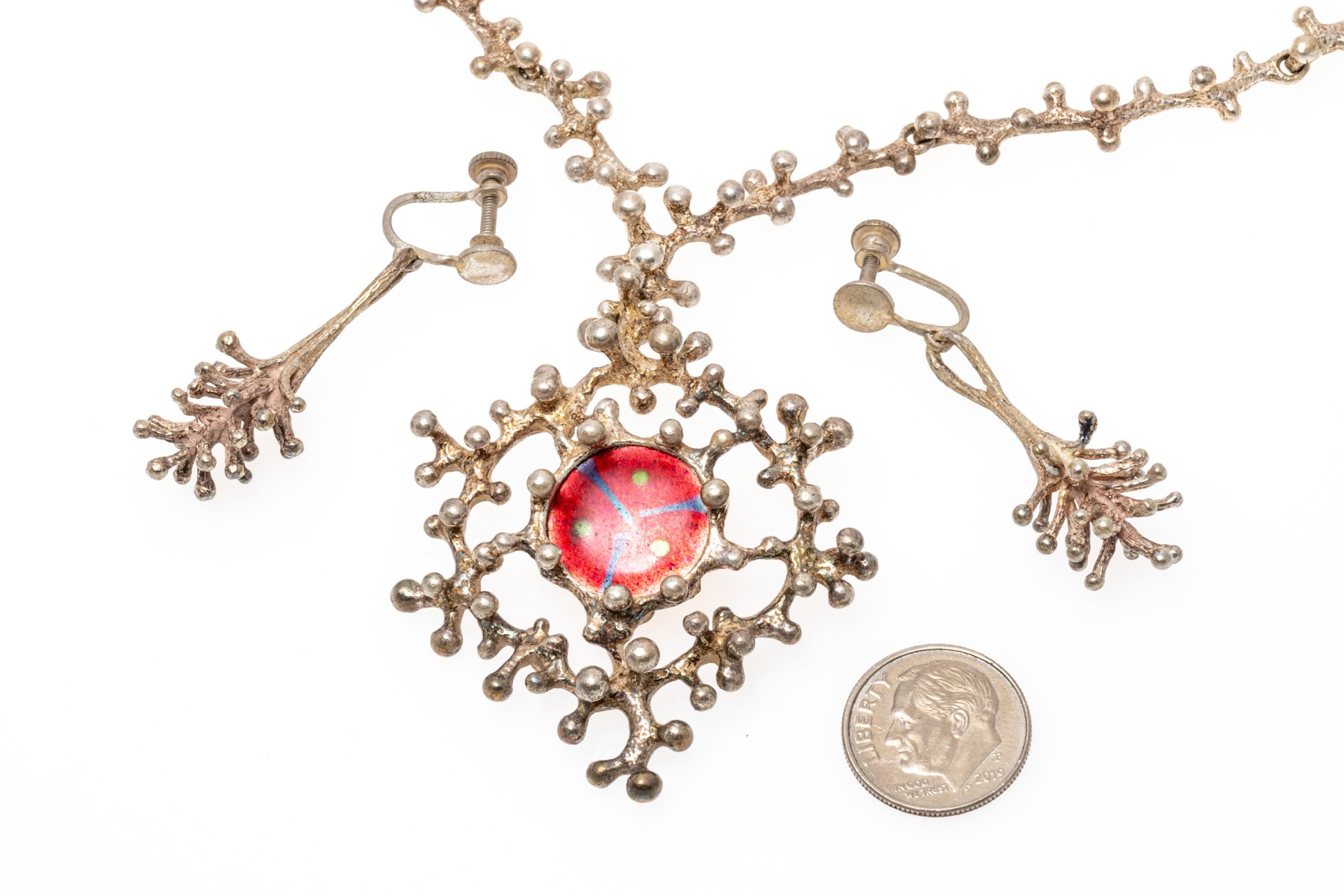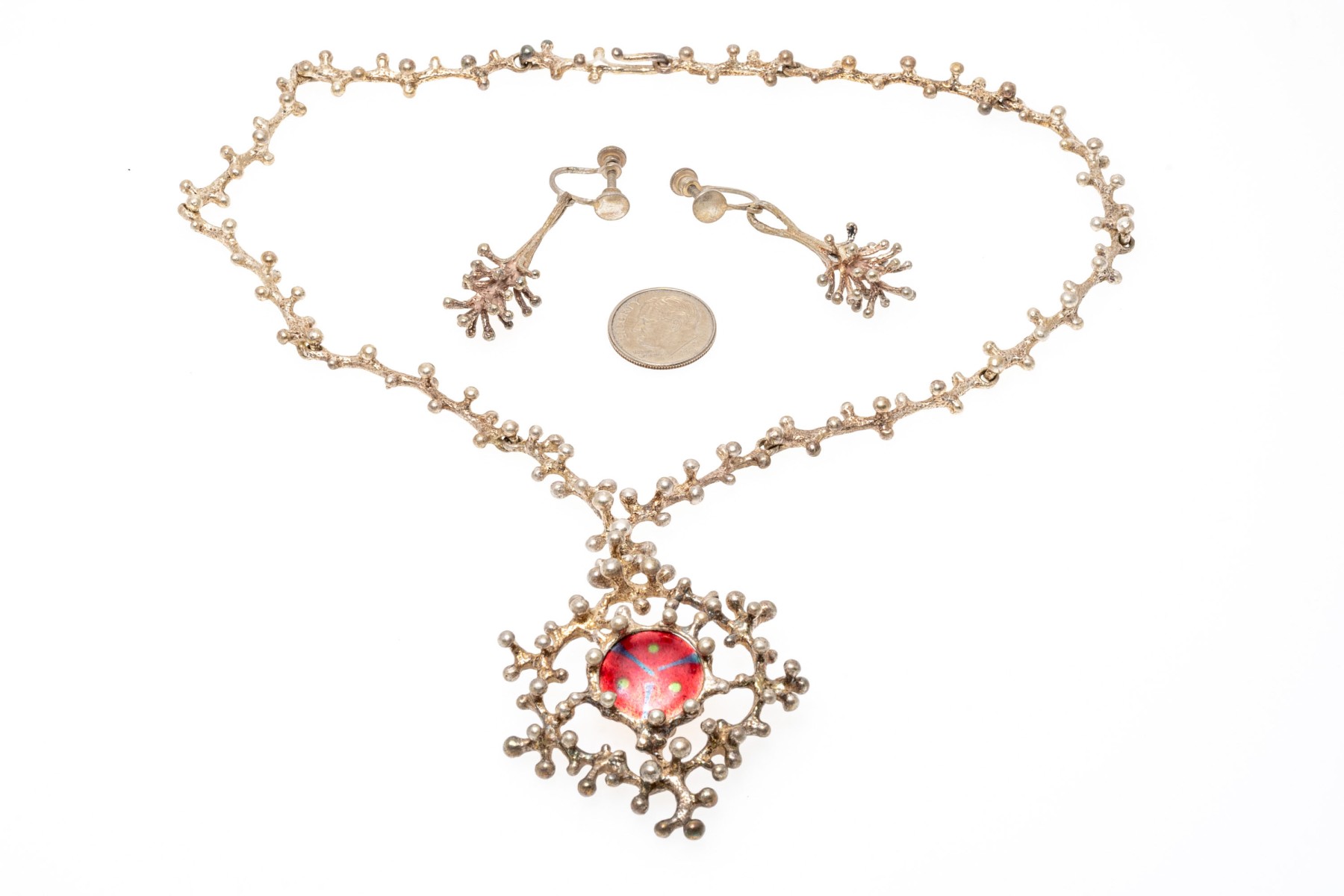 Sterling silver, copper and enamel Brutalist necklace, with earrings, clip on style