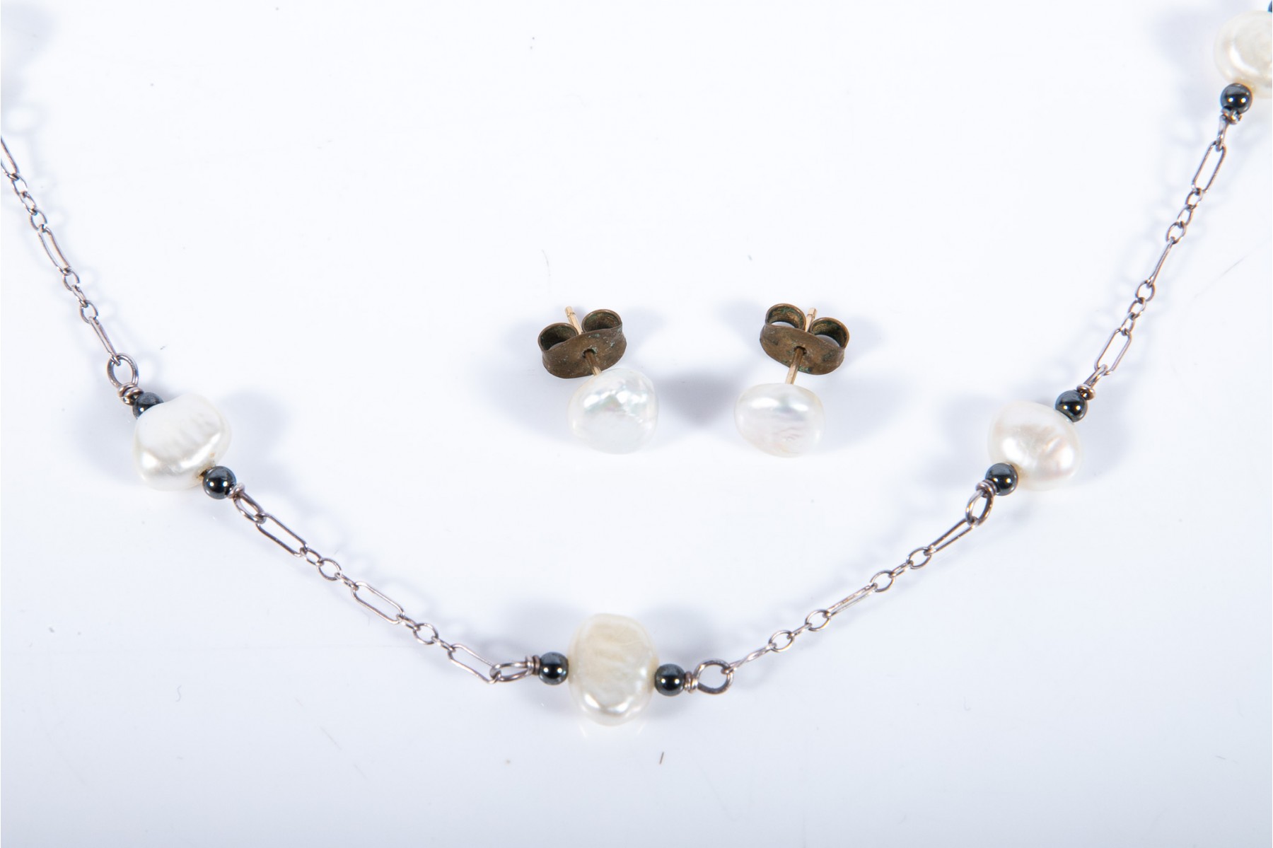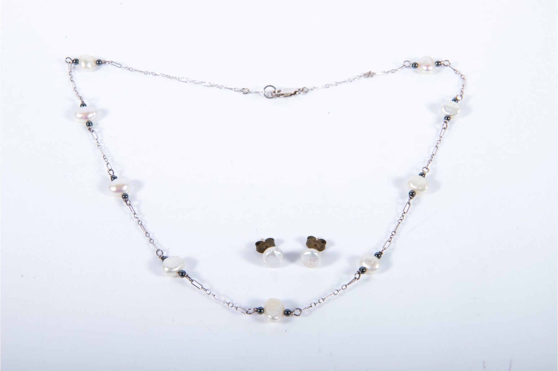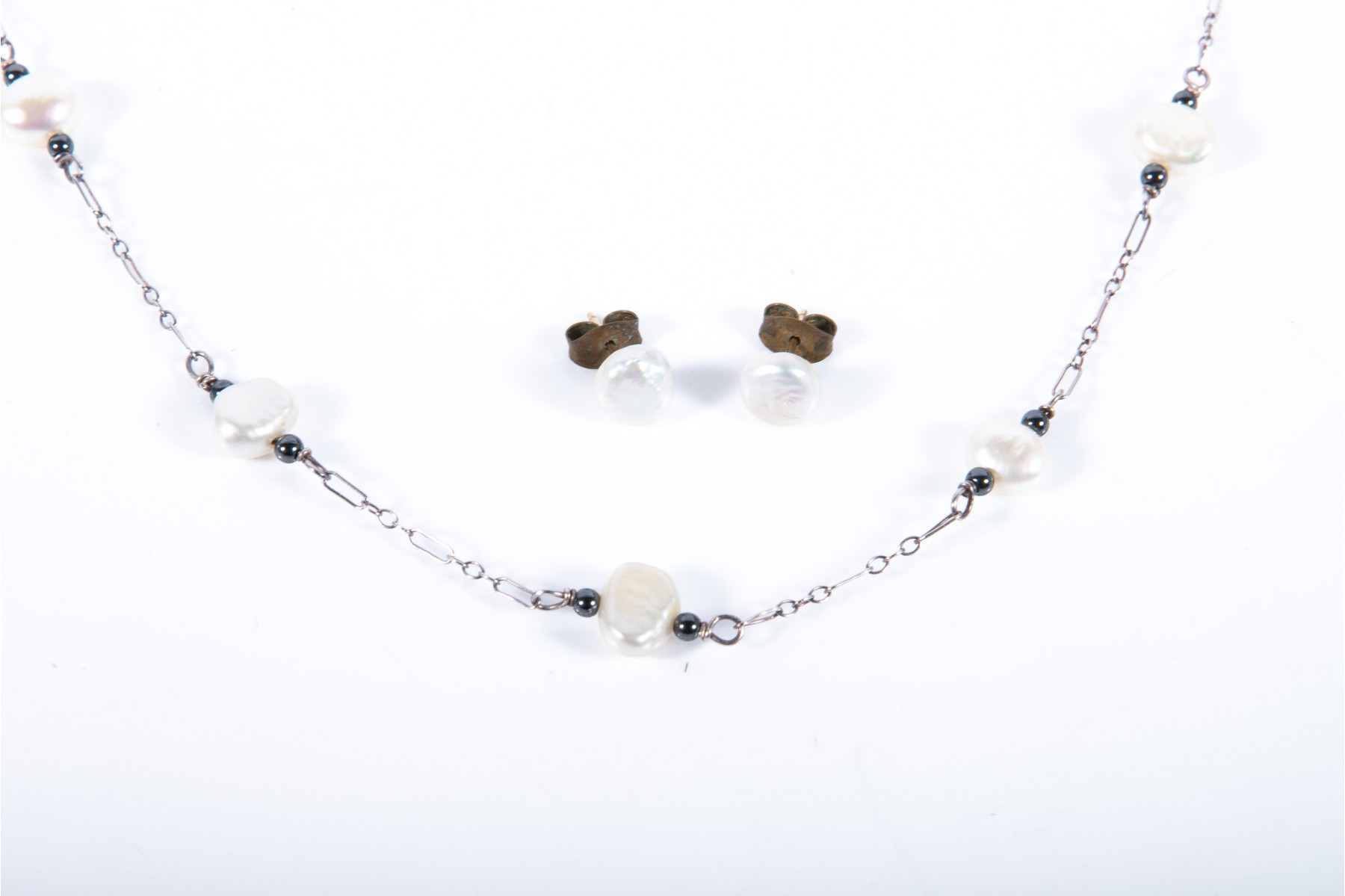 A delightful sterling figaro chain accented with neutral white cultured keshi pearls with gunmetal-hued bead spacers. Accompanied by a complimenting pair of stud earrings on yellow gold posts.