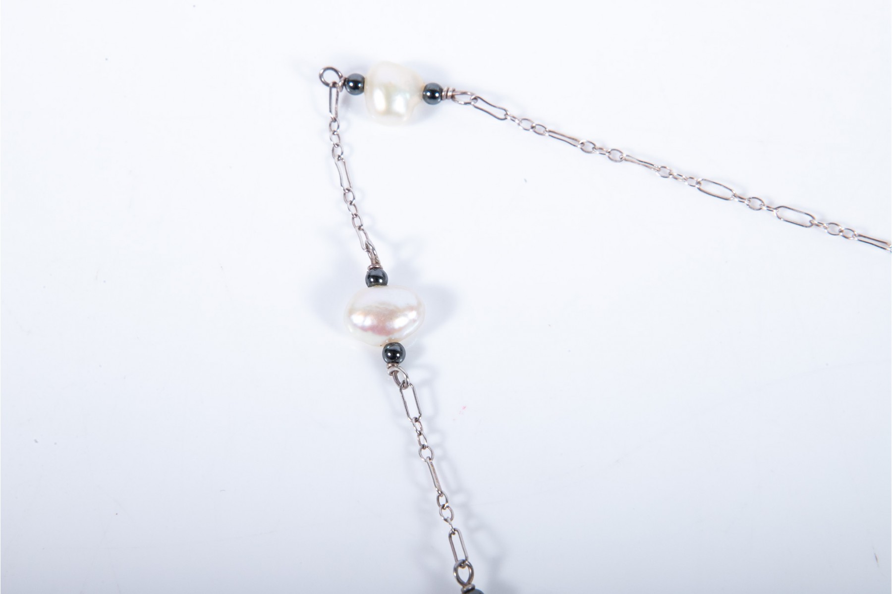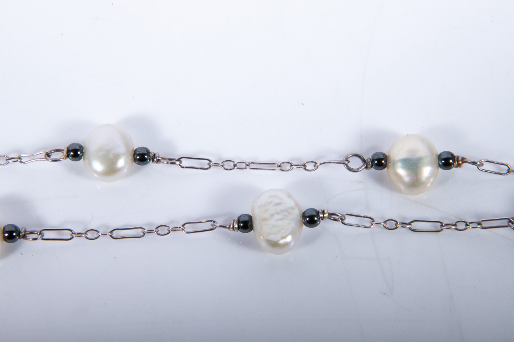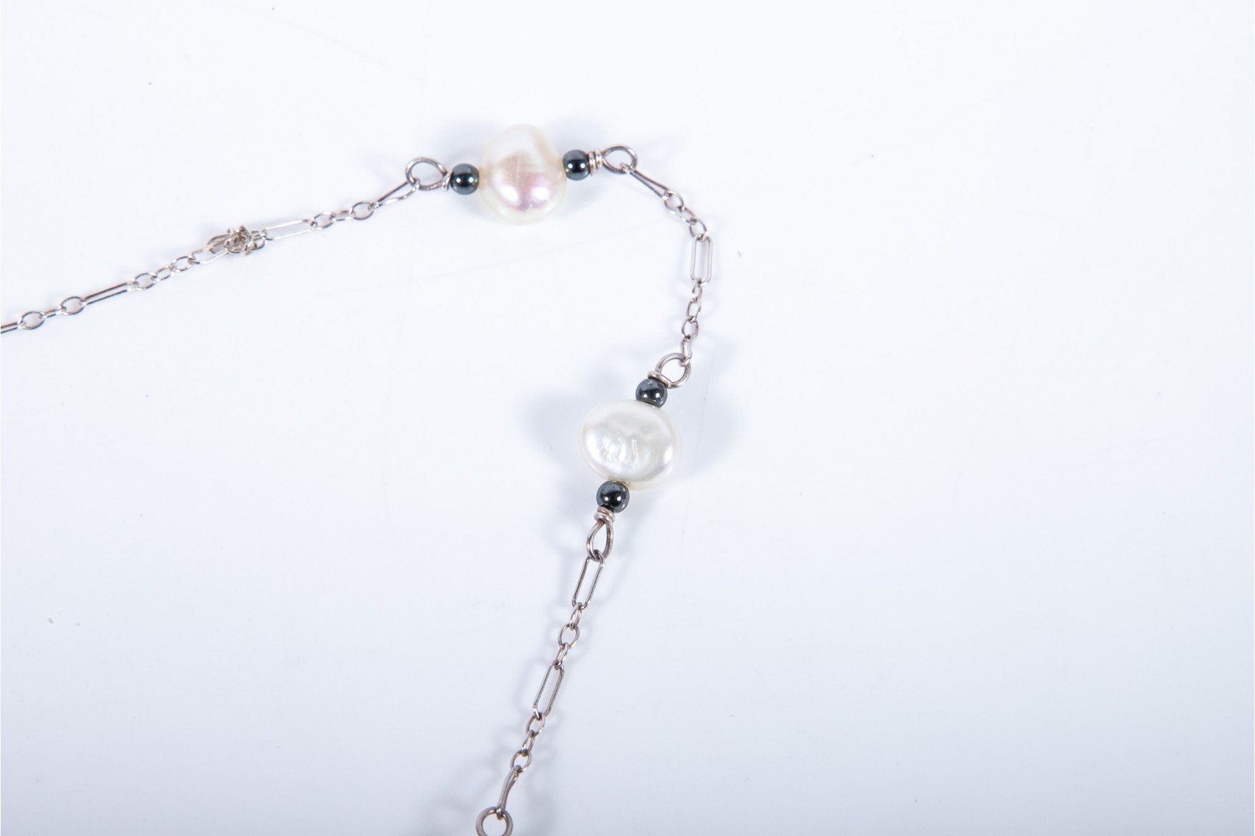 A delightful sterling figaro chain accented with neutral white cultured keshi pearls with gunmetal-hued bead spacers. Accompanied by a complimenting pair of stud earrings on yellow gold posts.