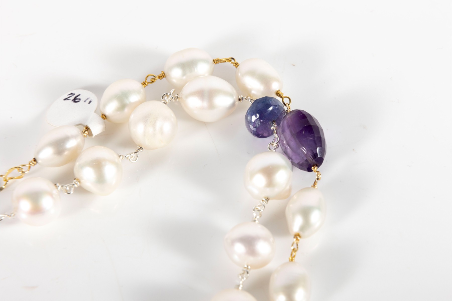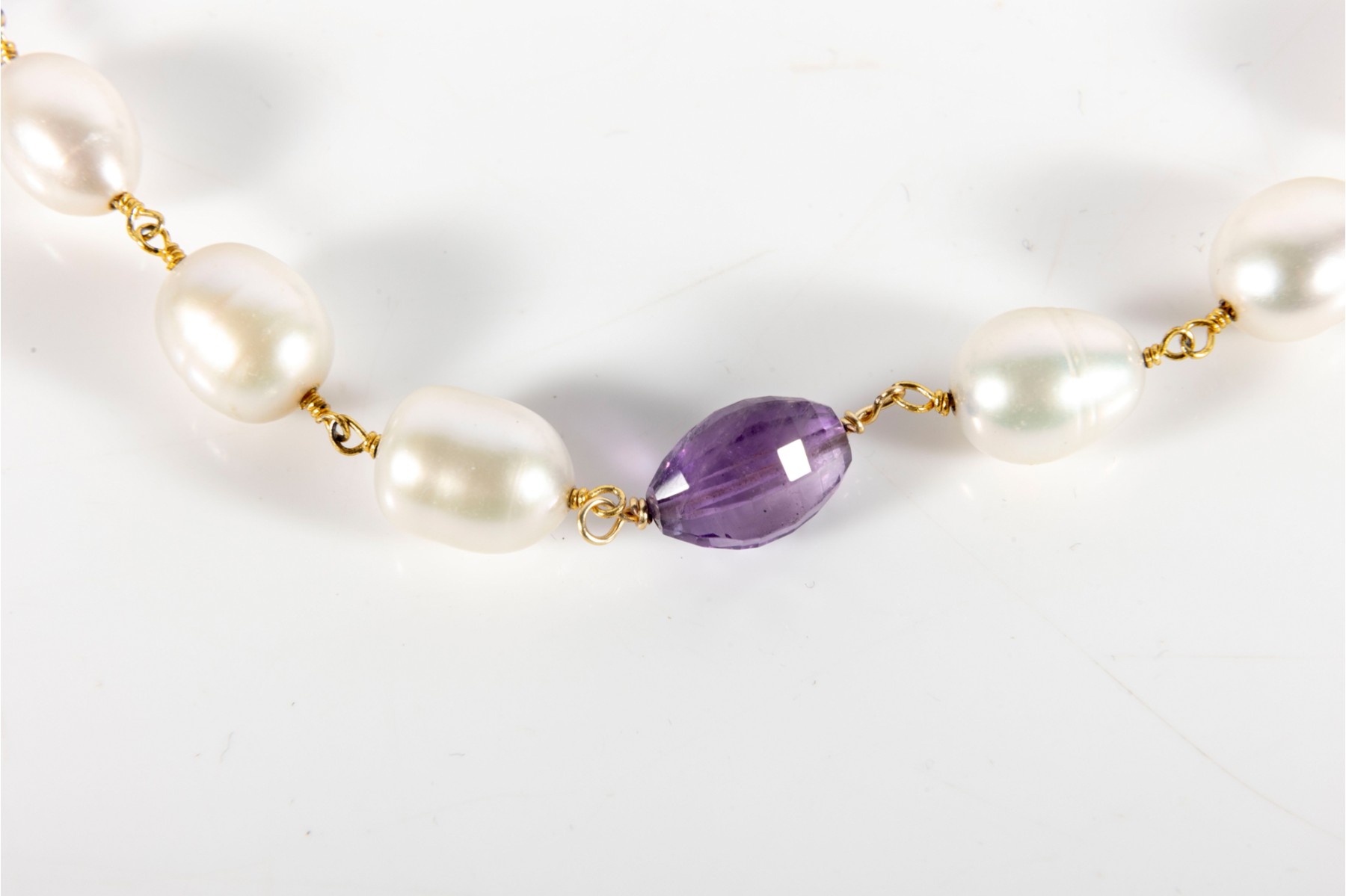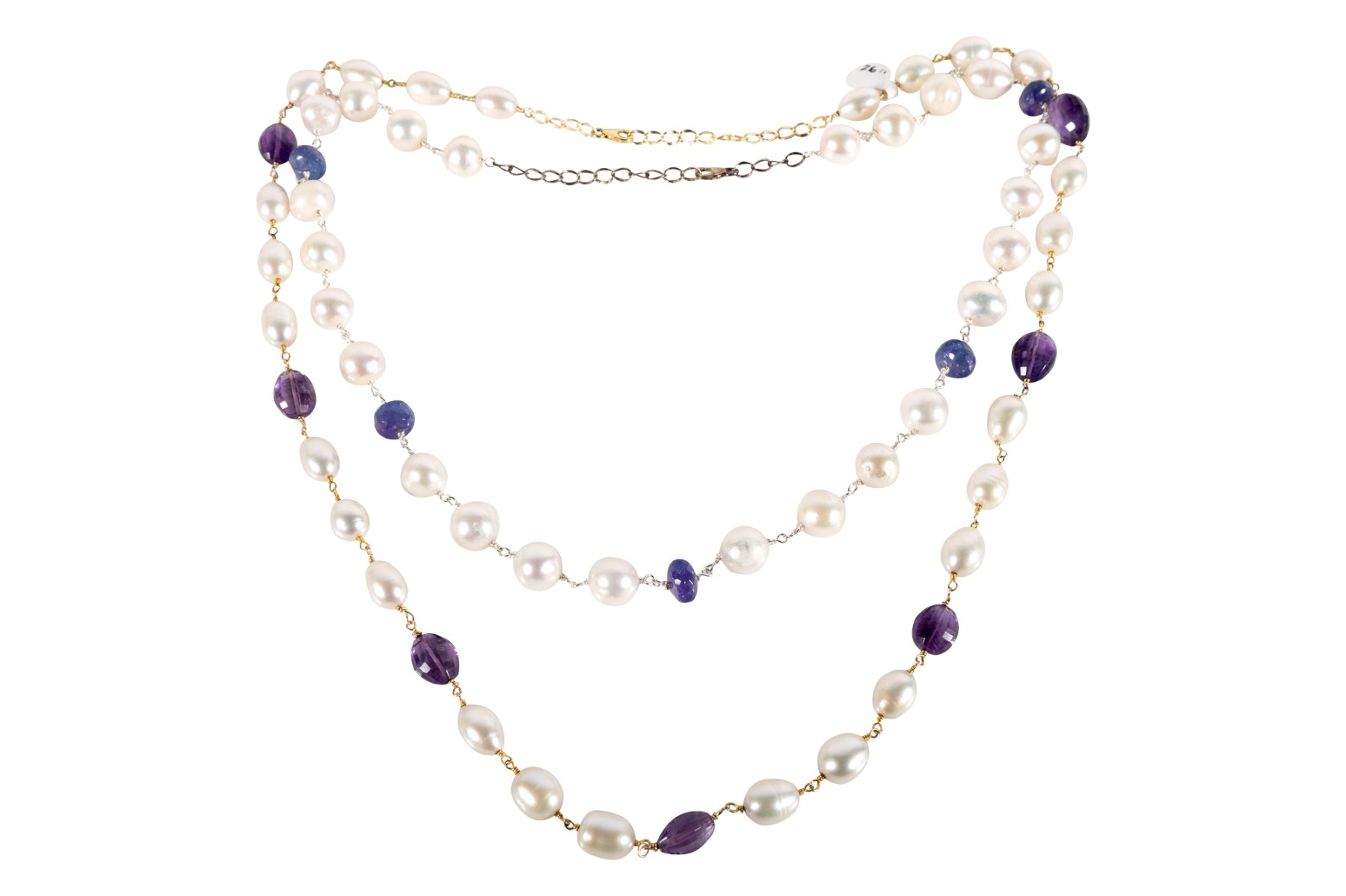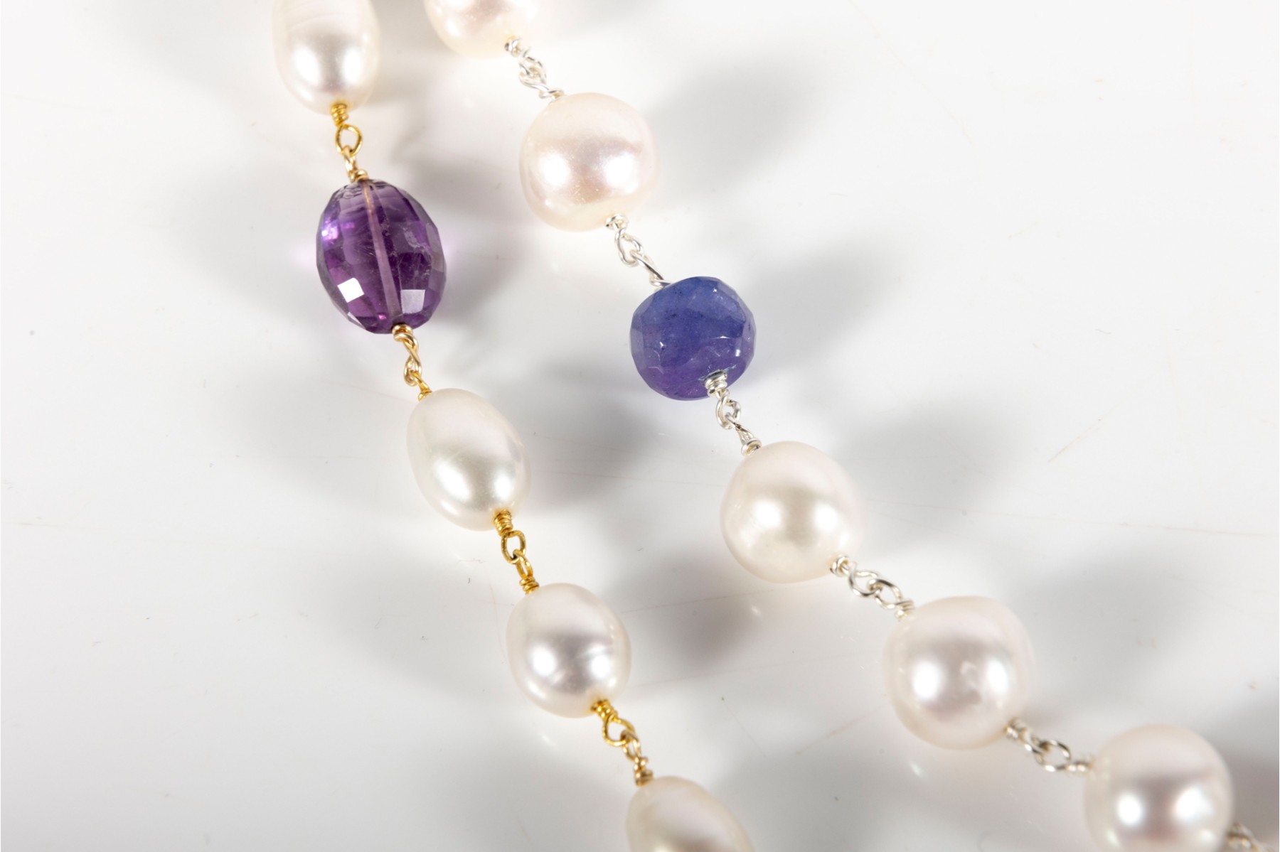 A delightful duo of sterling silver necklaces. The first sports egg-shaped white pearls spaced between faceted bun-shaped iolites. The second displays oval, subtly ringed white pearls with amethyst spacers on a vermeil chain.