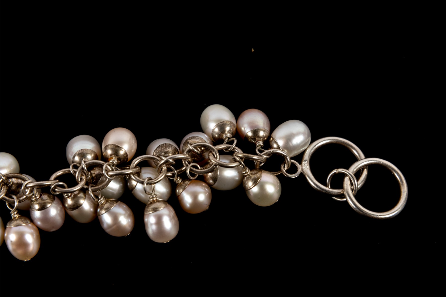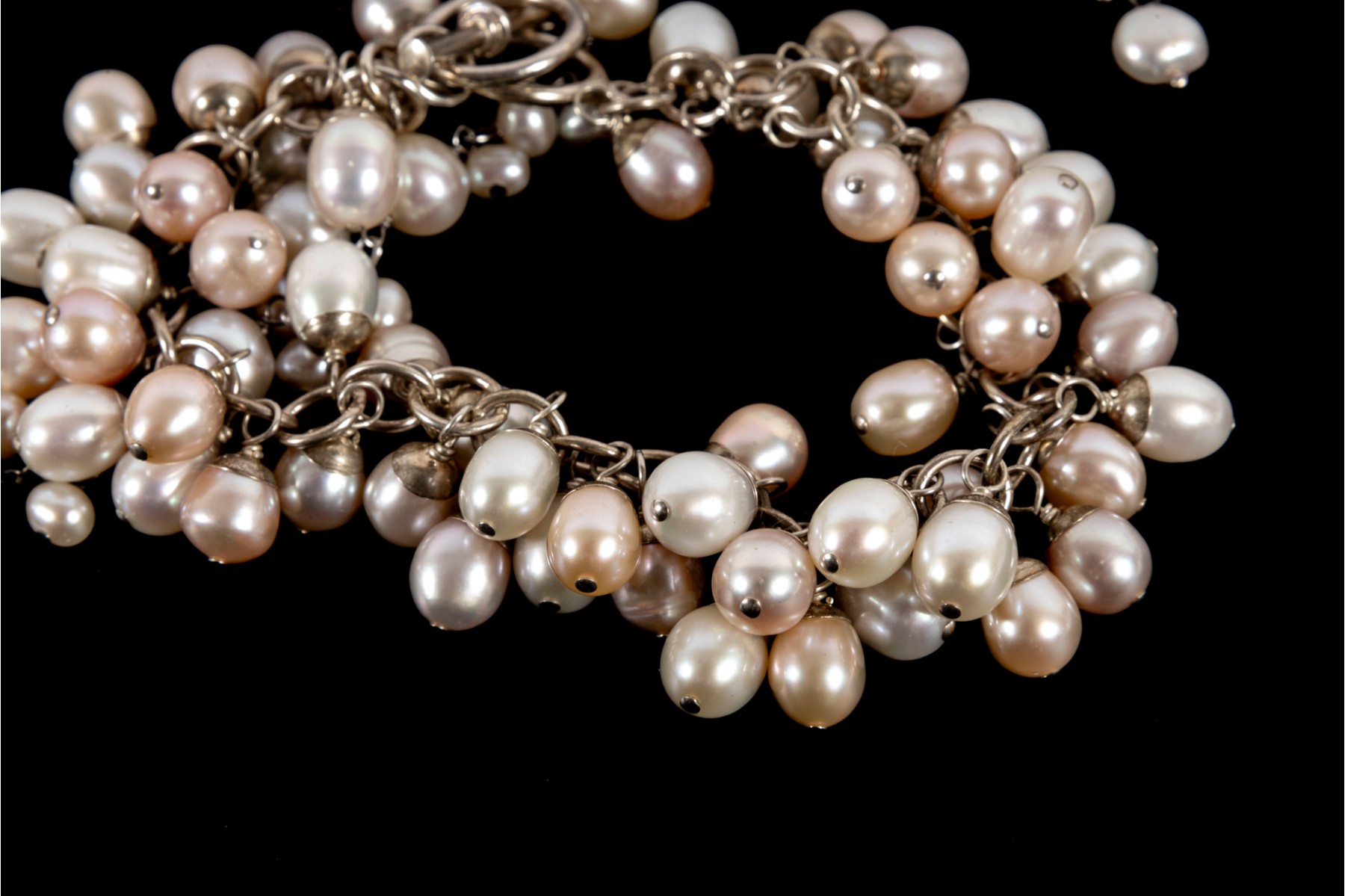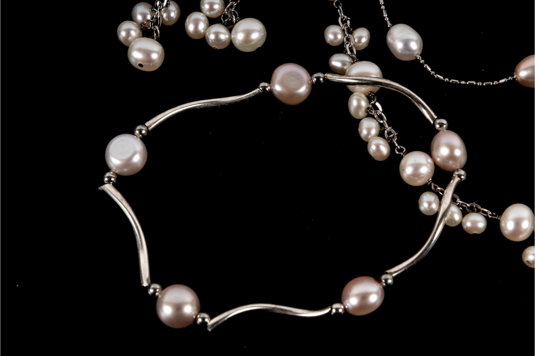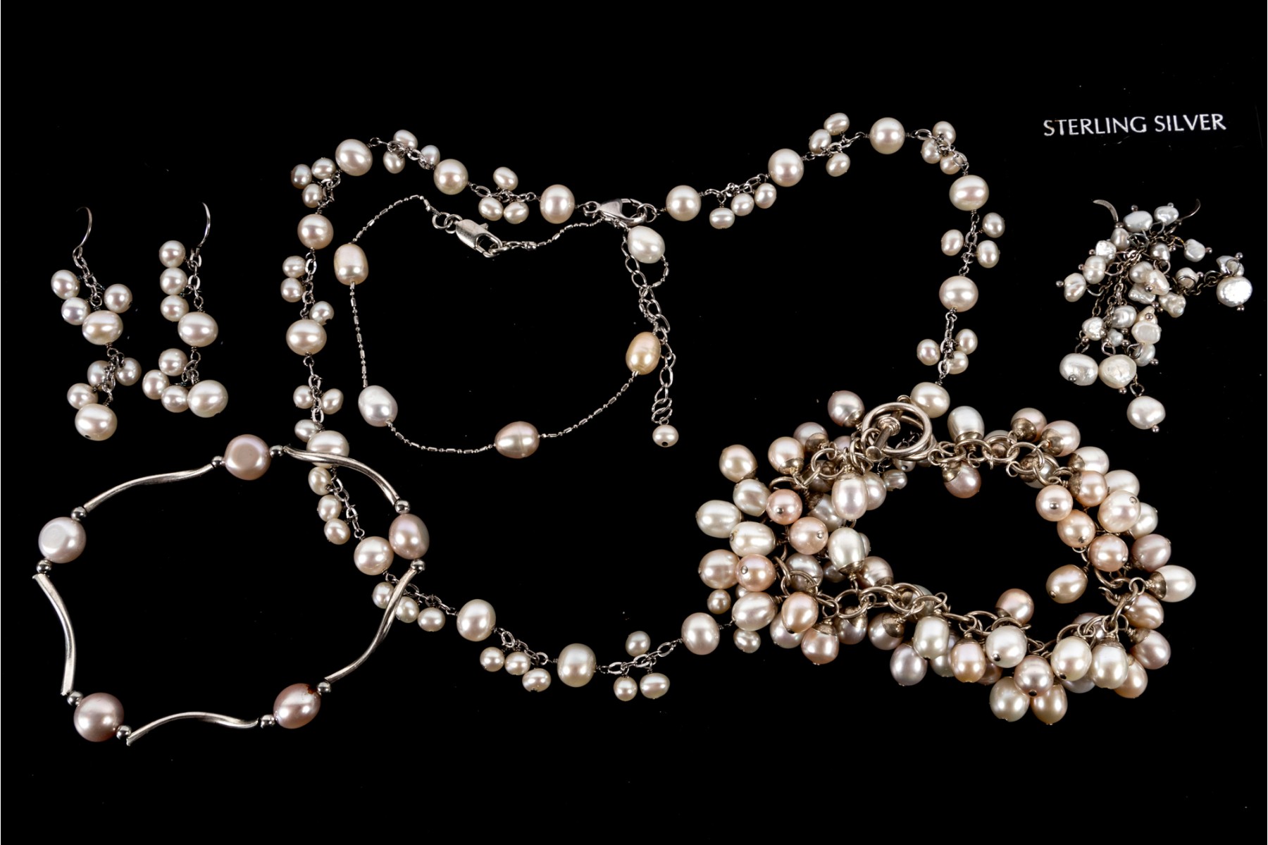 A wonderful collection of cultured pearl jewelry, mostly sterling silver. Includes a bracelet with a cluster of pear-shaped pearls in pink and white; two complimenting dangle earrings with clusters of white and pale gray pearls; a necklace with alternating larger and smaller clusters of off-white oval pearls; and two bracelets with minimalist designs.