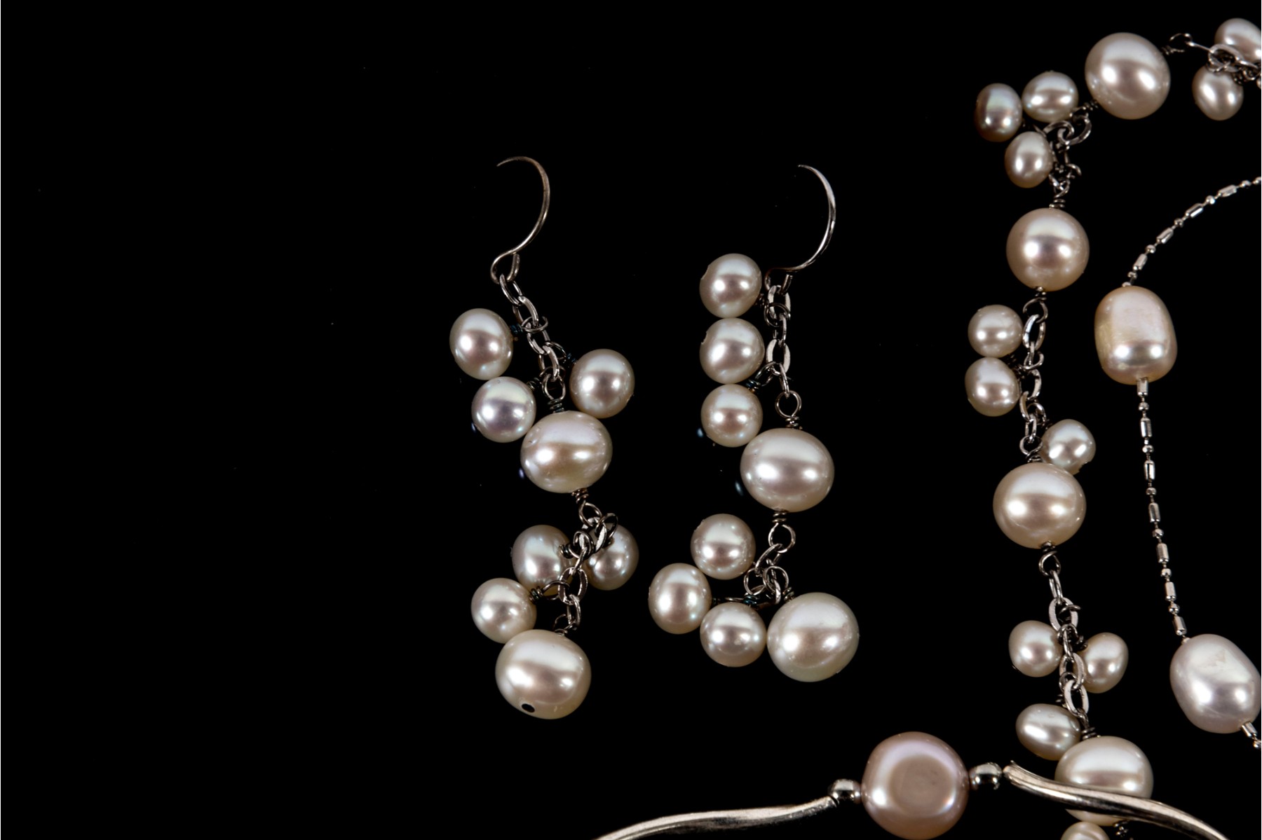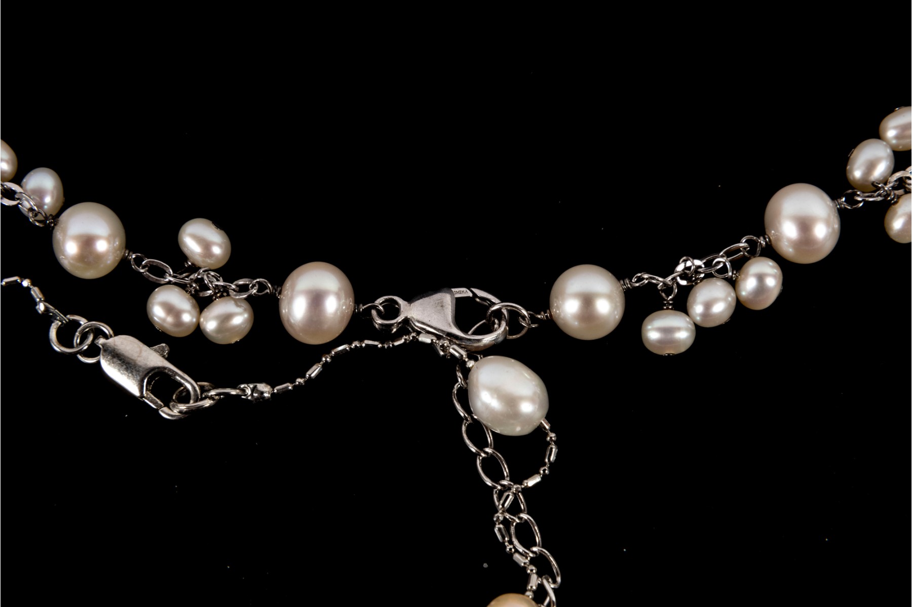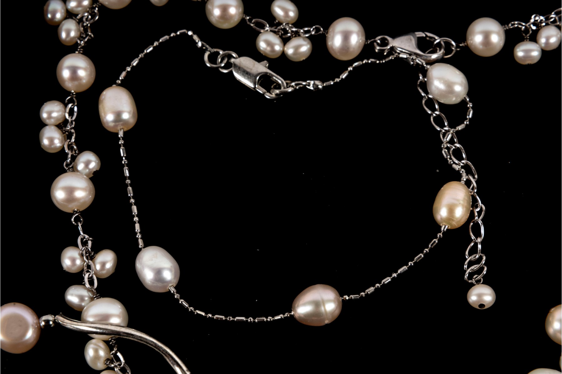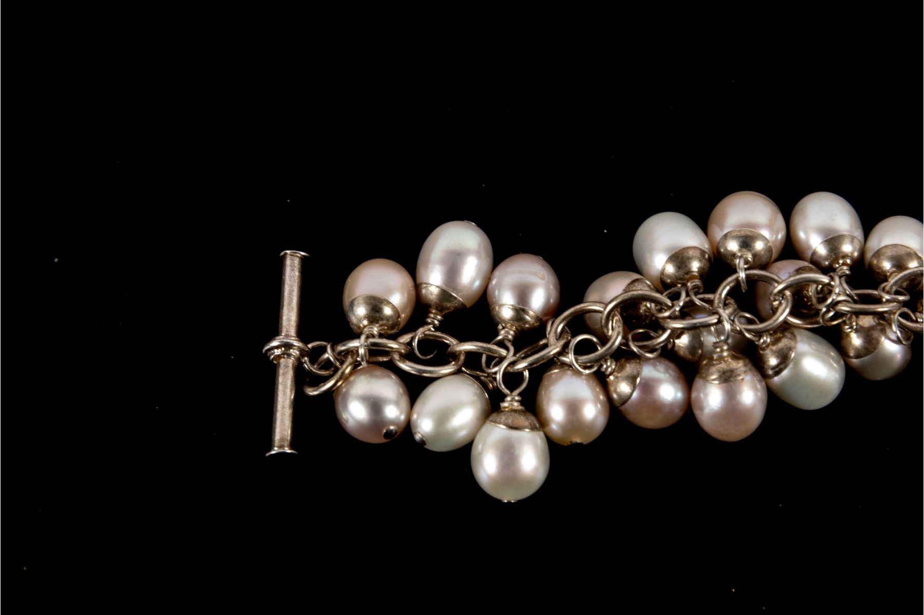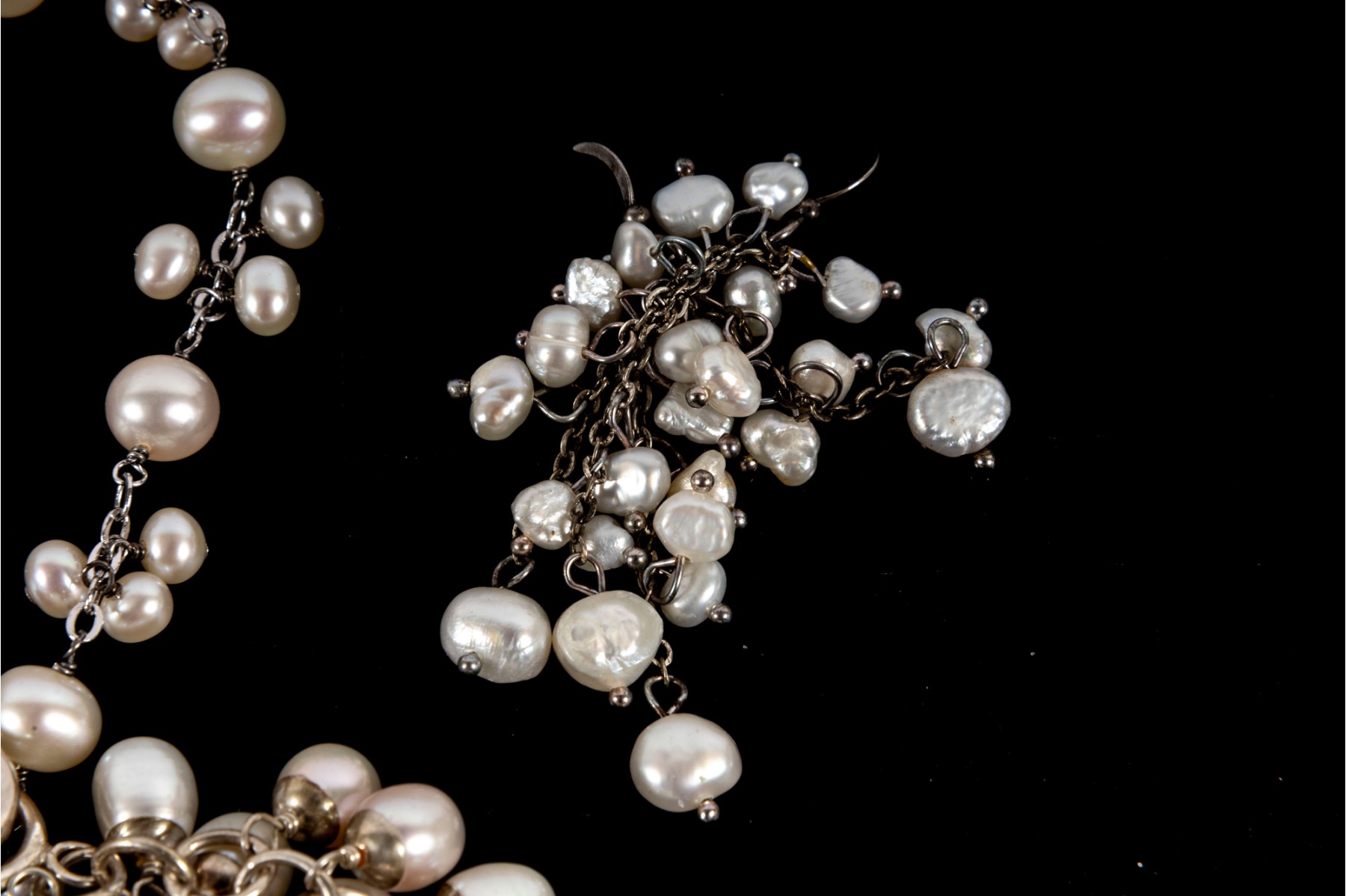 A wonderful collection of cultured pearl jewelry, mostly sterling silver. Includes a bracelet with a cluster of pear-shaped pearls in pink and white; two complimenting dangle earrings with clusters of white and pale gray pearls; a necklace with alternating larger and smaller clusters of off-white oval pearls; and two bracelets with minimalist designs.