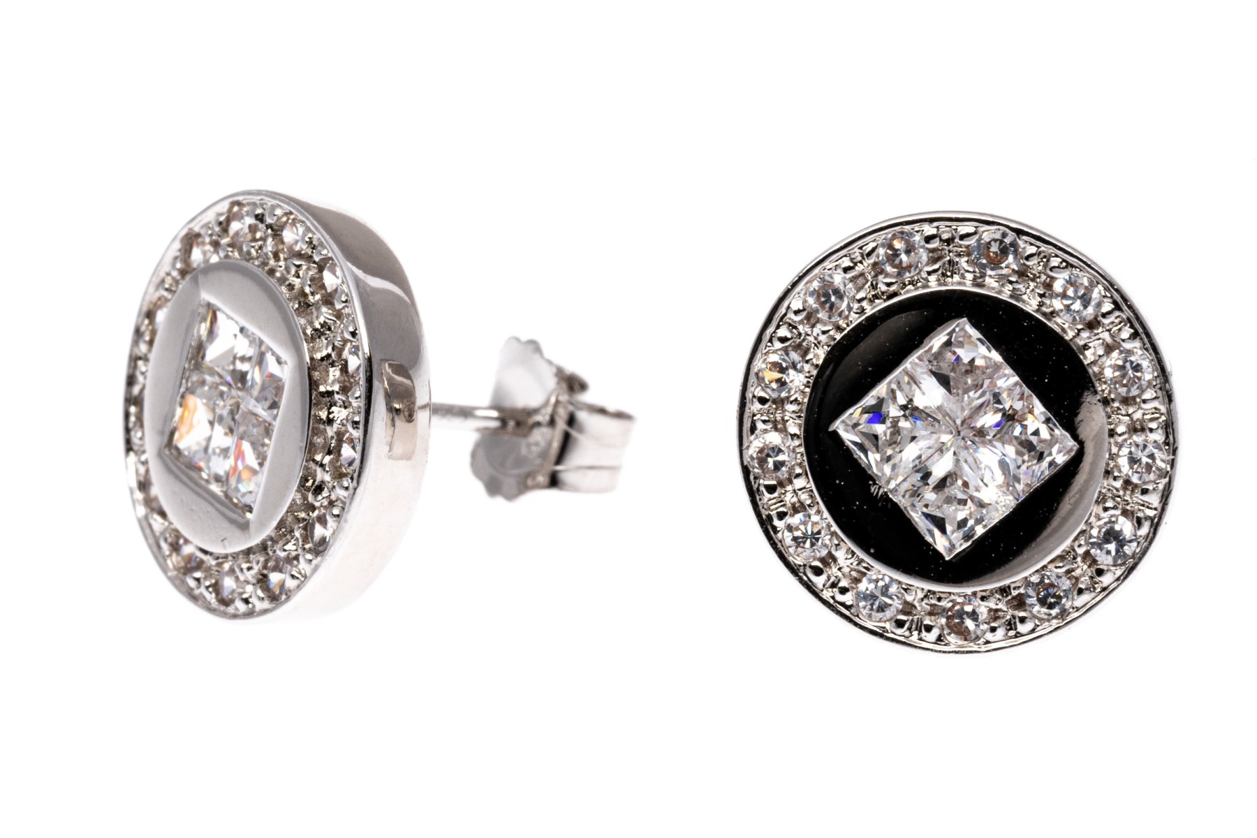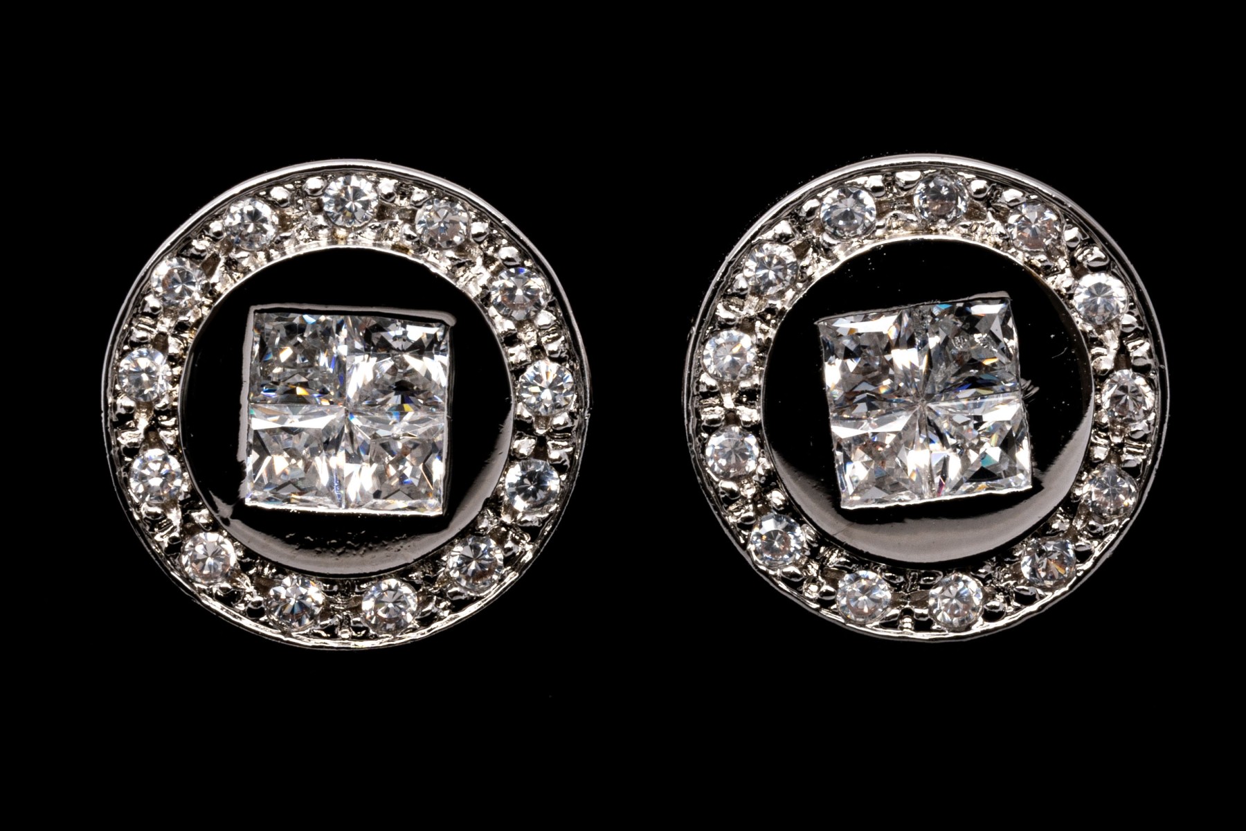 Sterling silver earrings. These beautiful and distinctive earrings are a high polished, flat button style, set with a center of flush set, princess cut brilliant cz stones. Surrounding the center is a trim border, set with round brilliant cut cz stones, prong set. The earrings have posts with clutch style backs.