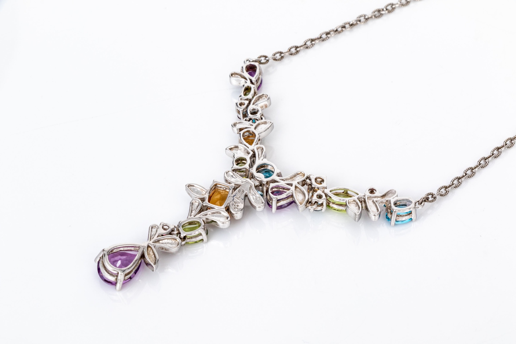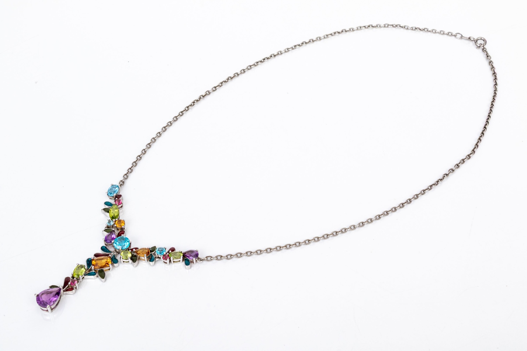This fabulous sterling silver "Y" necklace features a foliate of teal, green and red enamels, interspersed with multi shaped and multi colored gemstones, including: amethysts, app. 2.00 TCW, blue topaz, app. 1.64 TCW, citrine, app. 1.04 TCW, peridots, app. 1.09 TCW, and rhodolite garnets, app. 0.31 TCW, all prong set. The foliate and stones are displayed on a textured, curb Link chain and finished with a spring ring style clasp.