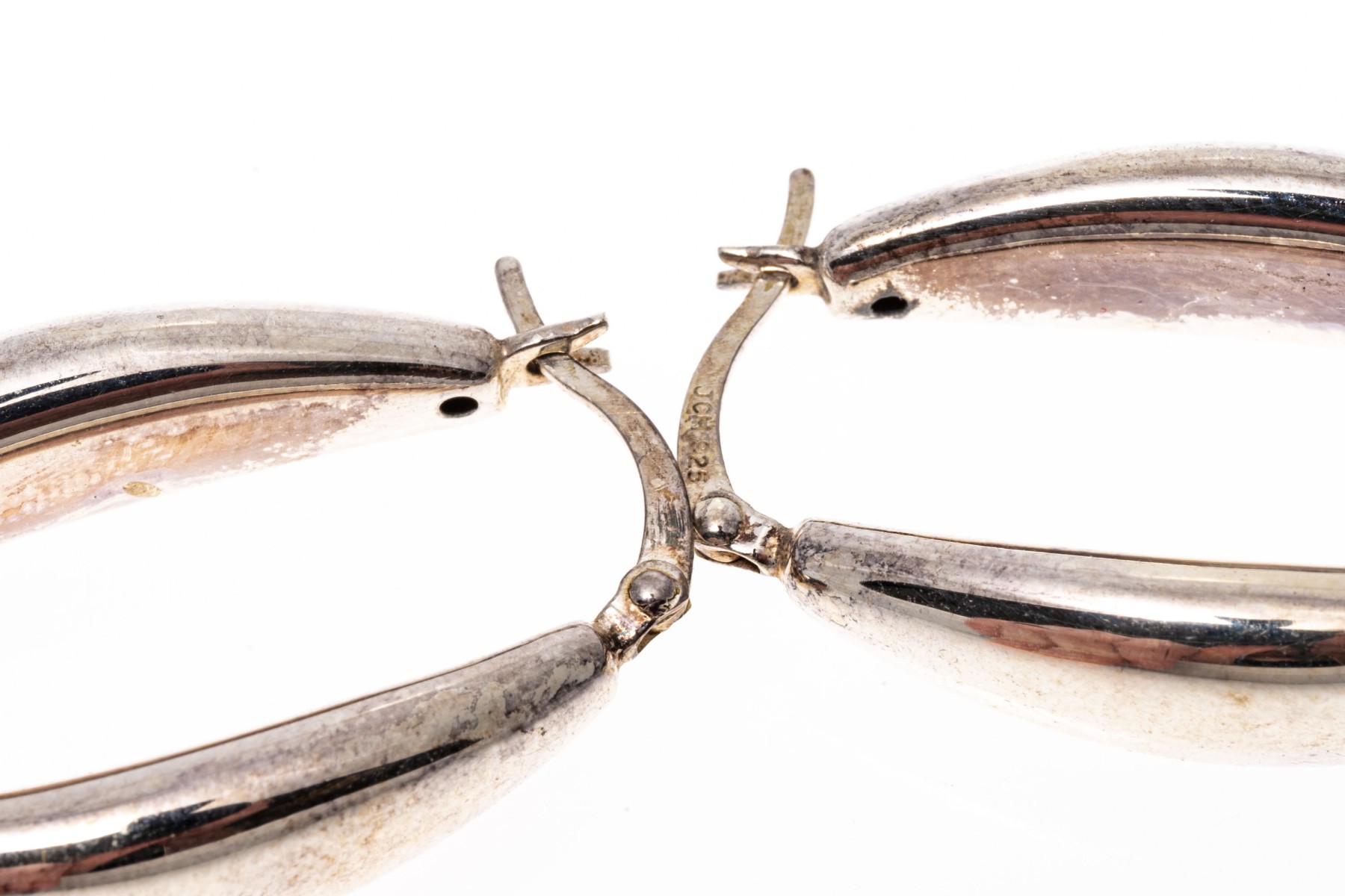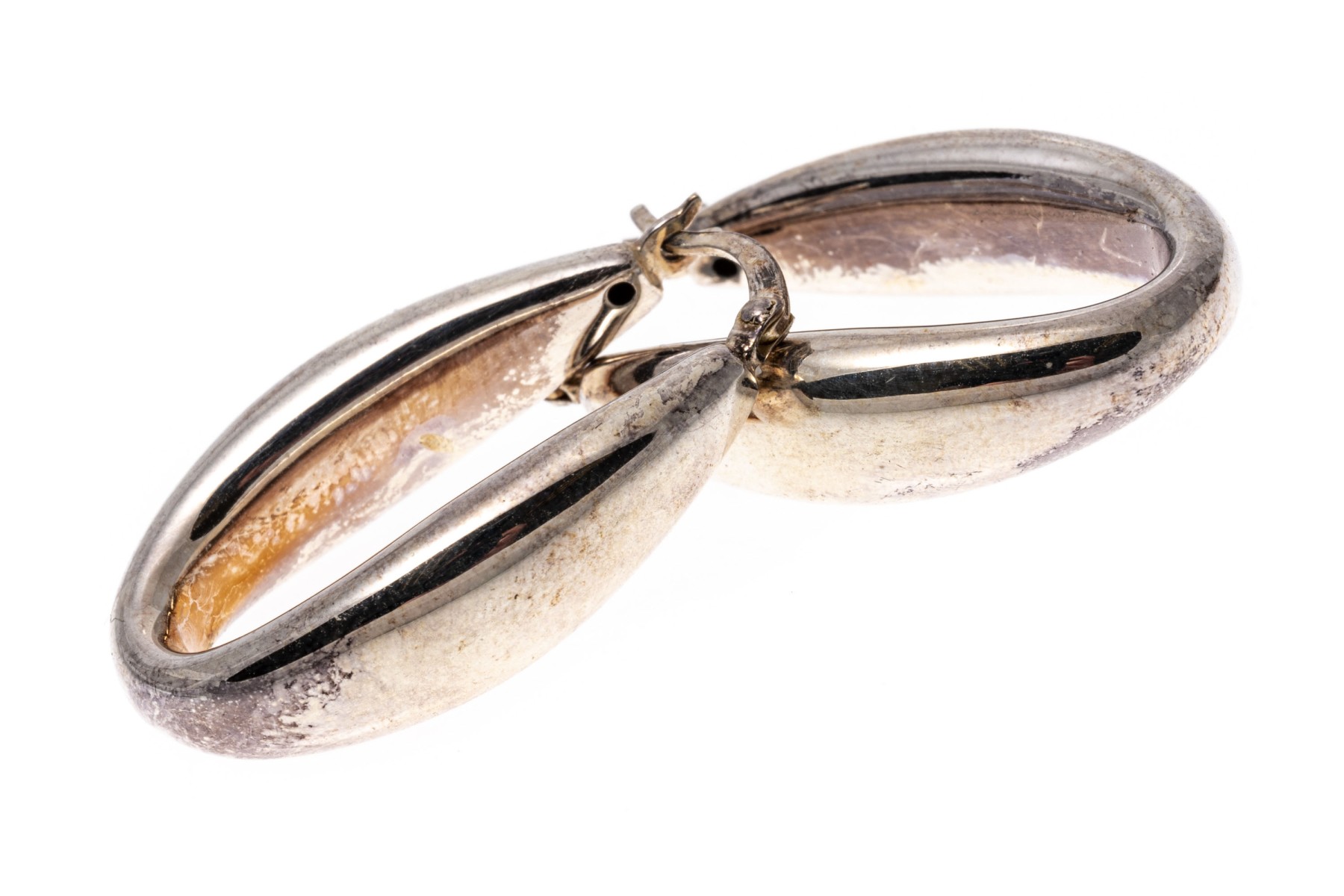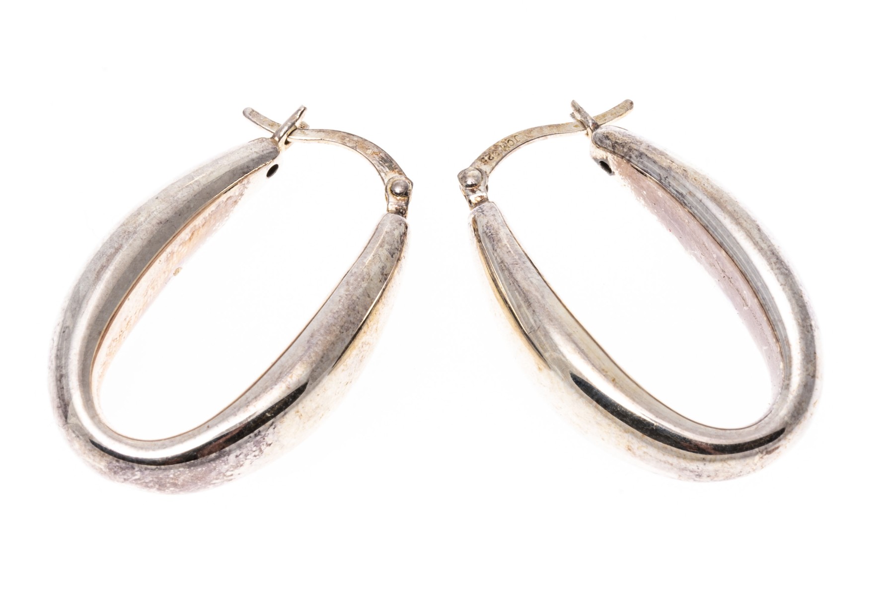 Sterling silver earrings. These fabulous contemporary earrings are an elongated, oval electroform style with a high polished finish. The earrings have hinged posts with "u" style closures.