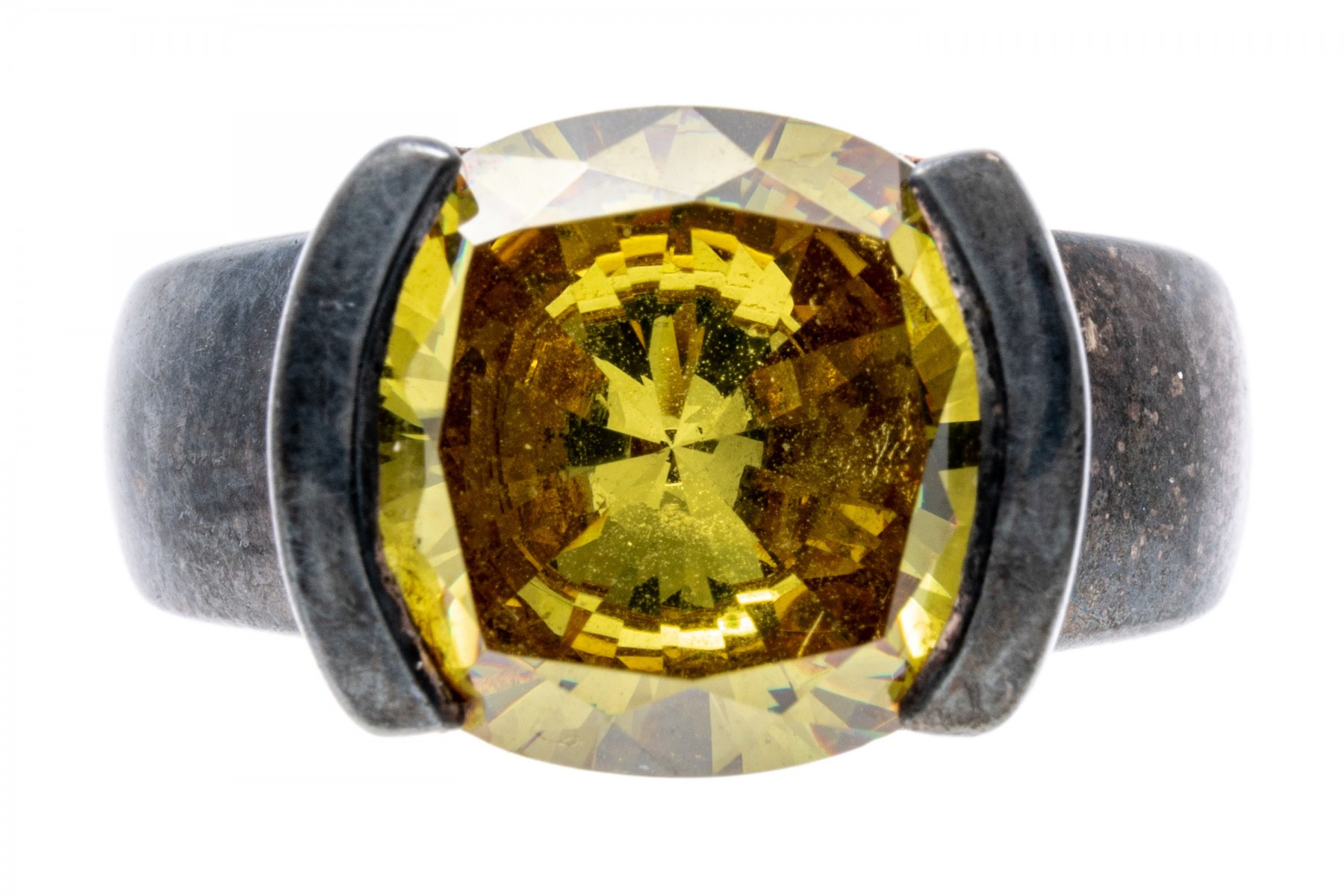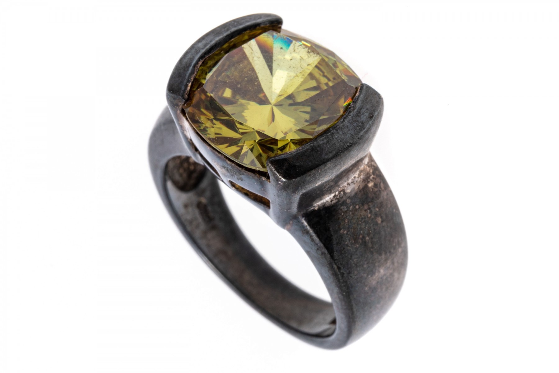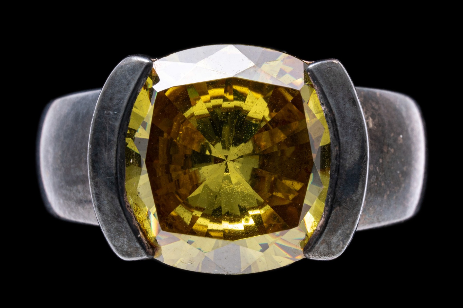 Sterling silver ring. This fabulous sterling silver ring is a contemporary wide style, set in the center with a scintillating cushion cut yellow cz, half bezel set and finished with wide shoulders.
