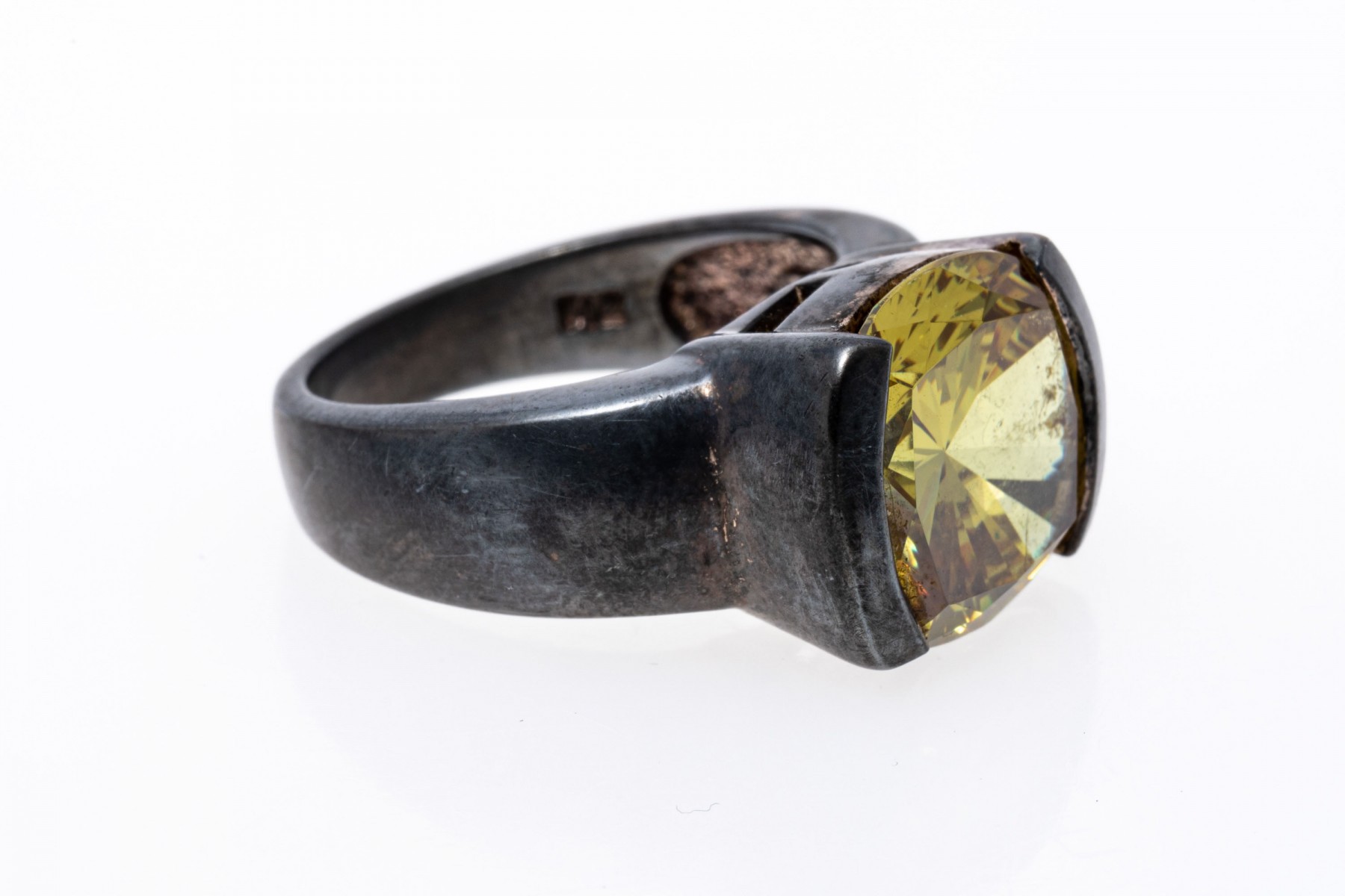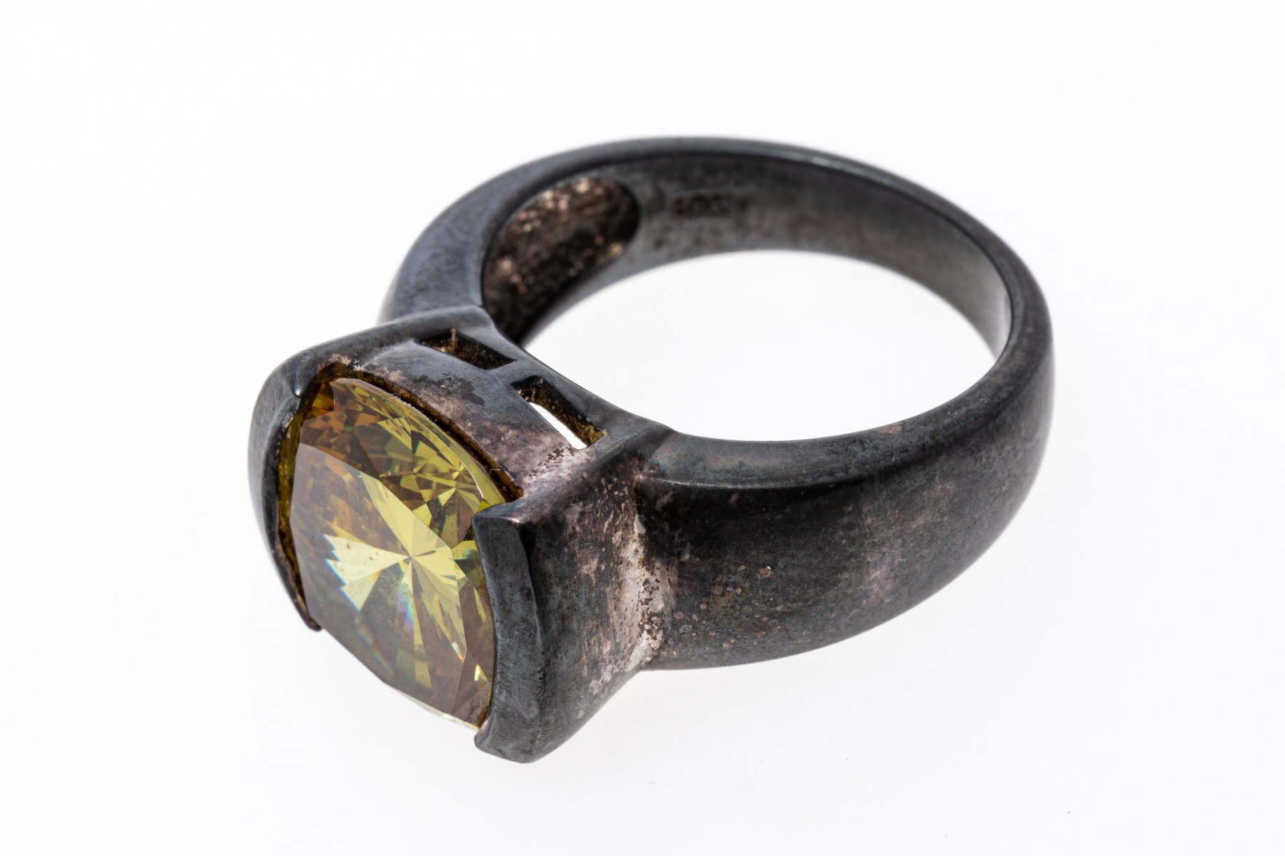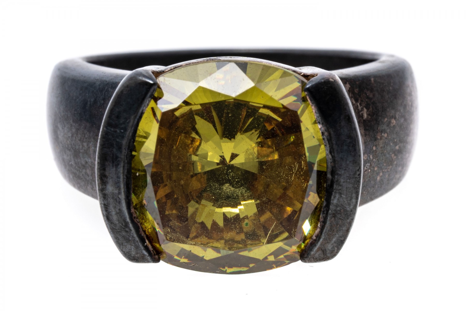 Sterling silver ring. This fabulous sterling silver ring is a contemporary wide style, set in the center with a scintillating cushion cut yellow cz, half bezel set and finished with wide shoulders.