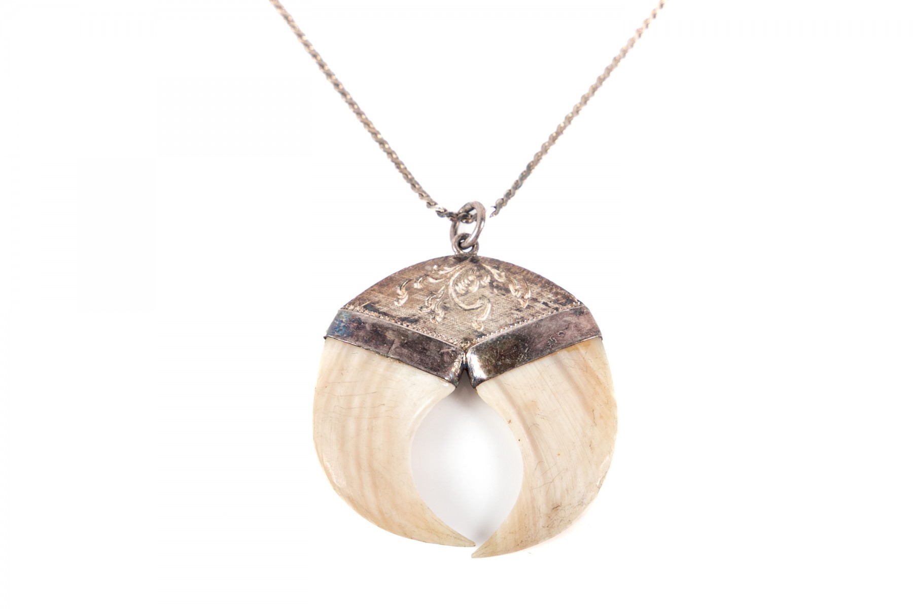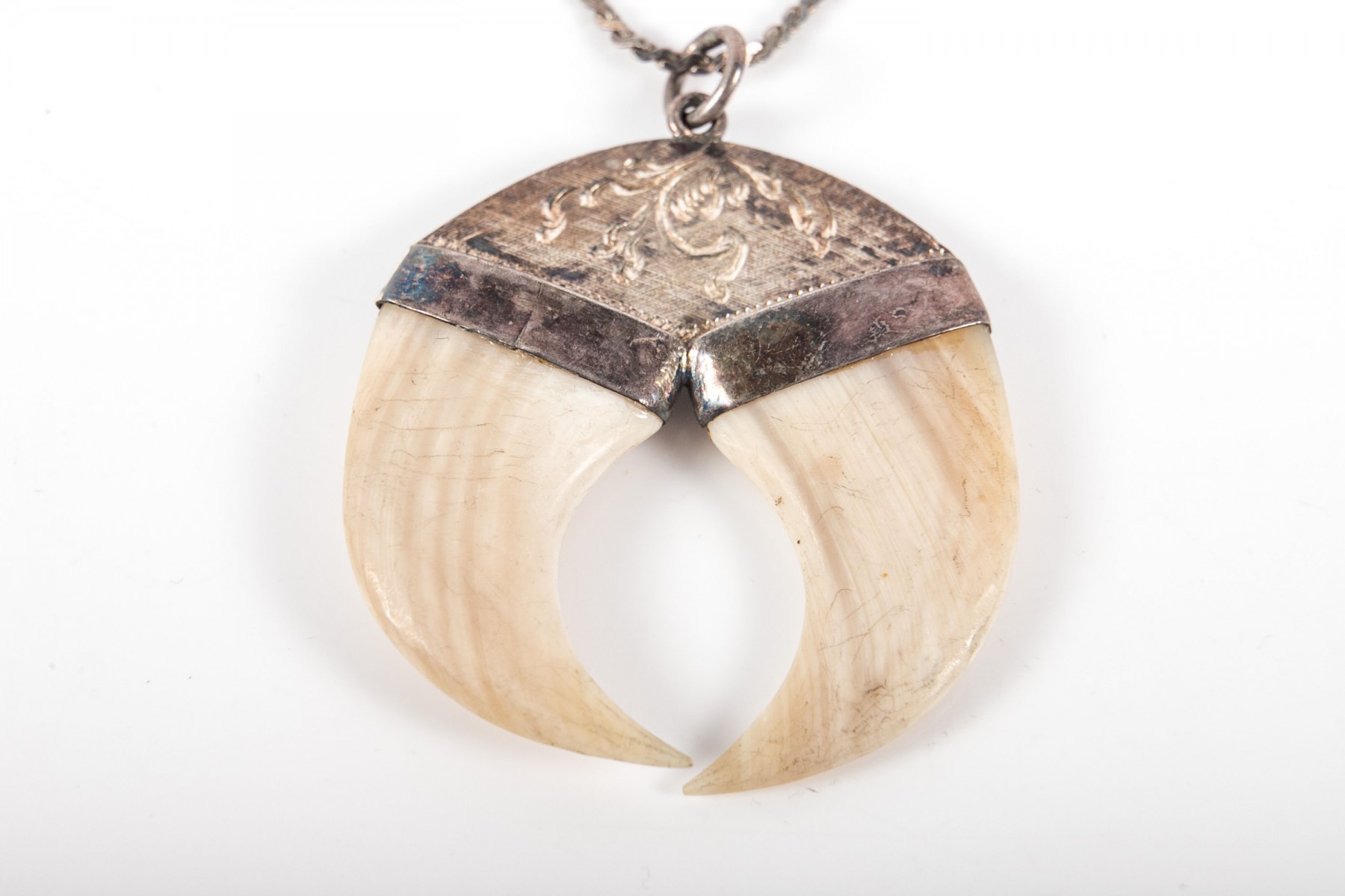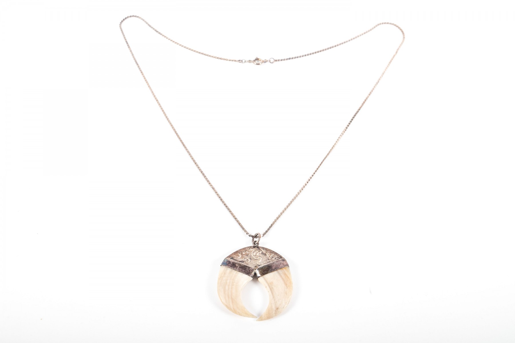 A sterling silver necklace displaying a fierce pendant with two claws meeting at the points to complete a circular form with bezel settings and a rounded top with etched designs leading to a simple circular bail on a serpentine chain.
