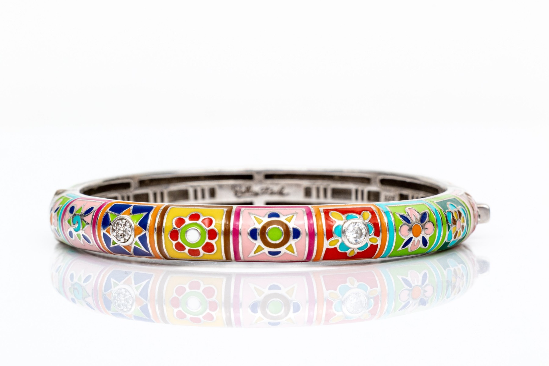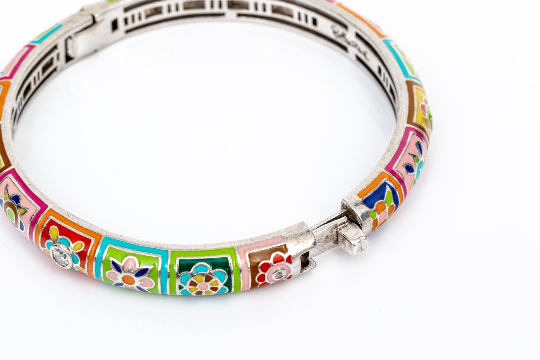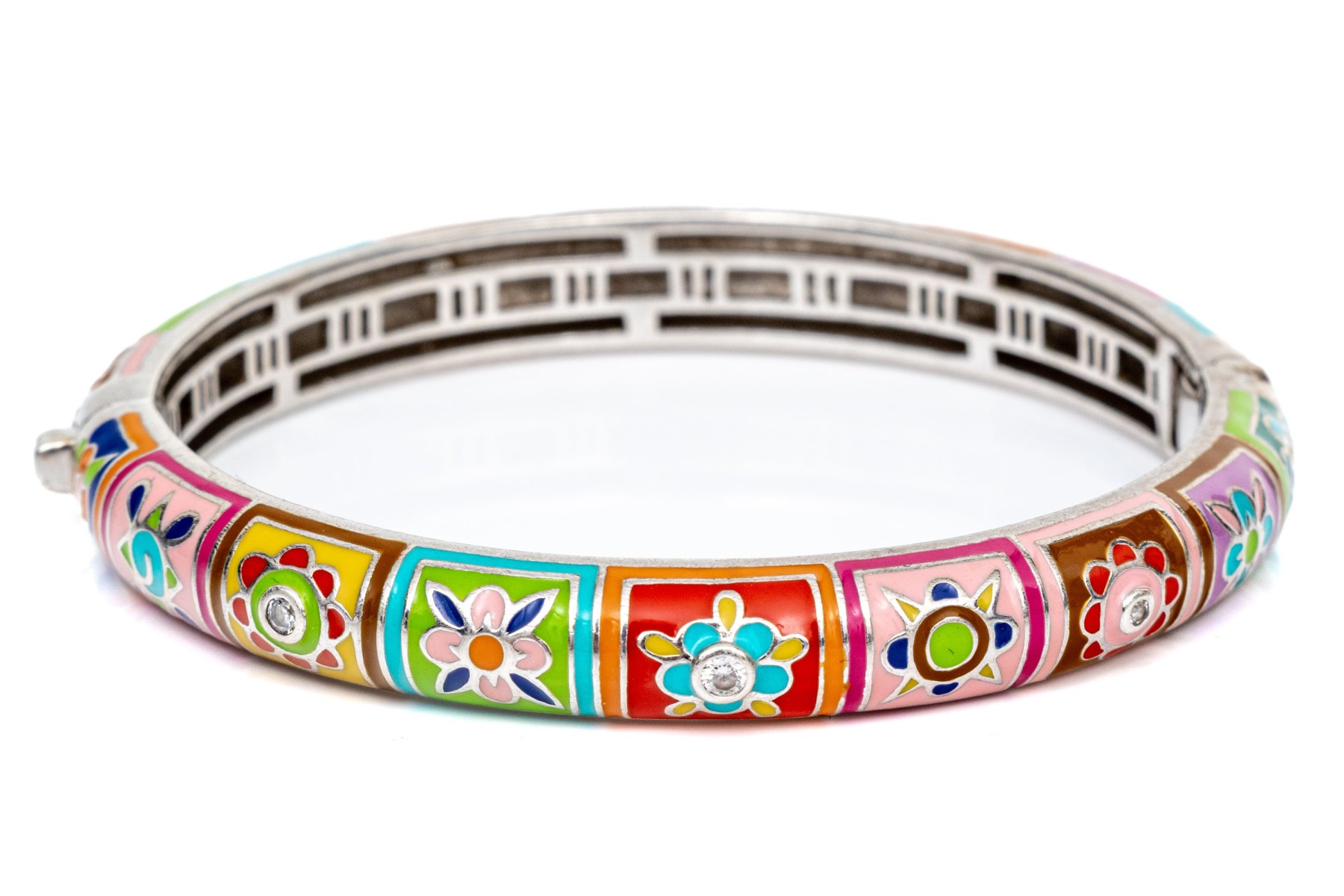 Sterling silver fun colorful enamel floral hinged bangle bracelet, please see note