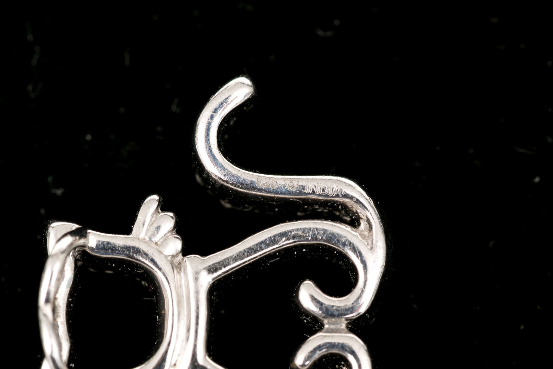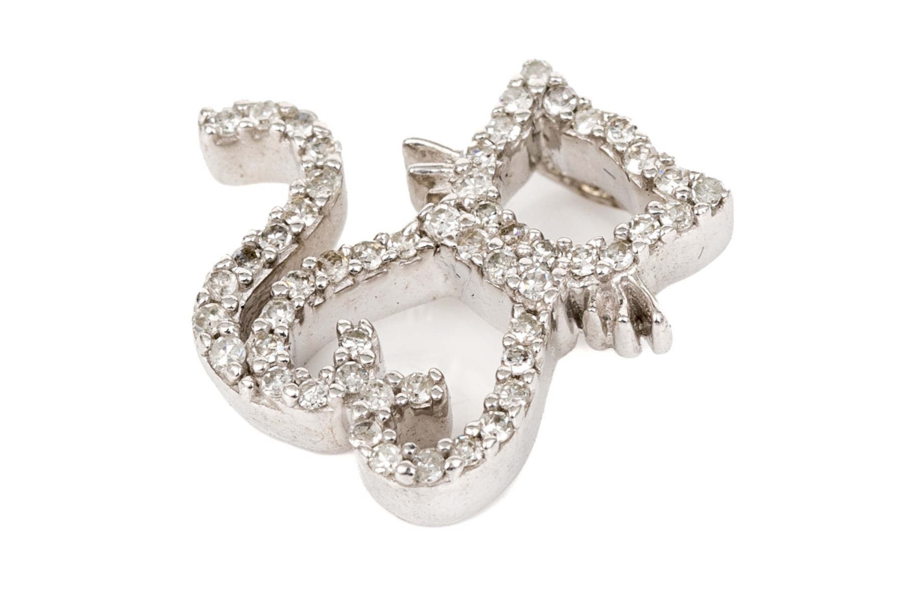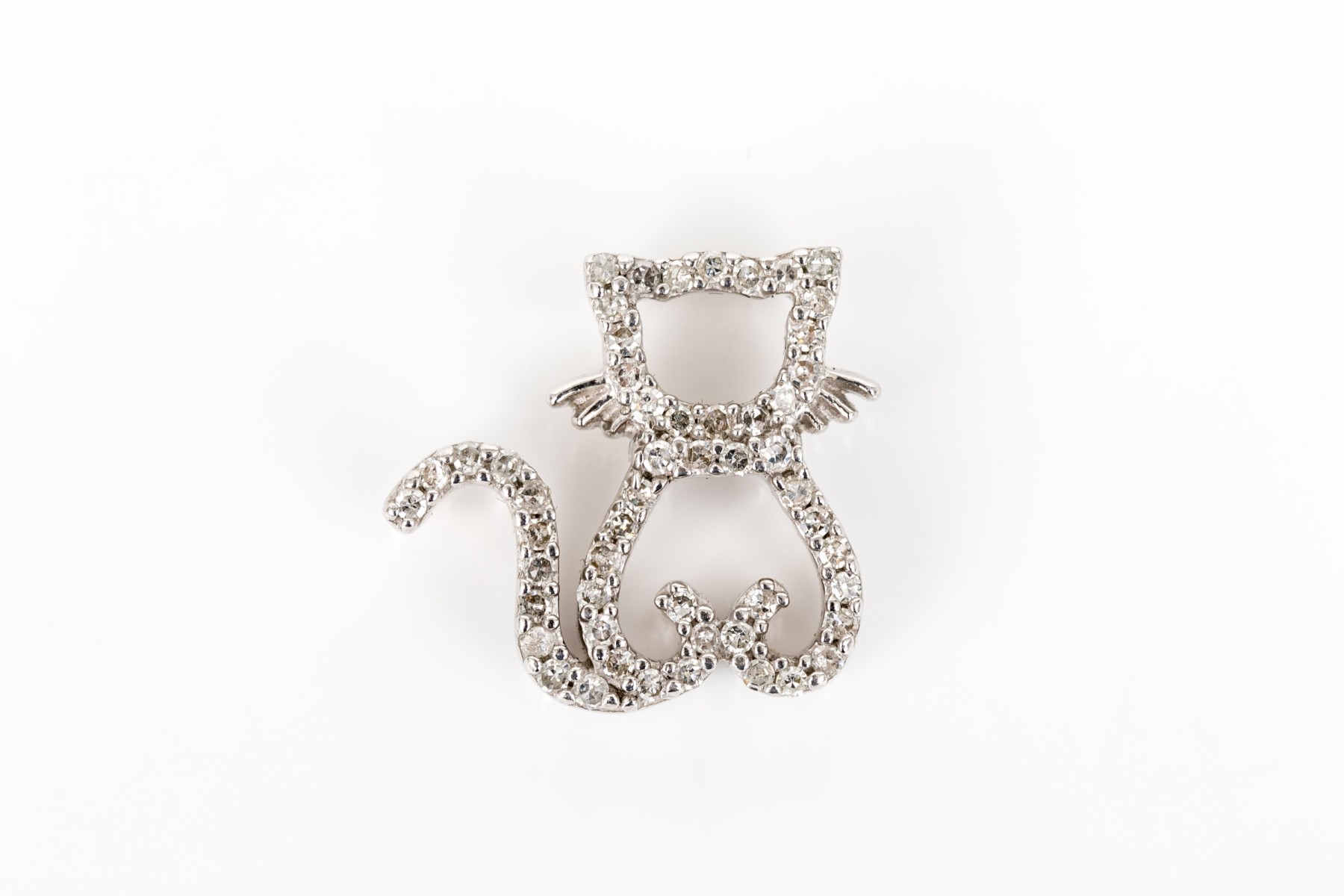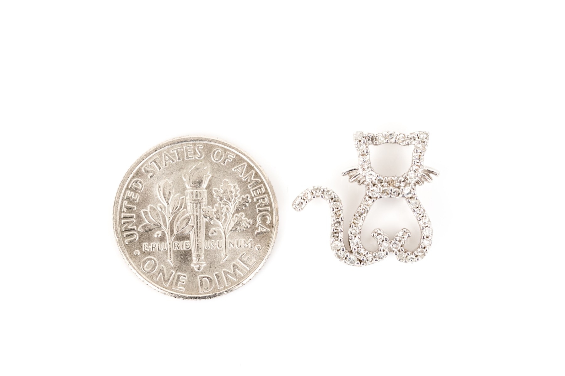 Sterling silver fun diamond set sitting cat silhouette pendant, app. 0.12 TCW. The diamonds are I1, J color. The pendant is finished with a hidden bale