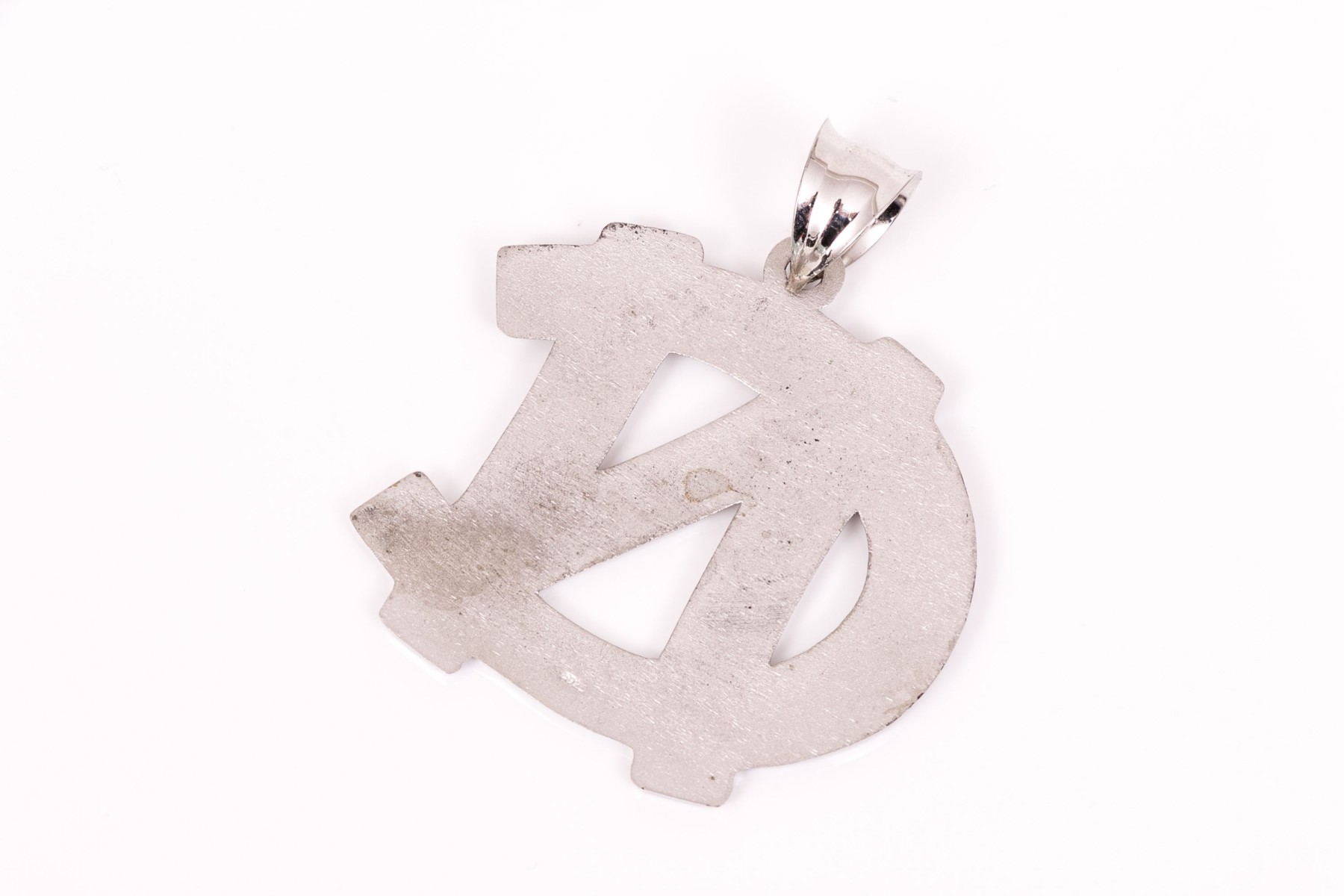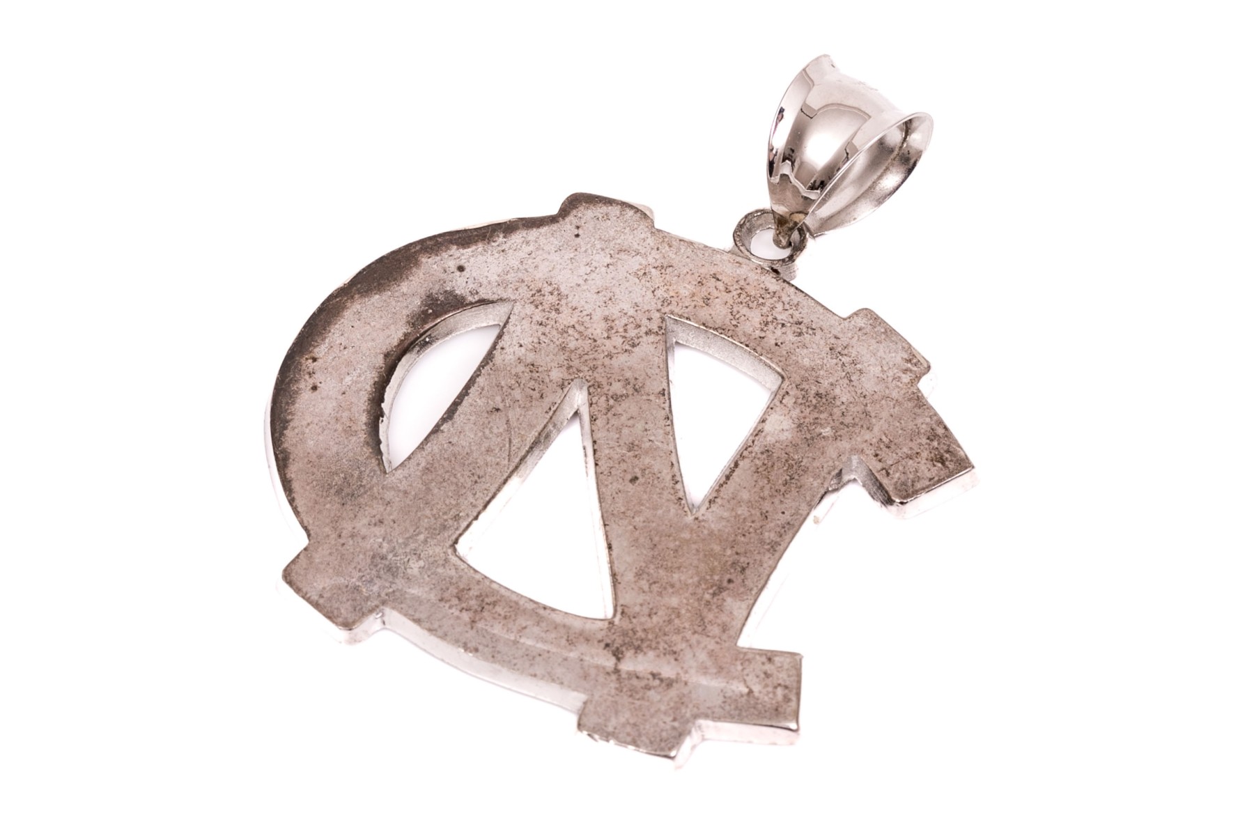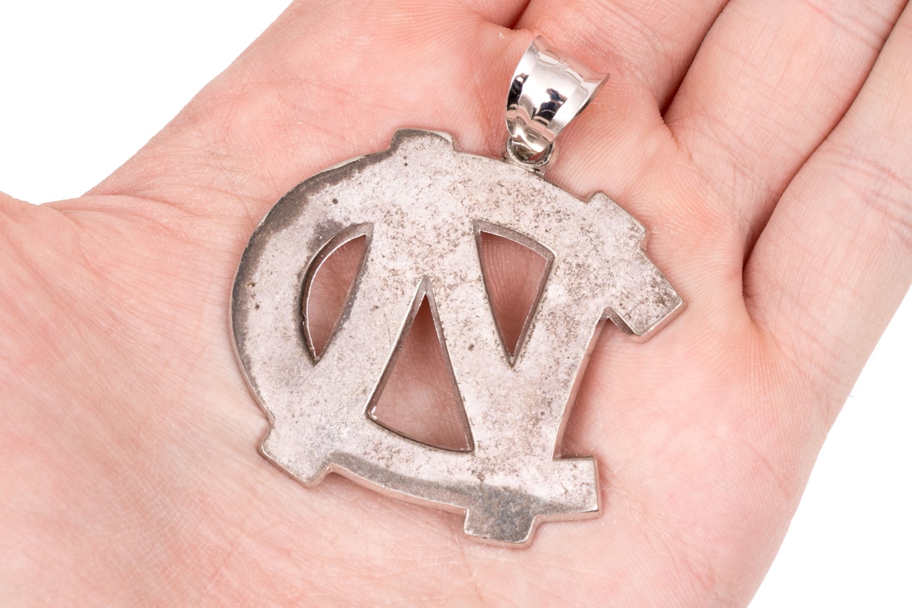 Sterling silver fun large North Carolina logo pendant, finished with a solid bale