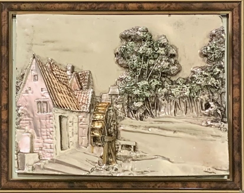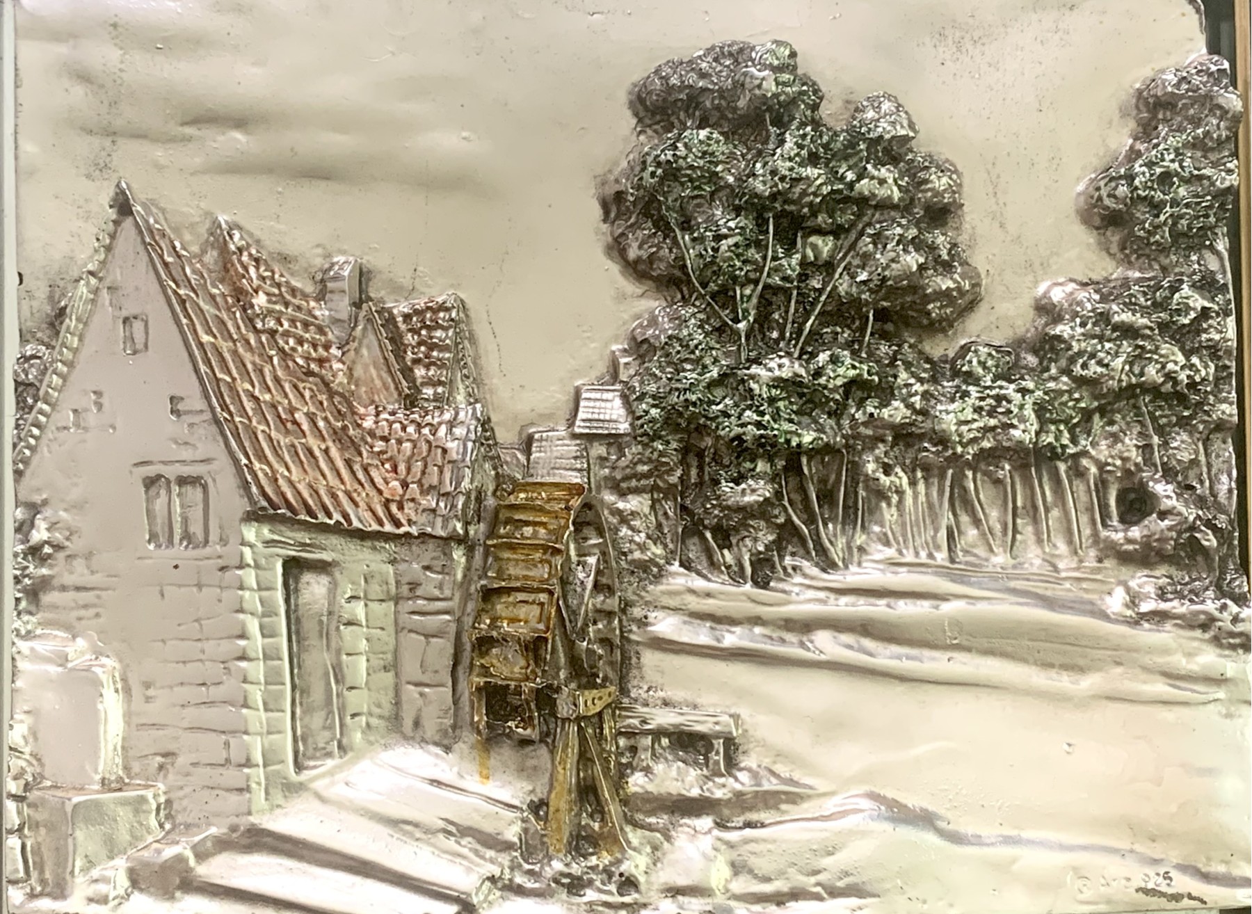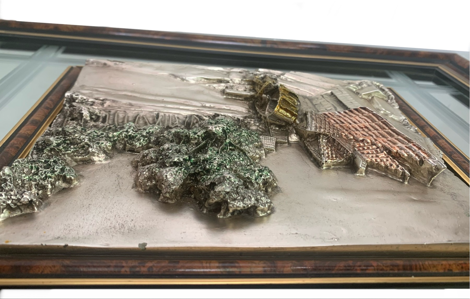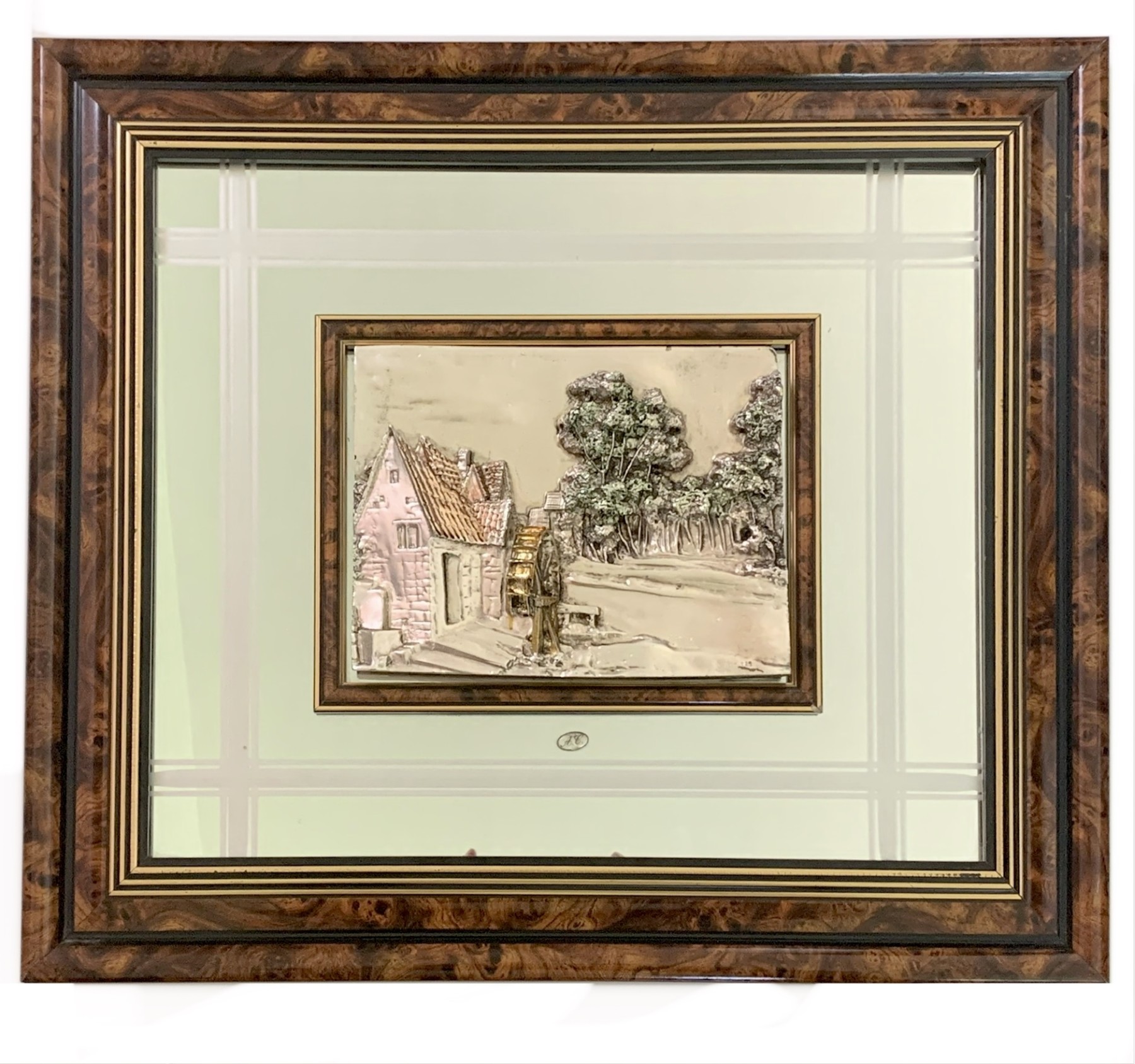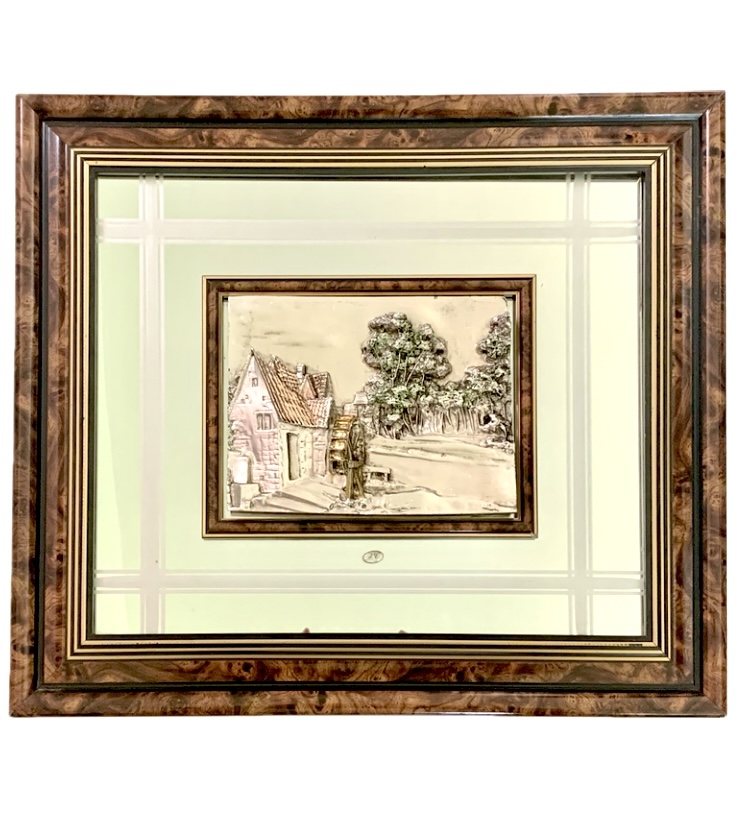 High relief sterling silver 3D framed silver Italian artwork with mill and trees.