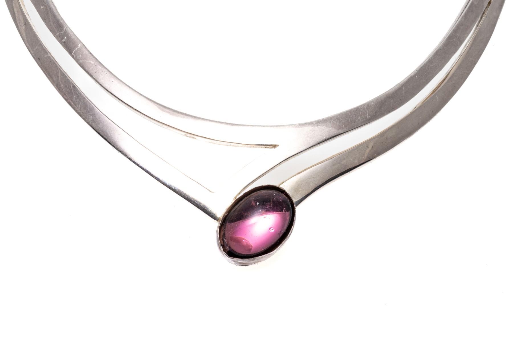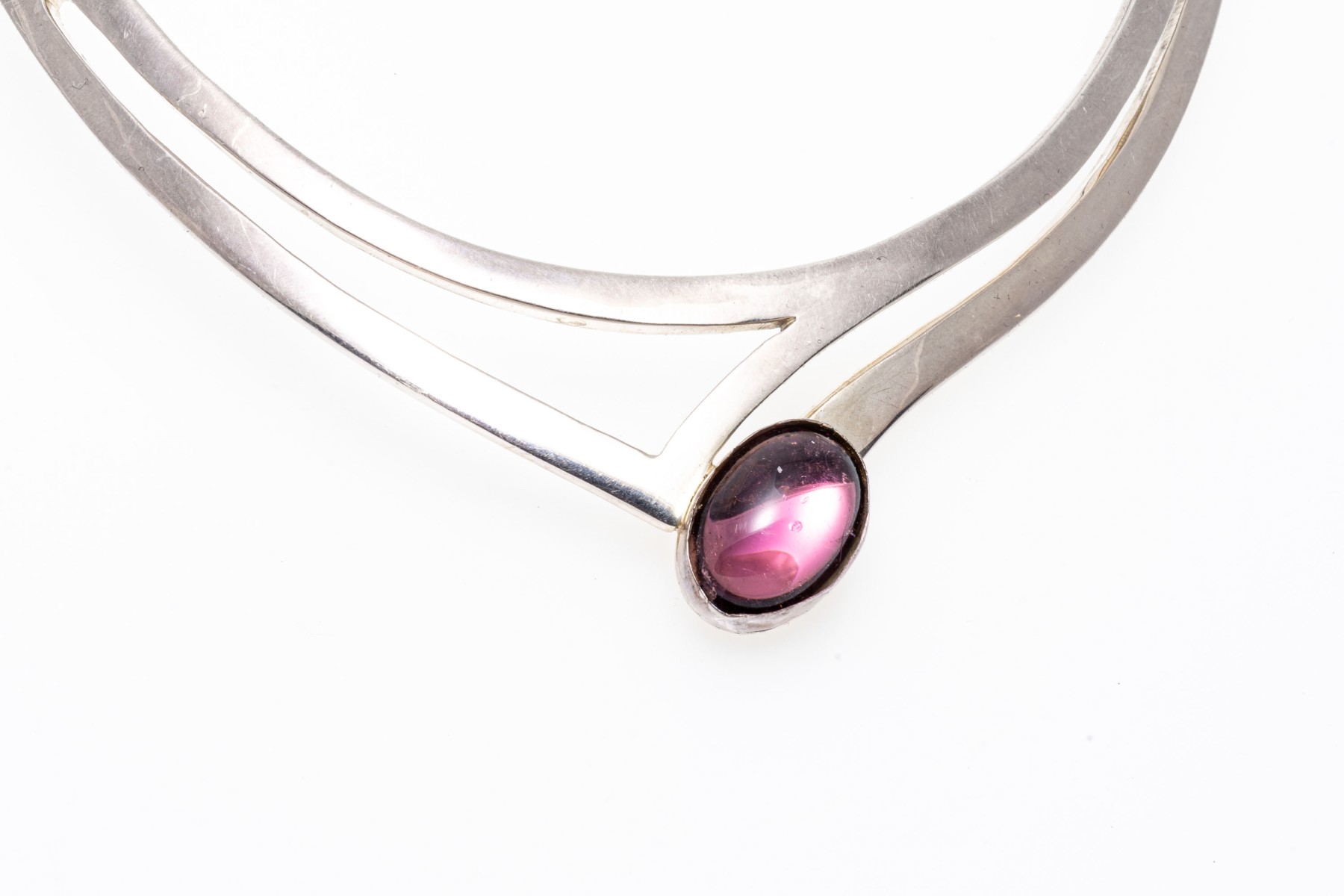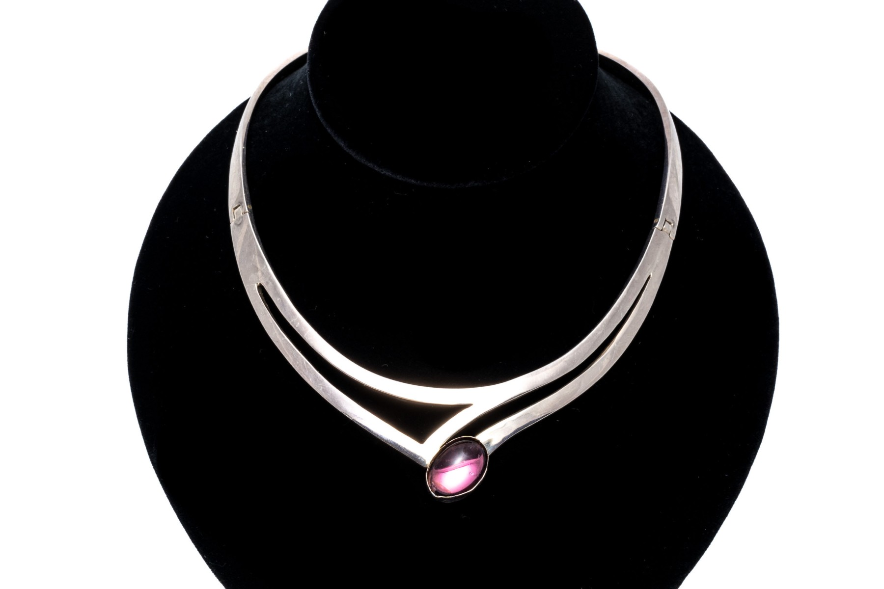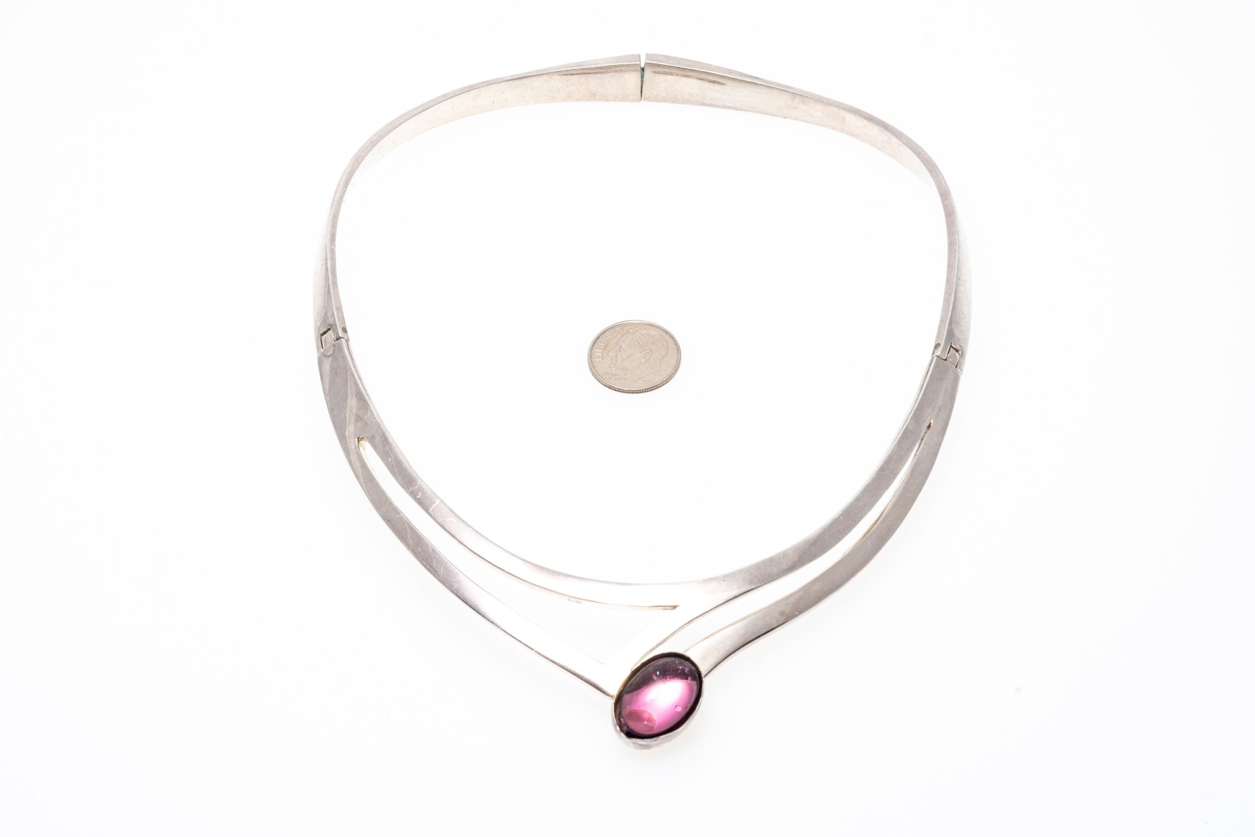 Sterling silver impactful pierced contemporary neckpiece, enhanced with a faux pink purple stone. The necklace is finished by a button style clasp