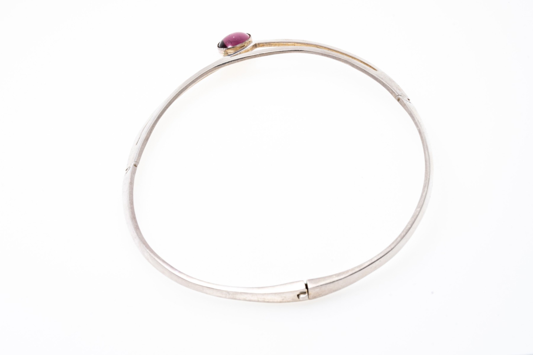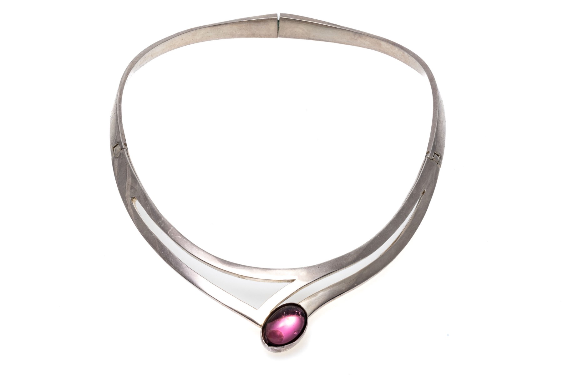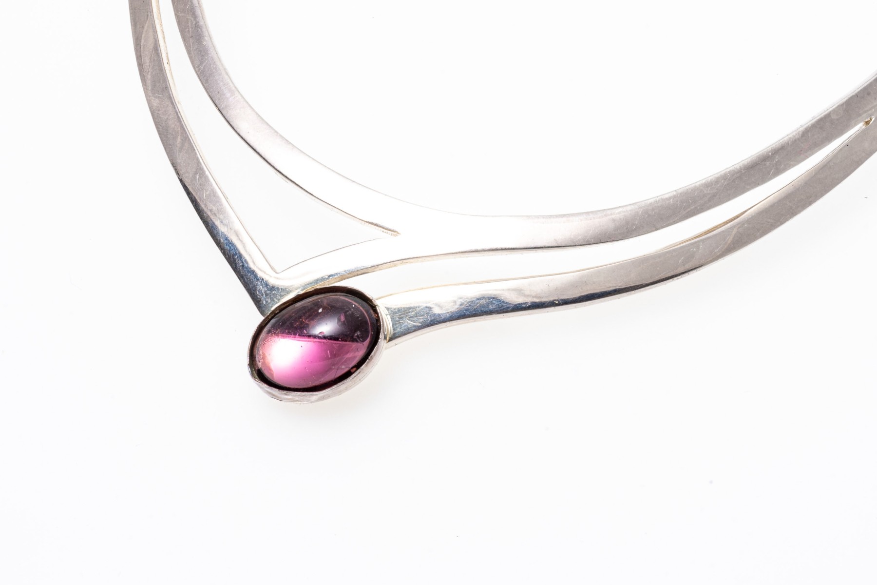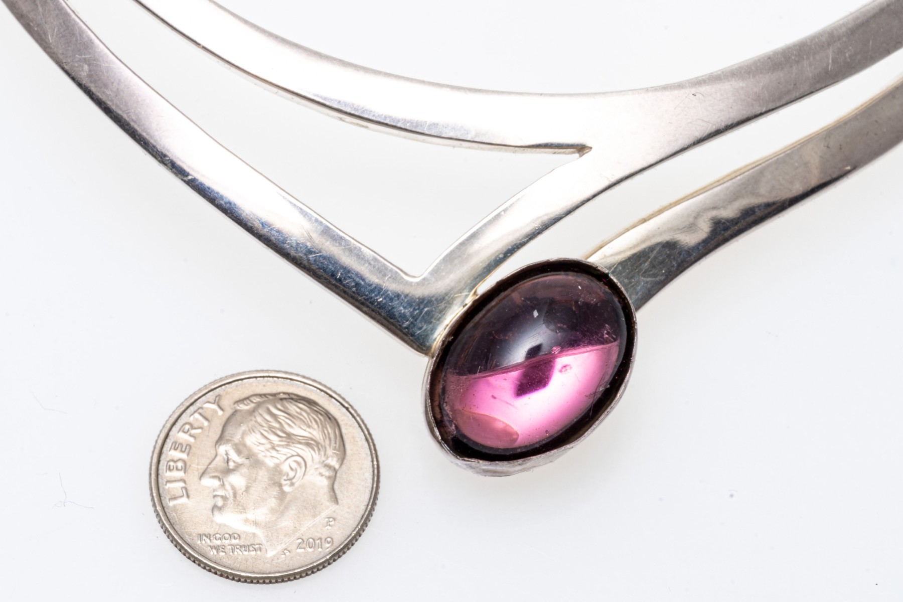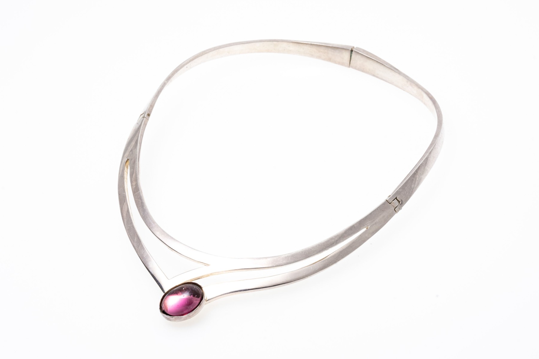 Sterling silver impactful pierced contemporary neckpiece, enhanced with a faux pink purple stone. The necklace is finished by a button style clasp