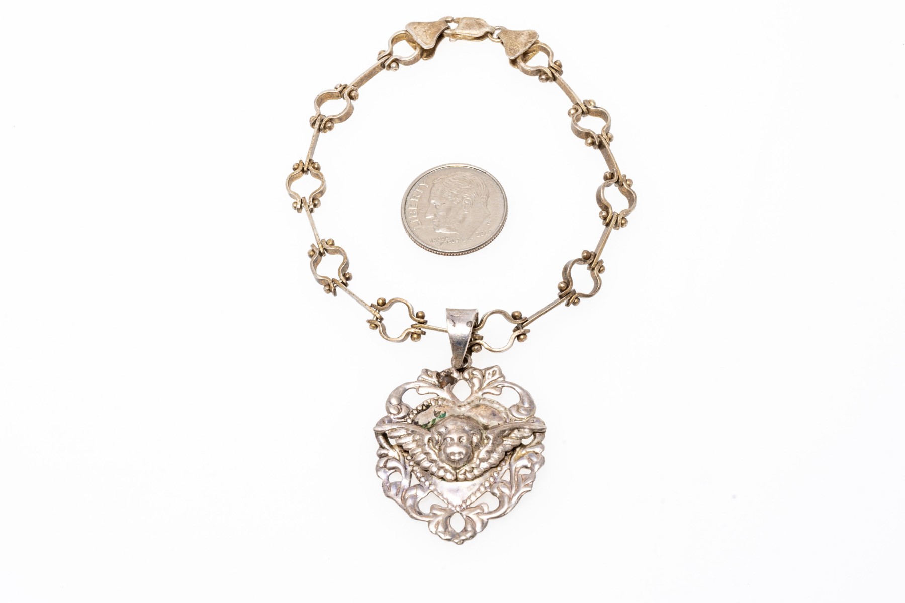 Sterling Silver Interesting Bar And Circle Bracelet With A Heart And Cherub Charm #310025. Black Rock Galleries provides high end estate liquidation services through online estate auctions and a 50,000 sq ft designer showroom. estate liquidator, estate sale, online auction, antiques, fine art, liquidation, clean outs, auction, consignment, interior design, fine jewelry, collectibles, appraisals, estate appraisals, estate services, decor, furniture, furniture consignment, antique center, consignment shop. We offer appraisal services and specialize in fine art, jewelry, antiques and decorative arts. Sell with us. Black Rock Galleries is the tri-state's largest estate liquidator serving New England and the greater New York City area. We are the trusted source for expert appraisals, auction services, estate sales, and consignments. Black Rock Galleries is the east coast's largest and most trusted estate liquidator, with locations in Connecticut, greater Boston, MA and Raleigh, NC, Fairfield, Southport, Apex, TX. We are the best source for expert appraisals, auction services, estate sales and consignments. We have served thousands of families and estates with compassion, professionalism and expertise. BRG works with attorneys, executors, realtors and families to bring the greatest return on personal and estate property in the current market. Our unique combination of services make us the easy choice to get the job done in a timely and stress-free manner. We are with you from the initial consultation to the final clean out. Our house-built online auction software platform offers clients a dynamic approach to liquidating their personal property. This venue is most successful in bringing the best return with the least amount of disruption for our clients. See our services page for a complete description of this offering. Sterling Silver Interesting Bar And Circle Bracelet With A Heart And Cherub Charm #310025