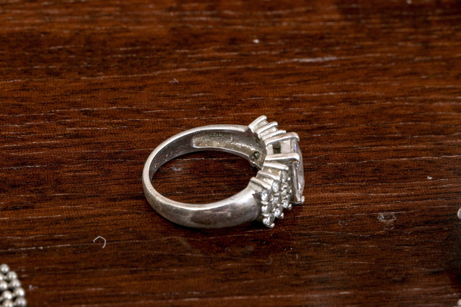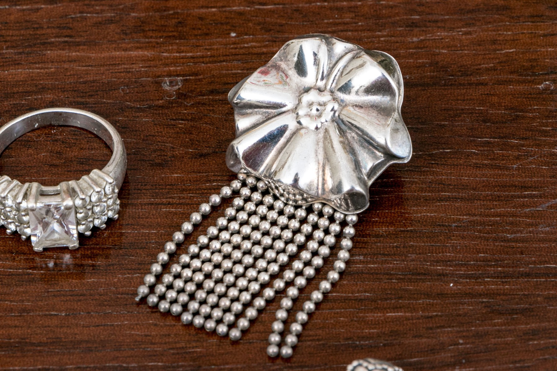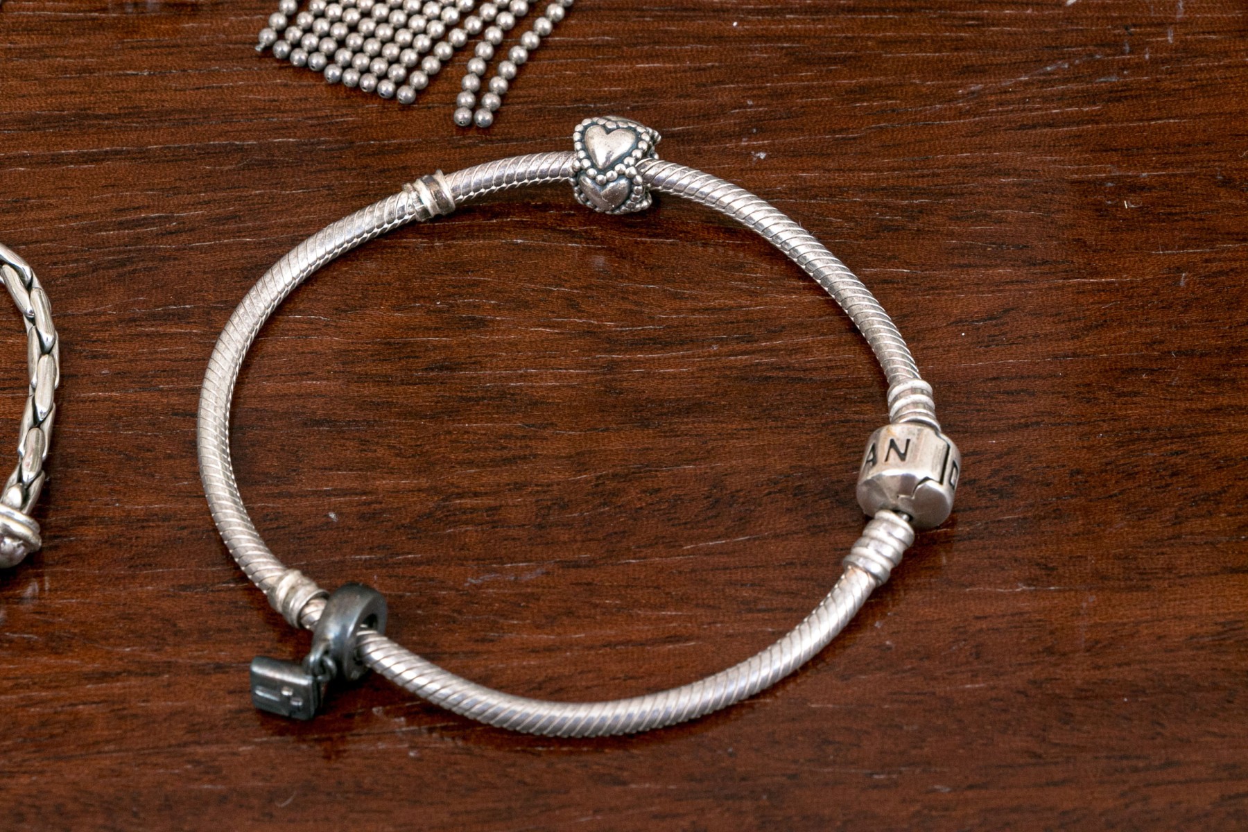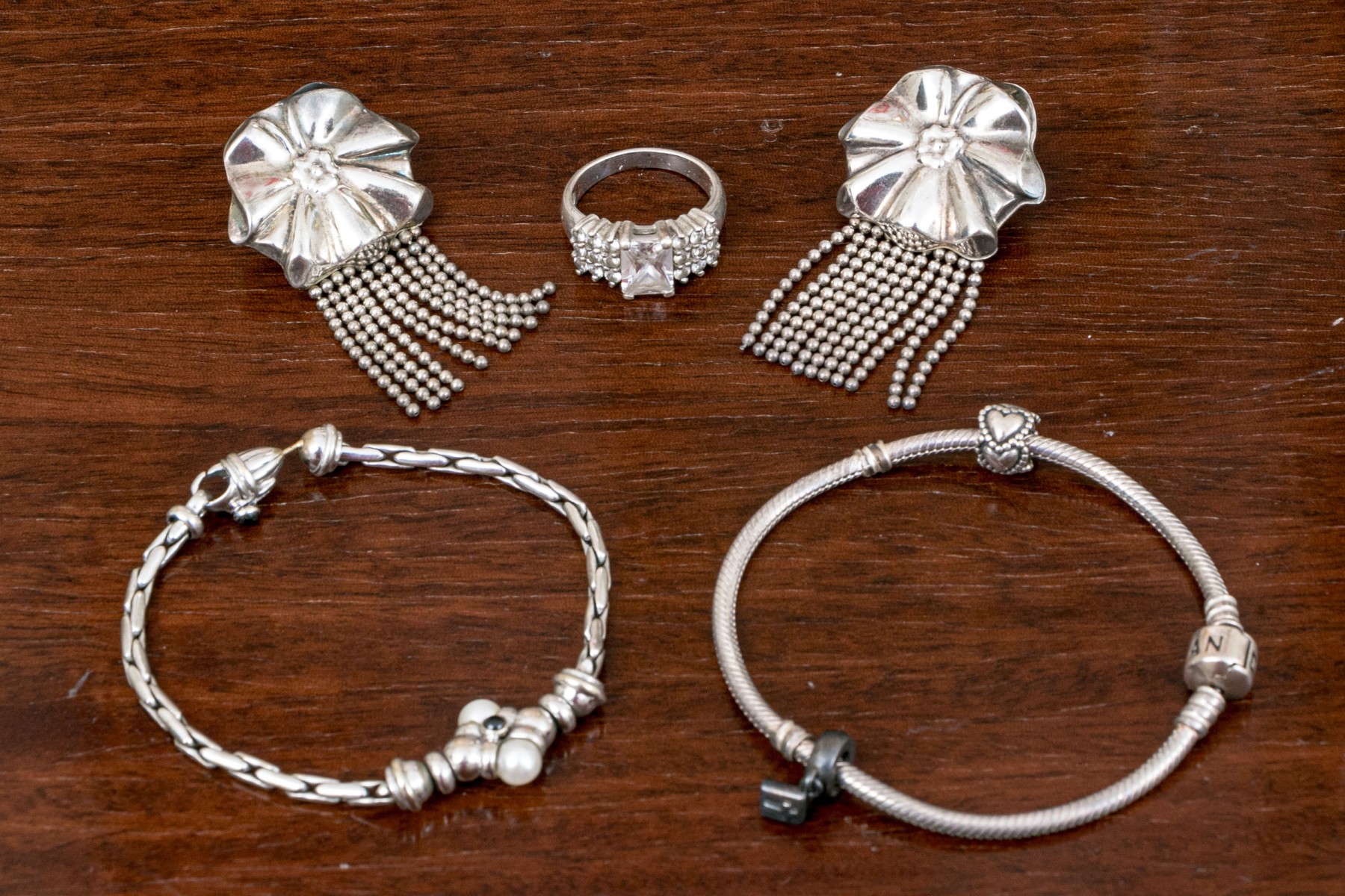 Includes a pair of stylish floral form earrings, a Pandora bracelet, a CZ ring, and an additional bracelet (silver-toned).