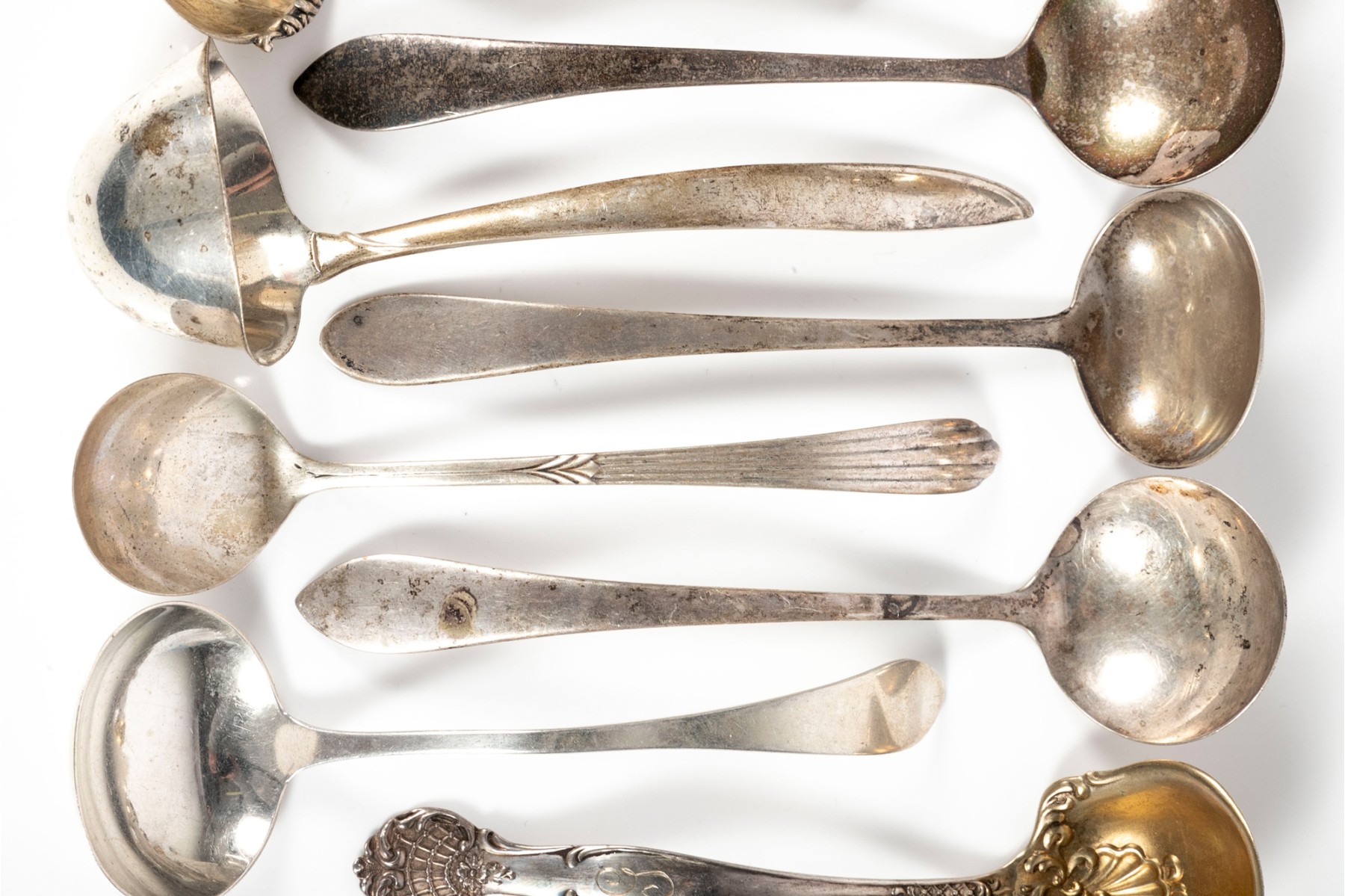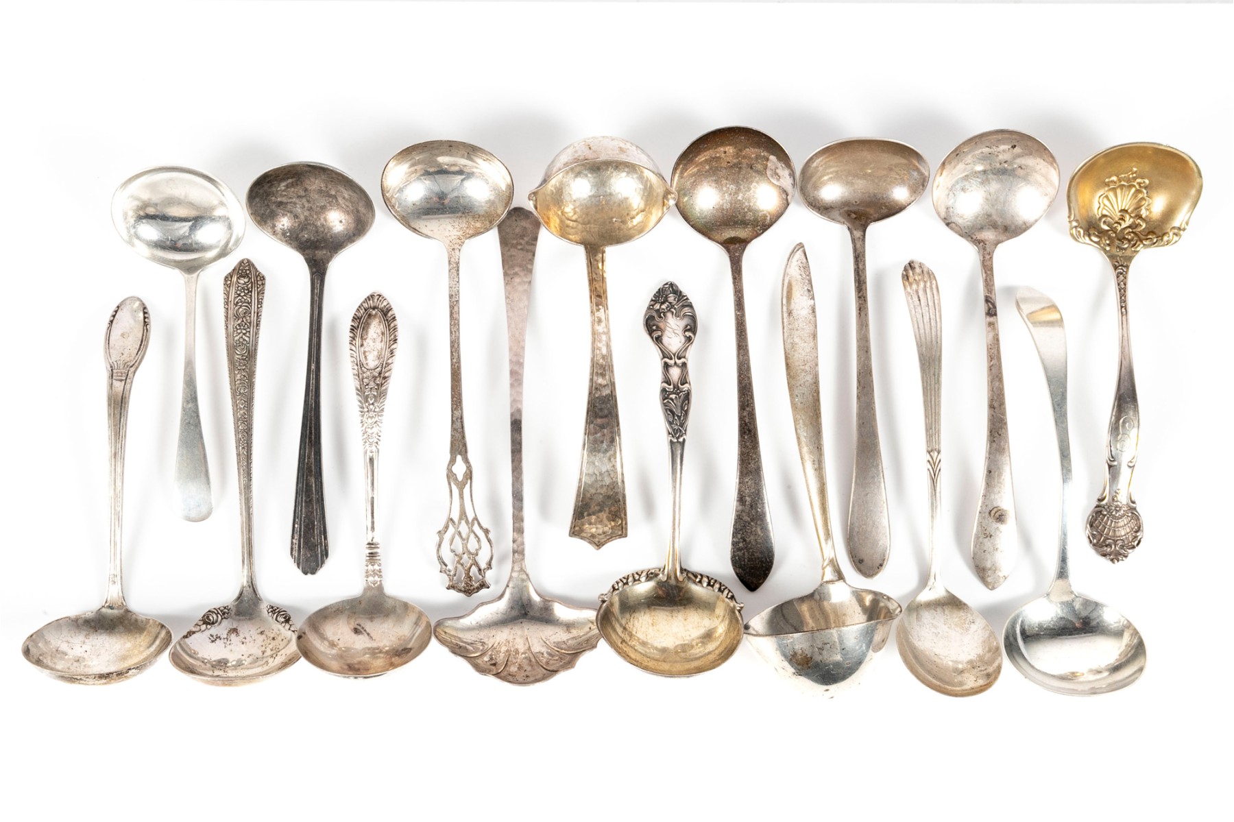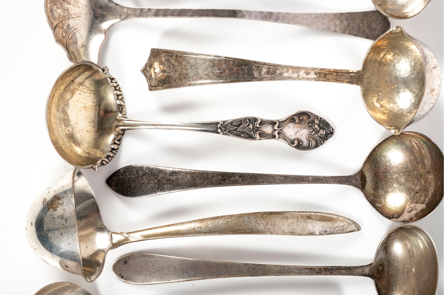 A variety of small sterling silver ladles in a range of designs, mostly with simple handles. A few handles feature hammered texture, floral relief, and pierced openwork. Makers include NF & Co, Wallace, Fisher, Frank M. Whiting, Lunt, International Sterling, NS Co, and Wallingford, among others.