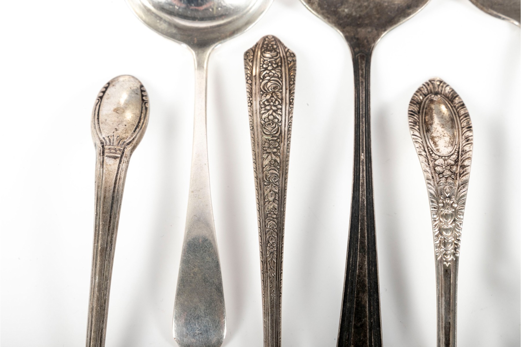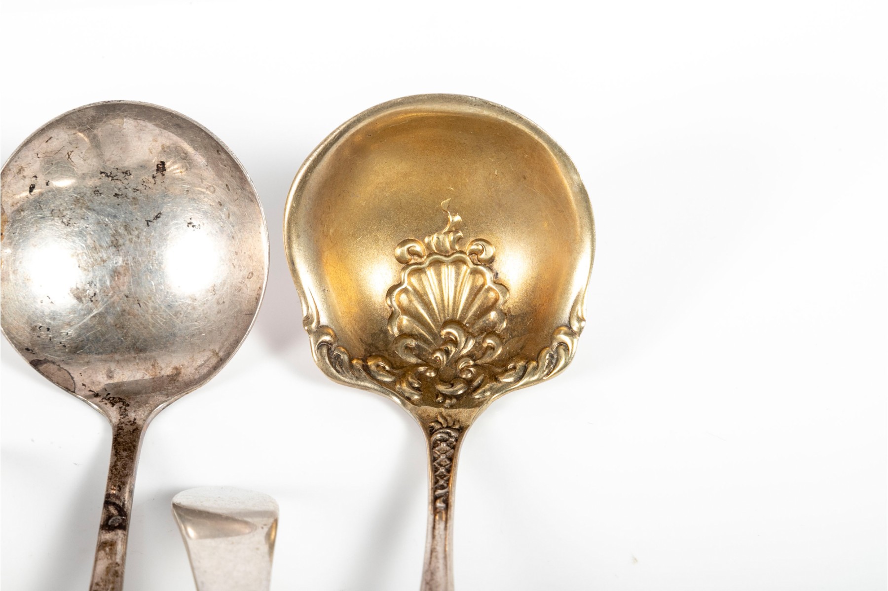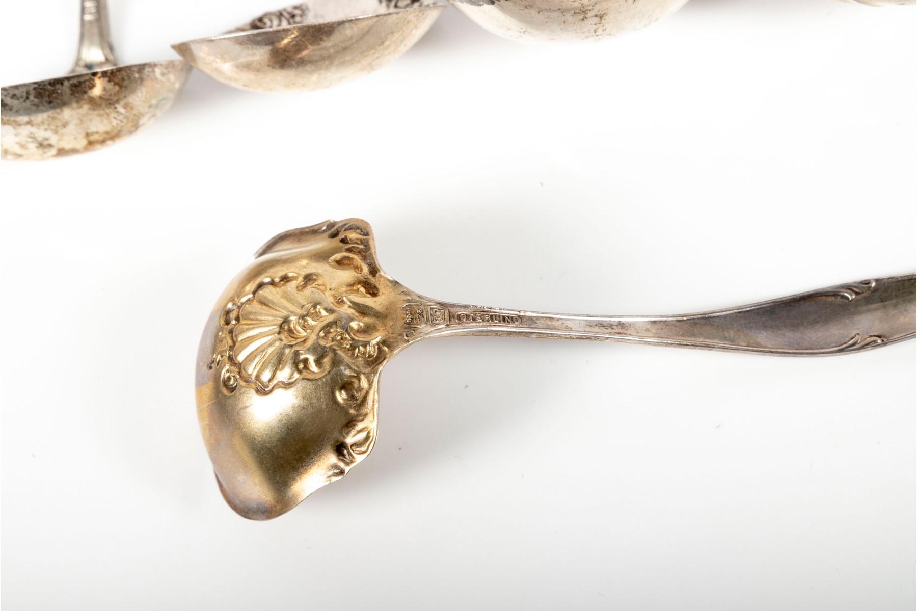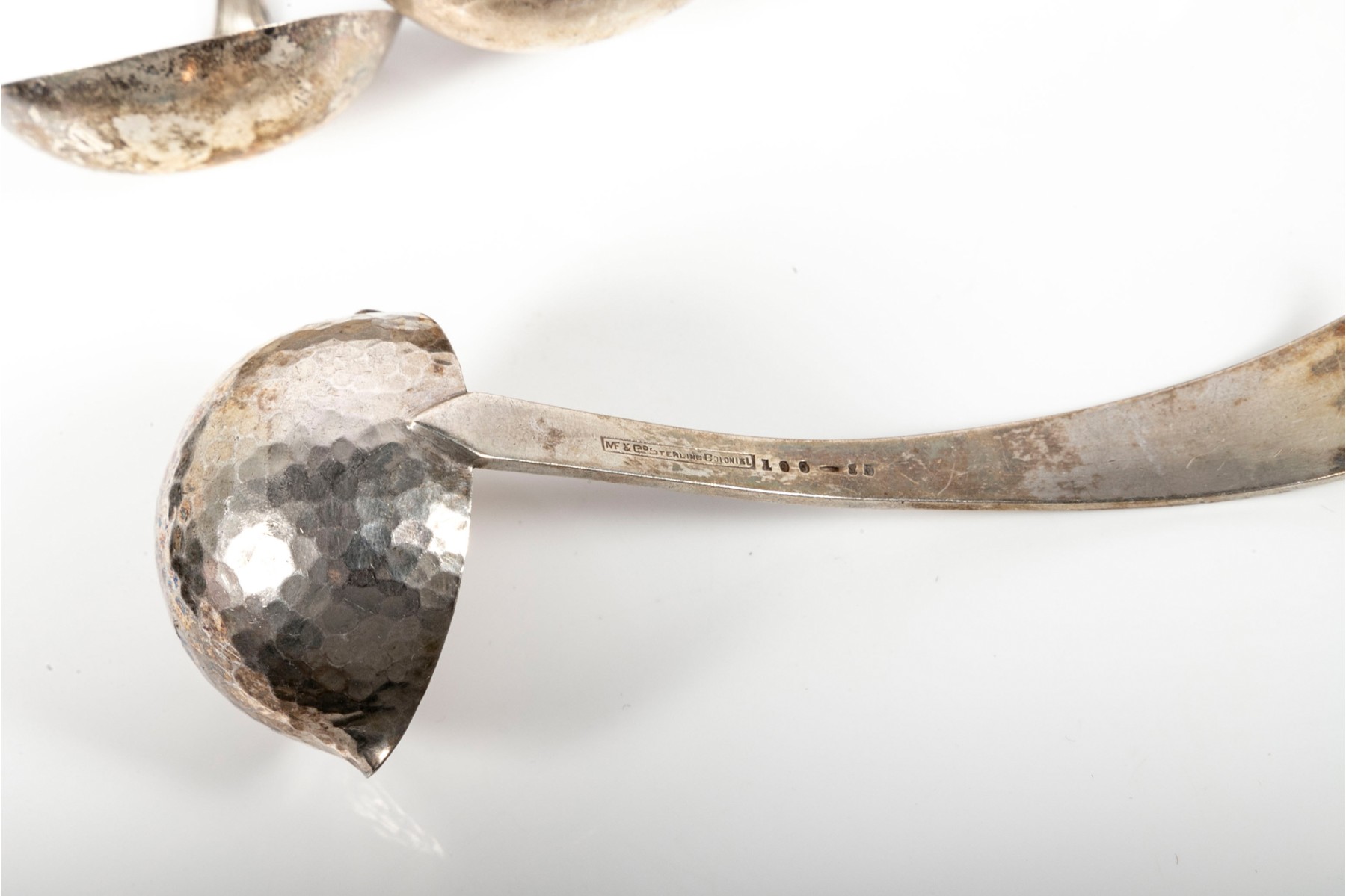A variety of small sterling silver ladles in a range of designs, mostly with simple handles. A few handles feature hammered texture, floral relief, and pierced openwork. Makers include NF & Co, Wallace, Fisher, Frank M. Whiting, Lunt, International Sterling, NS Co, and Wallingford, among others.