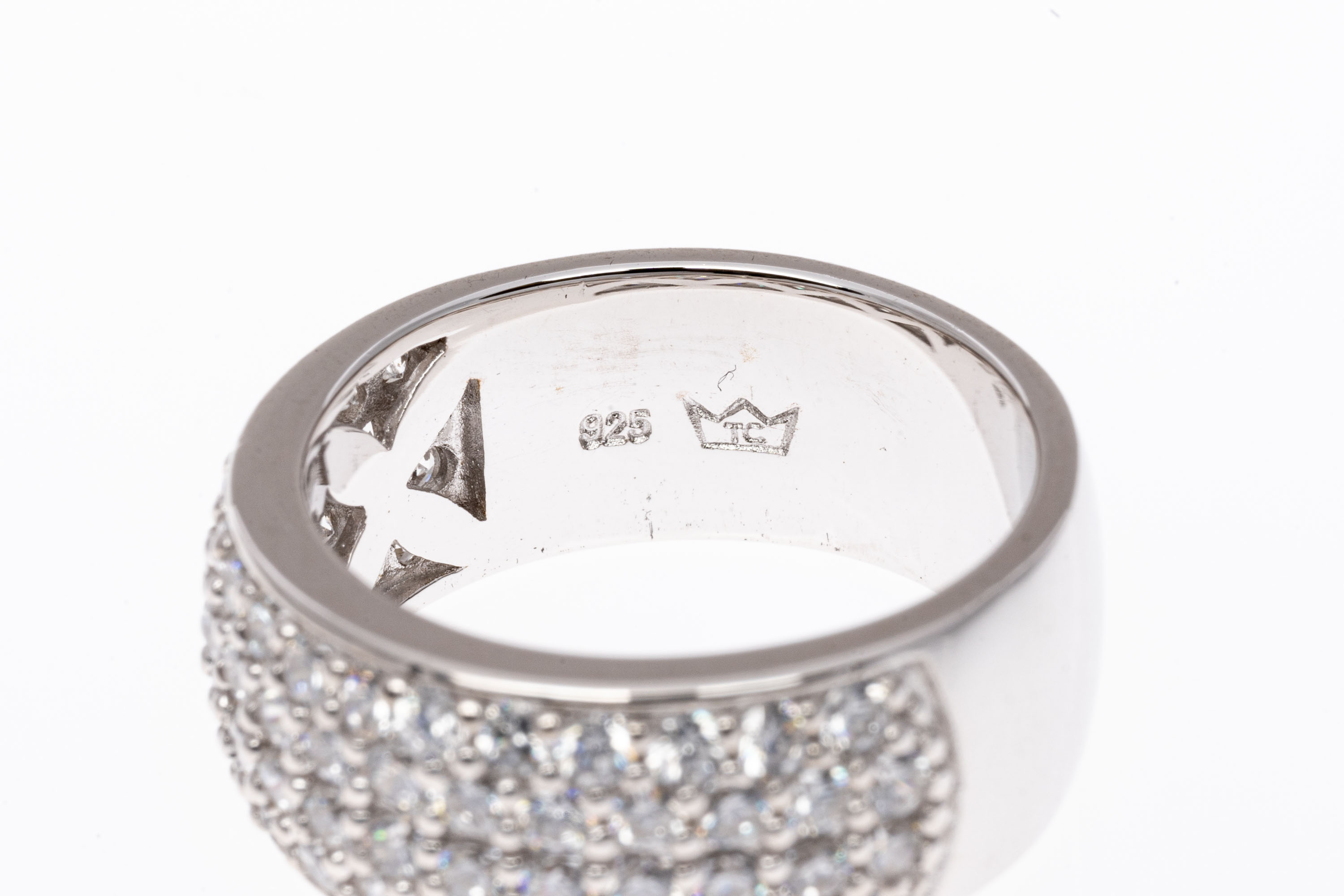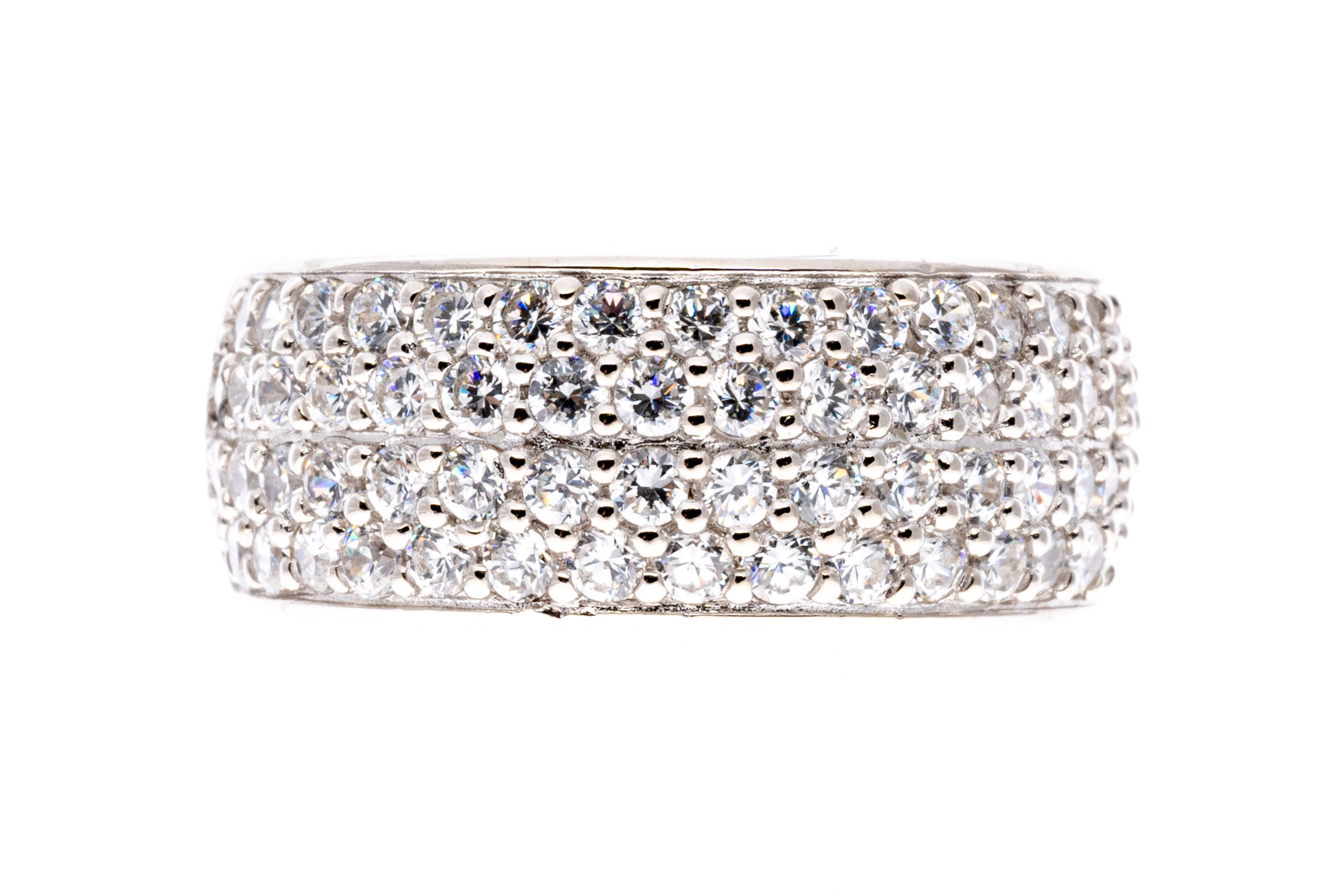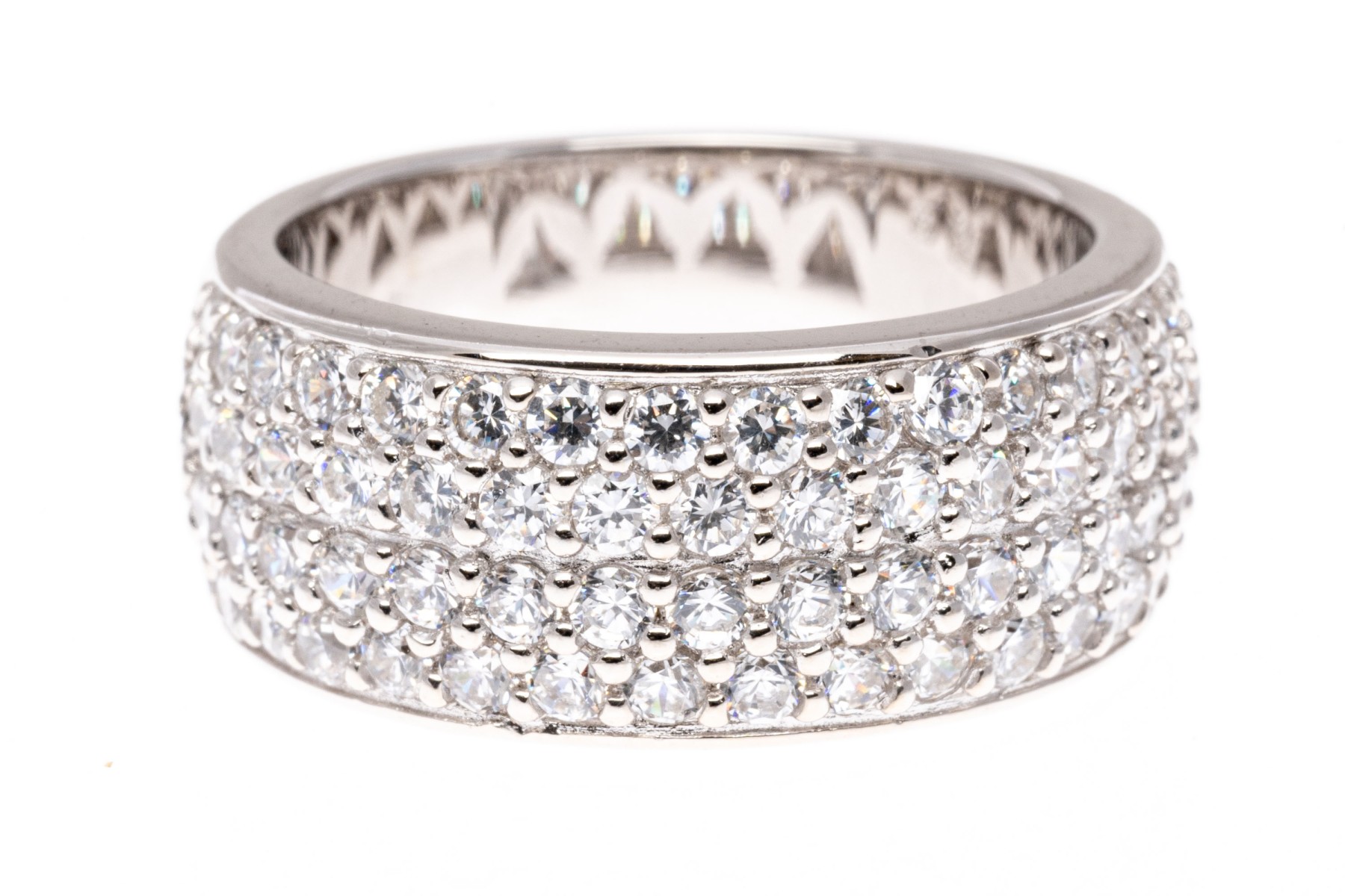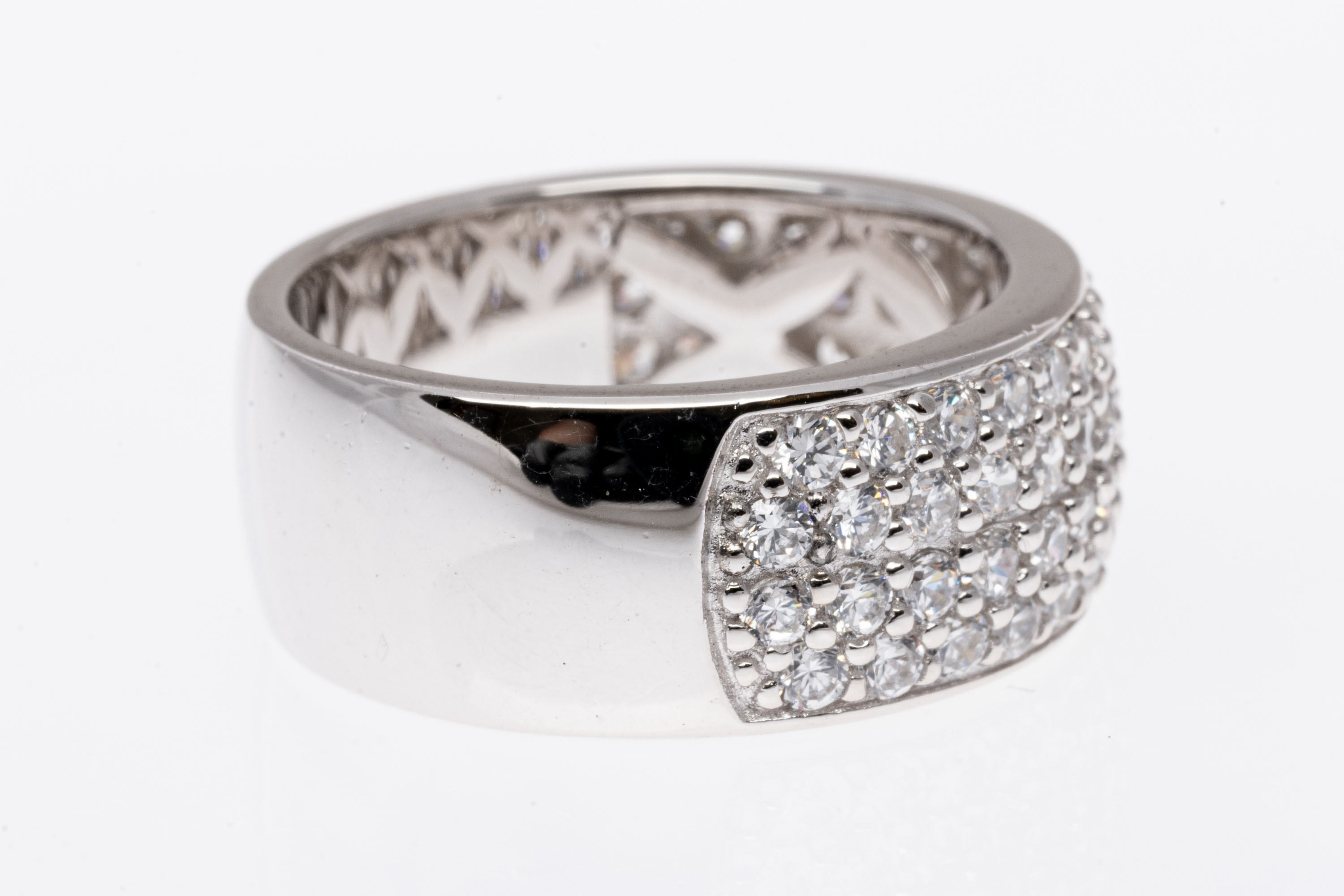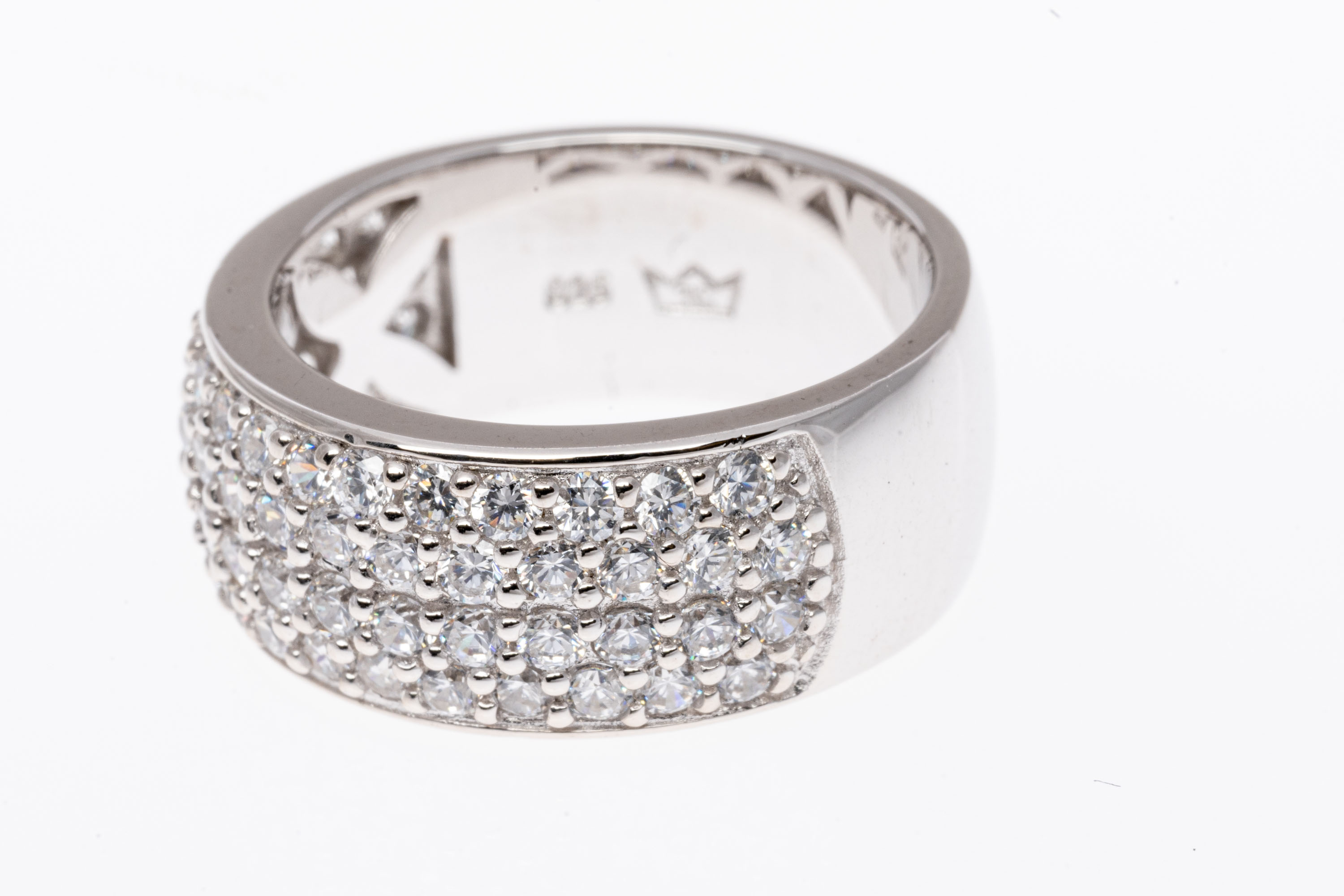 Sterling silver ring. This lovely ring is a wide, high polished finish, four row, round brilliant faceted, clear white color cz stone band ring, pave set.