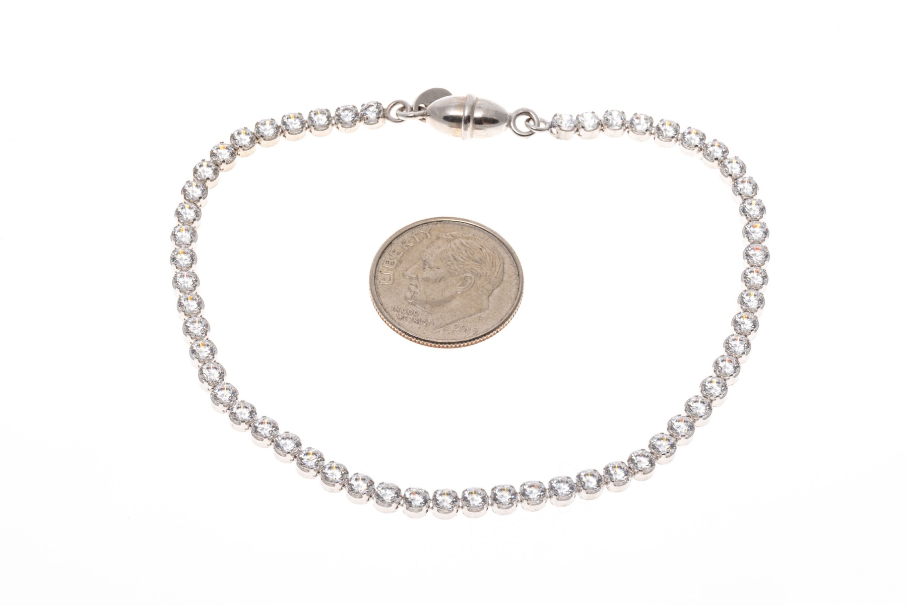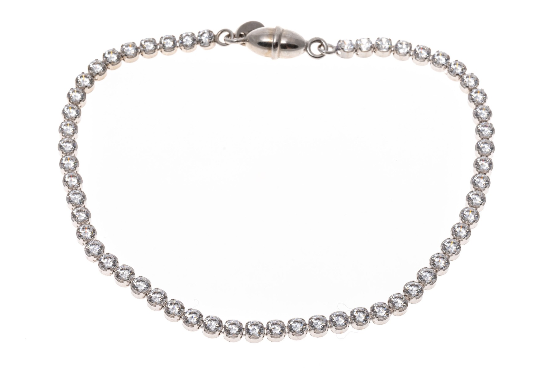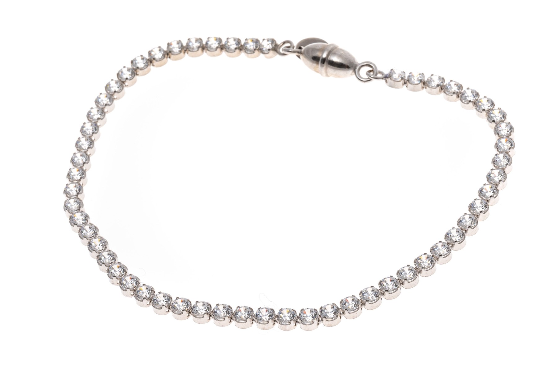 Sterling silver bracelet. This lovely sterling silver bracelet is a line style, decorated with round brilliant cut cz stones, prong set and finished with a magnetic clasp.