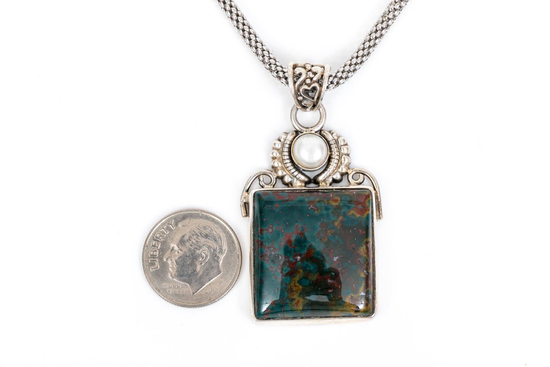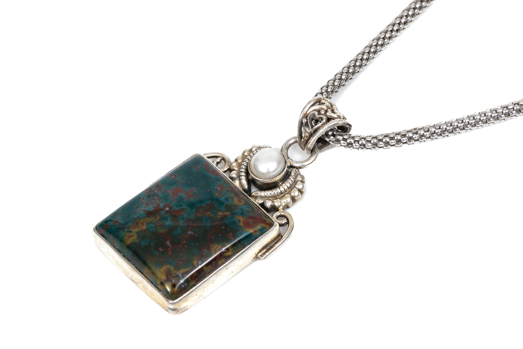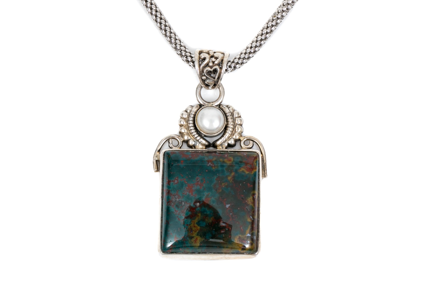 Sterling silver mesh necklace, with a handsome bloodstone and cultured freshwater pearl pendant, finished with a lobster claw style clasp