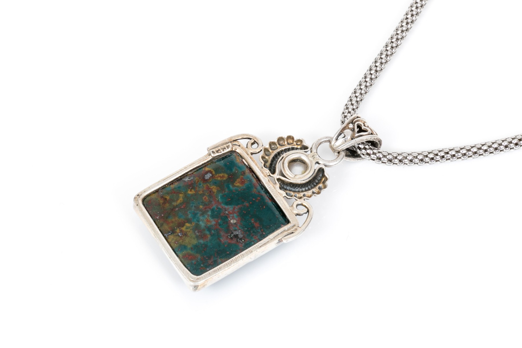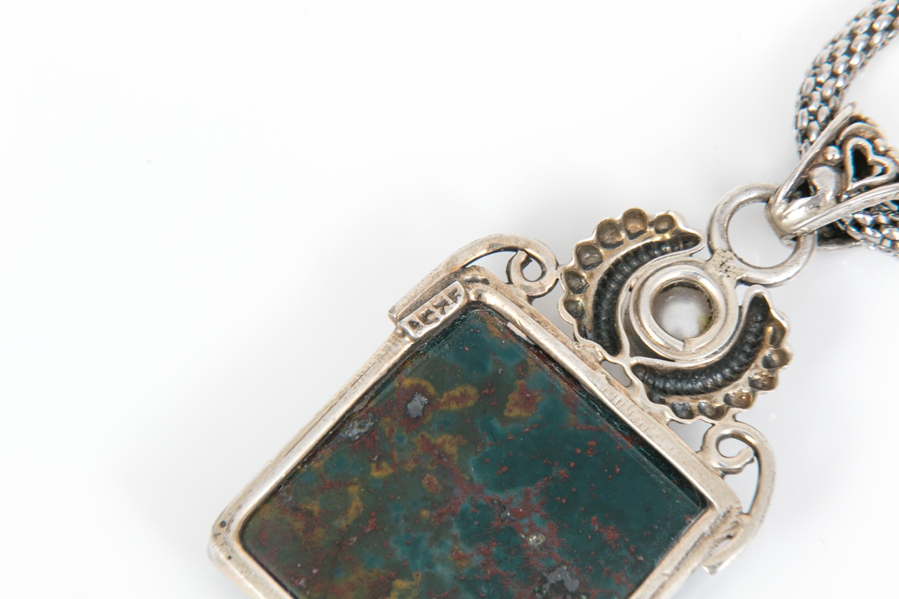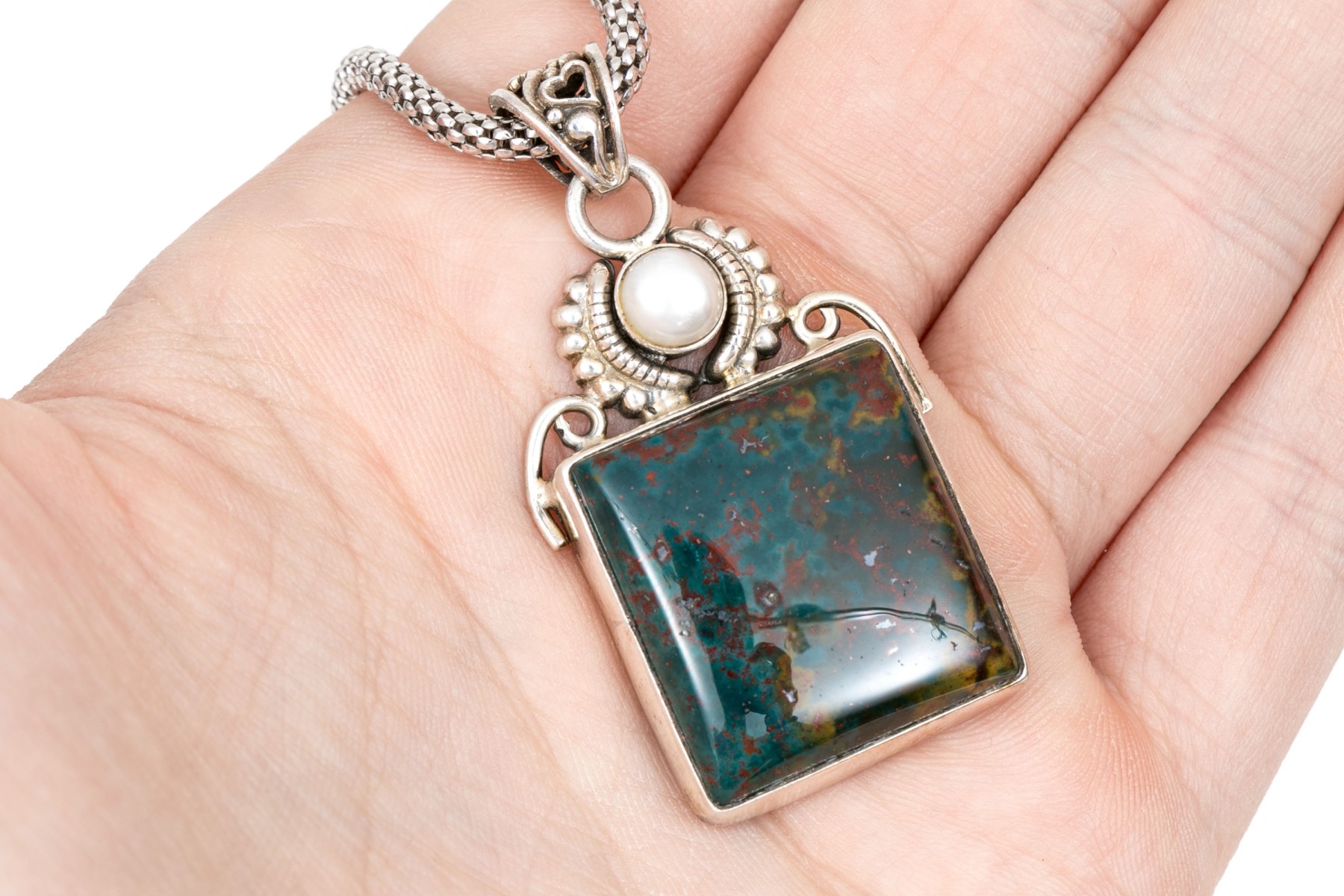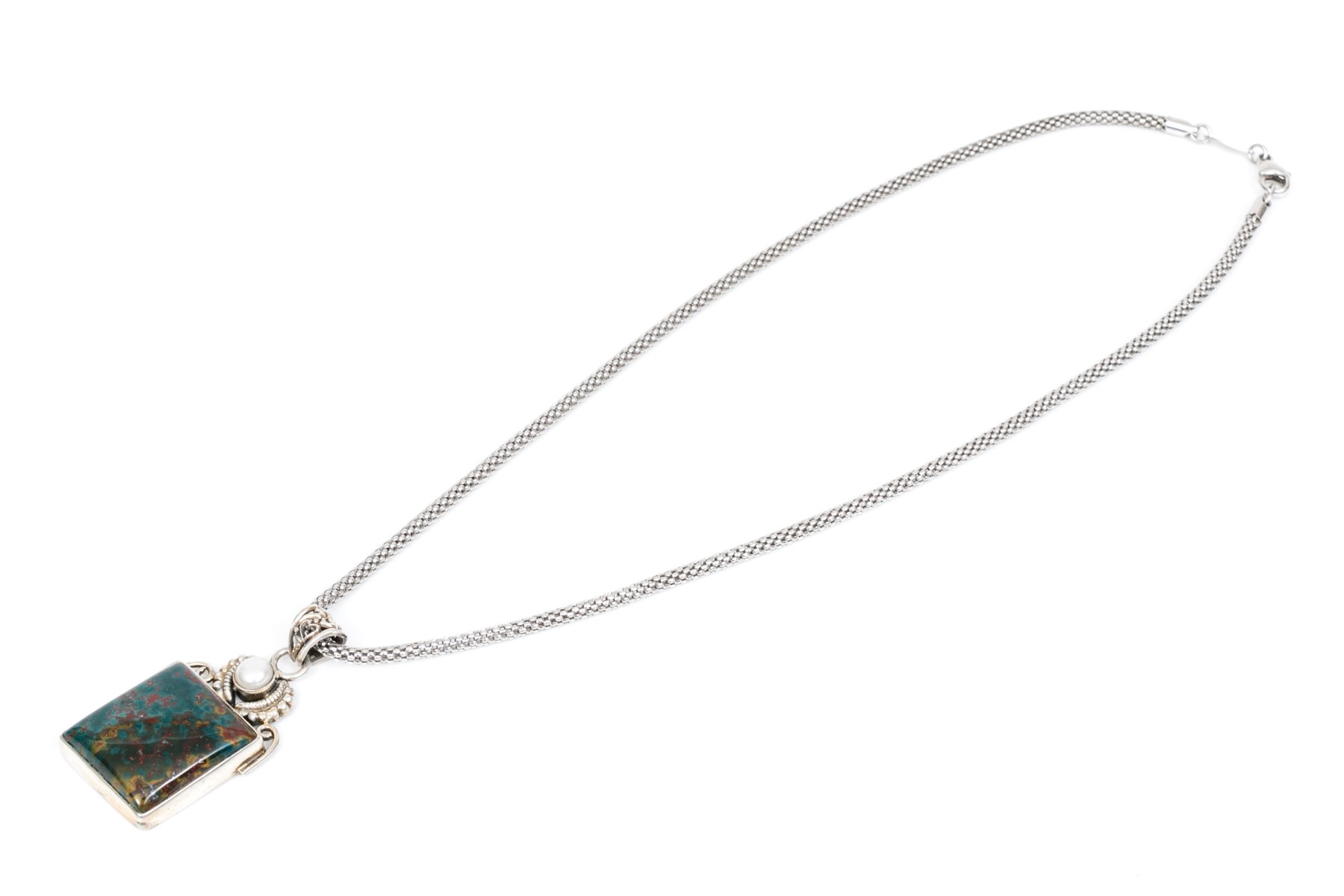 Sterling silver mesh necklace, with a handsome bloodstone and cultured freshwater pearl pendant, finished with a lobster claw style clasp