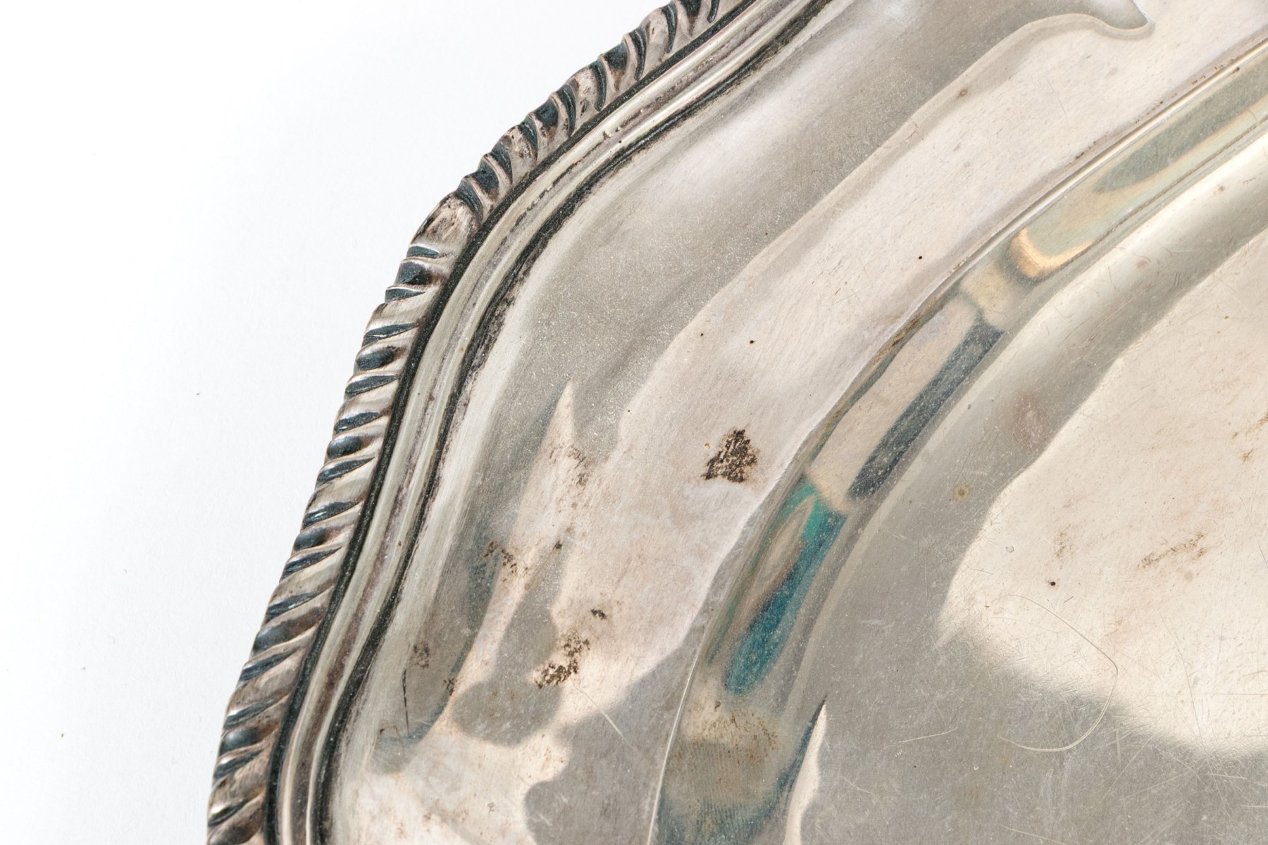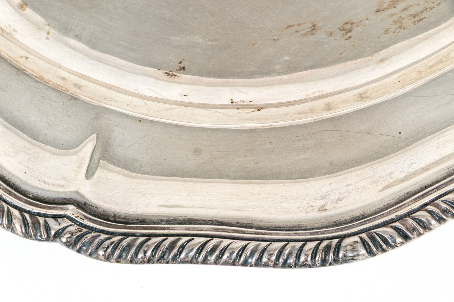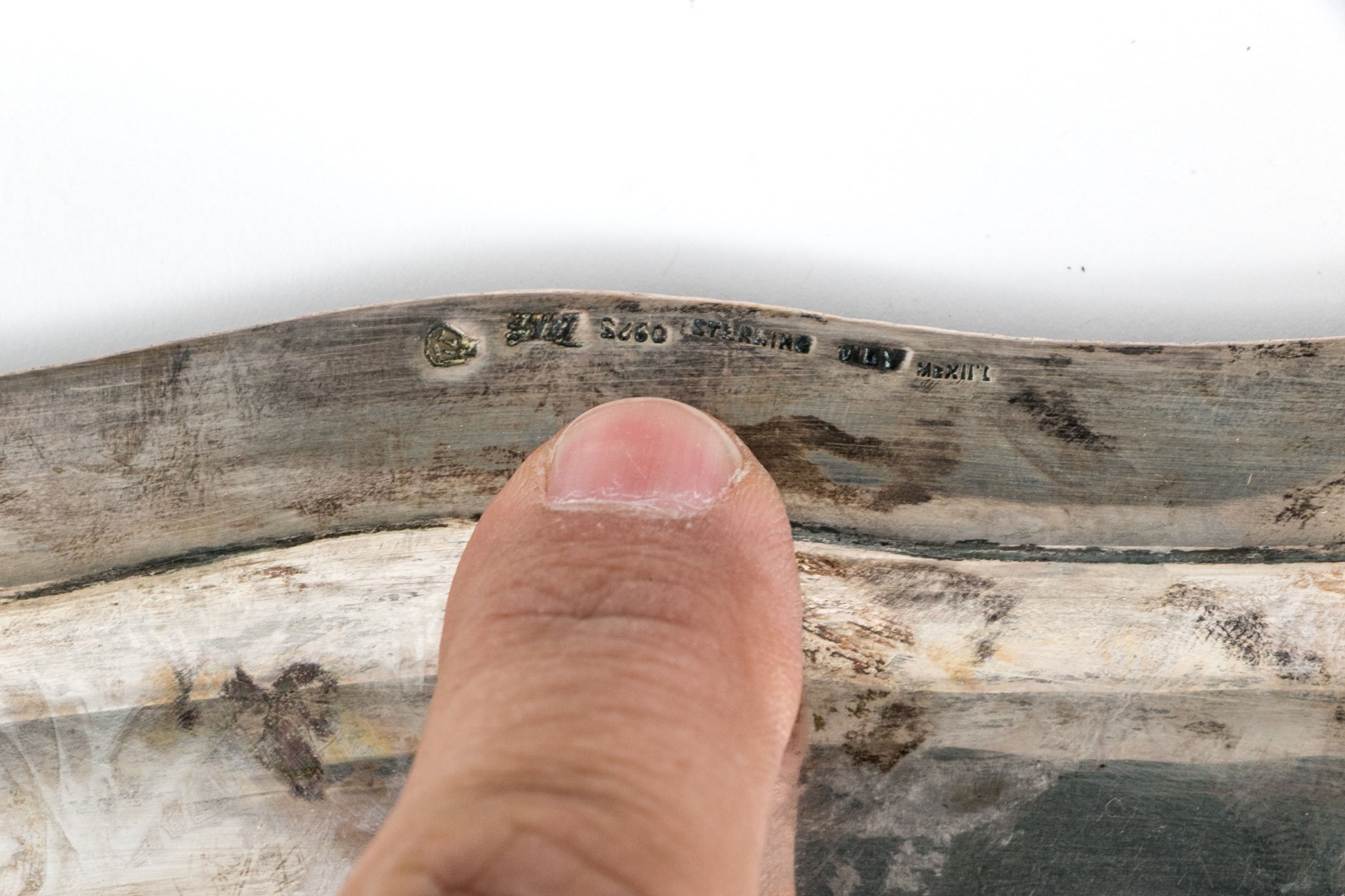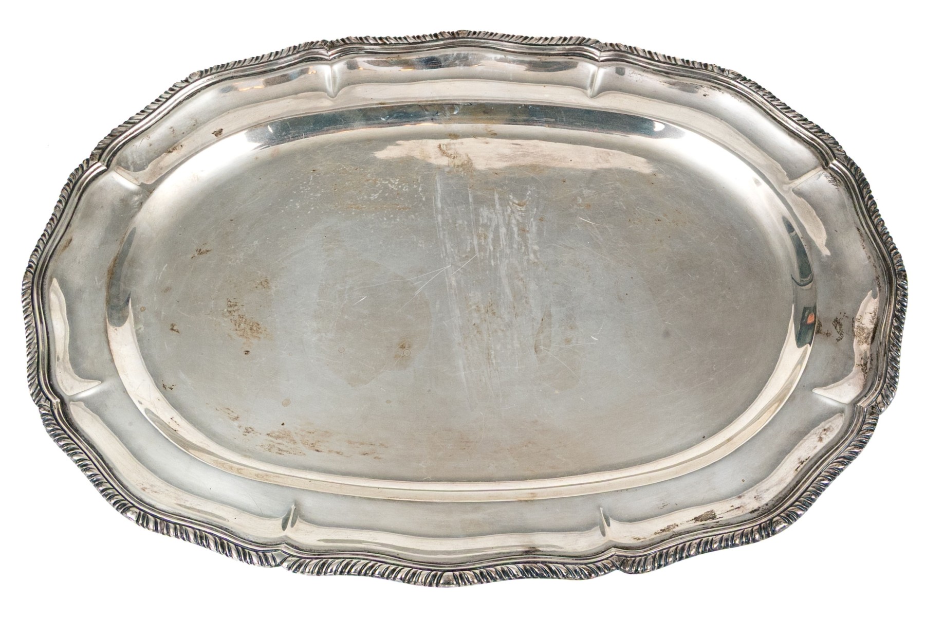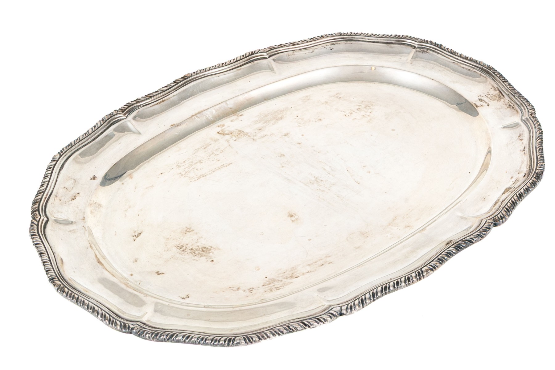 A gorgeous sterling silver platter in oval form, decorated with a gently scalloped rim and out trim with textural patterns. Marked on the underside of the rim.