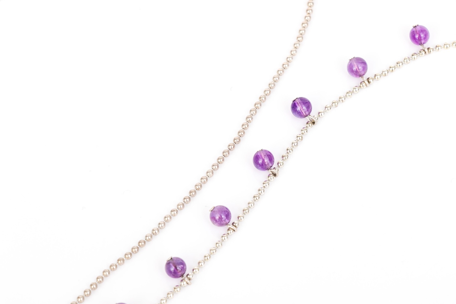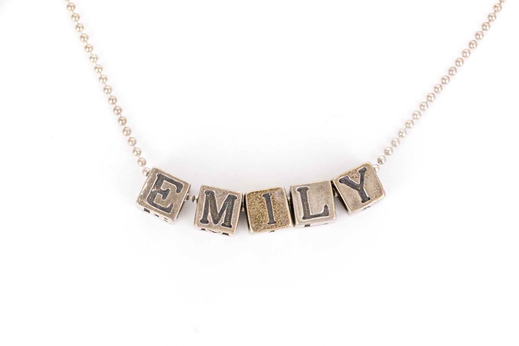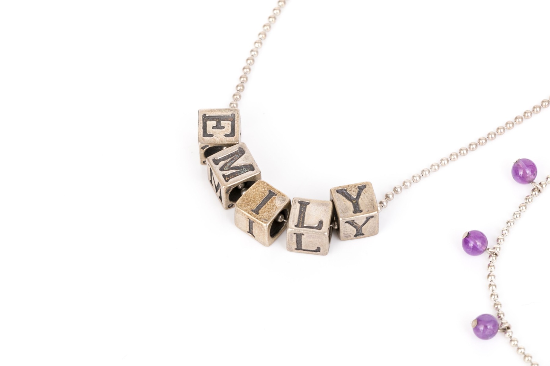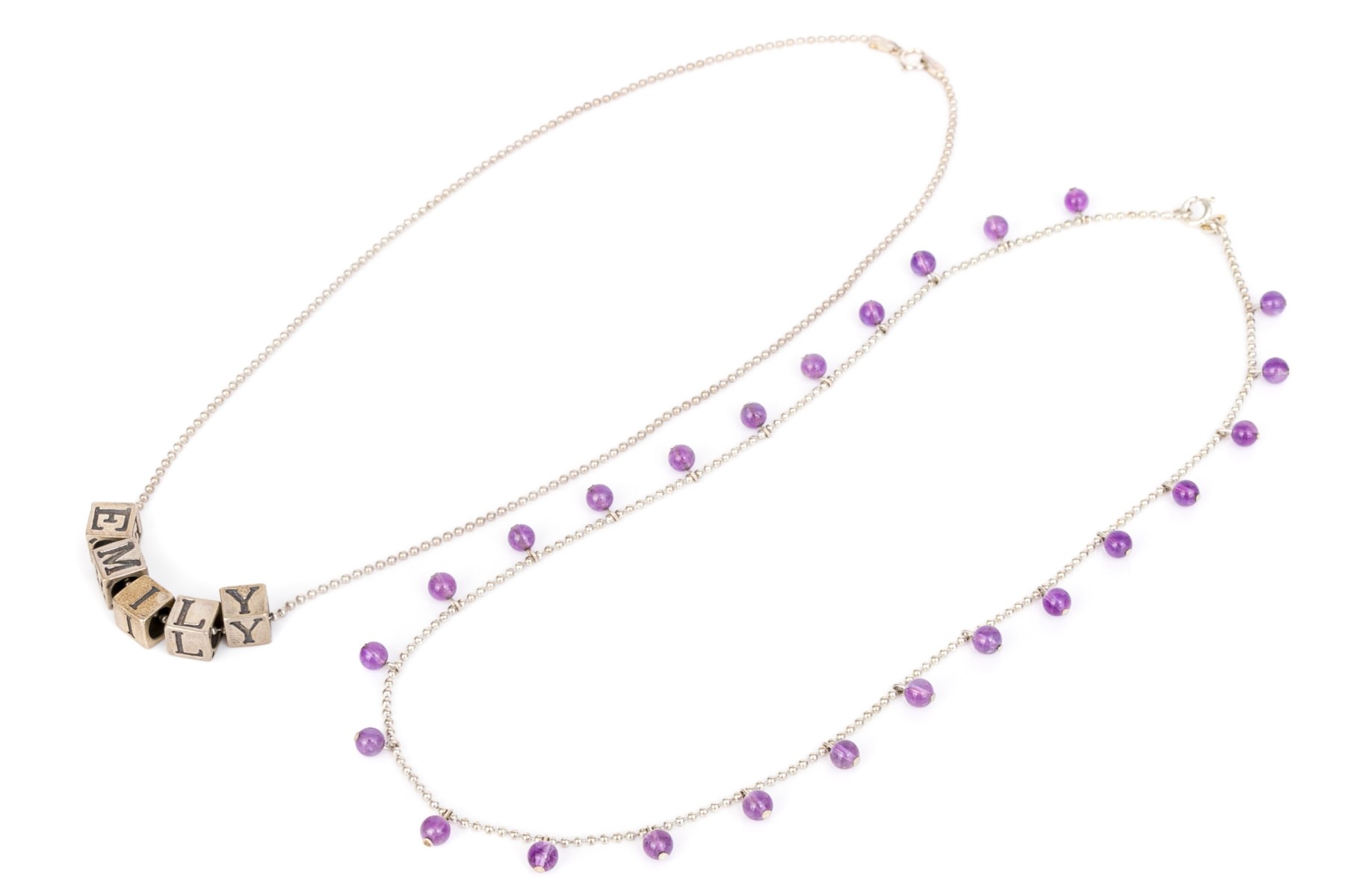 Sterling silver pair of chain necklaces - one amethyst fringed, one "Emily" in block letters