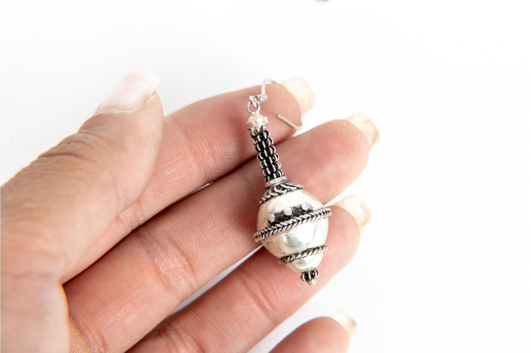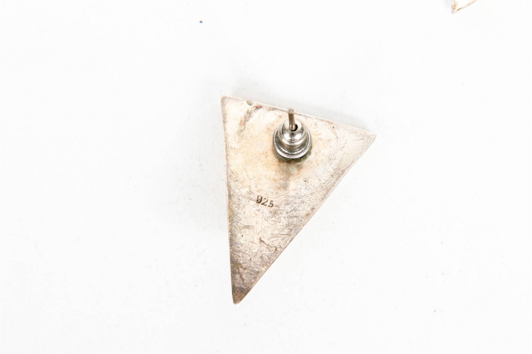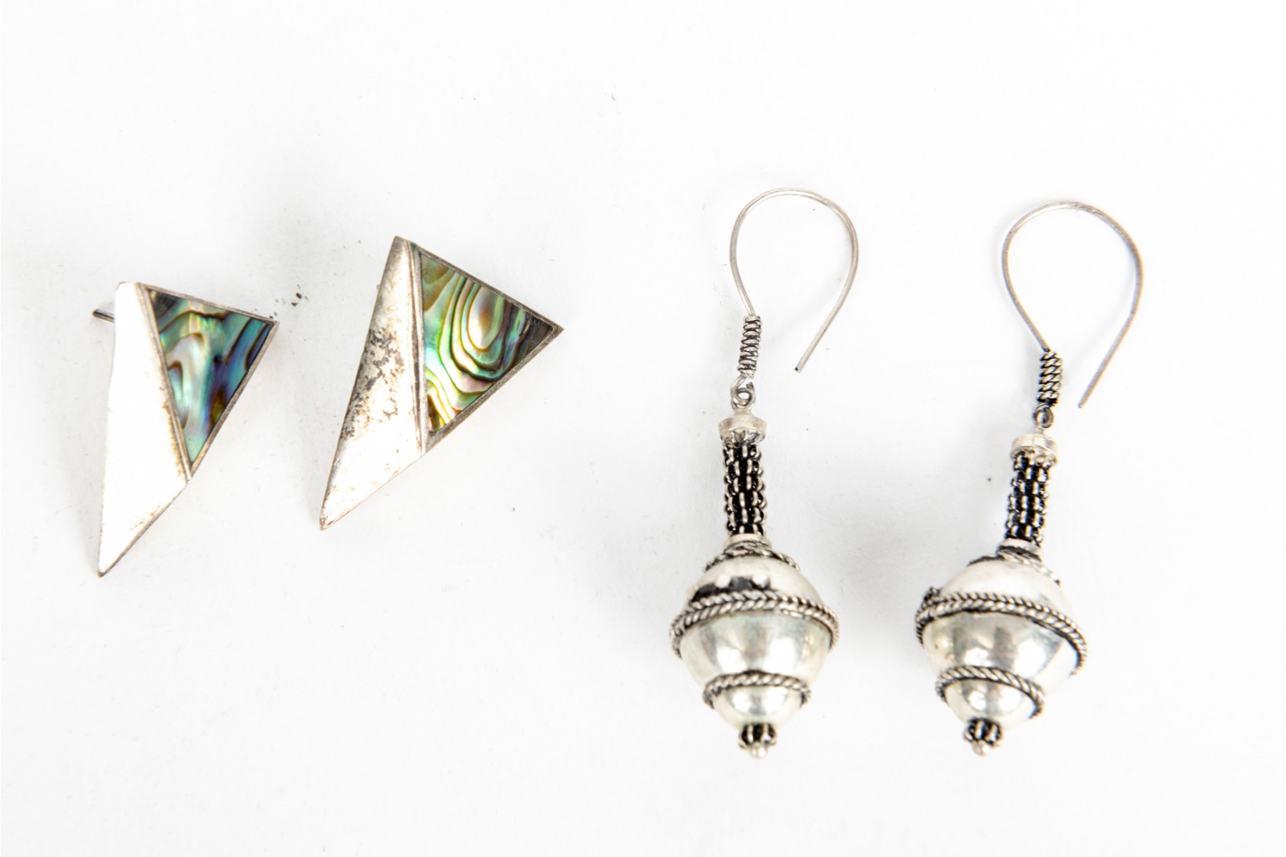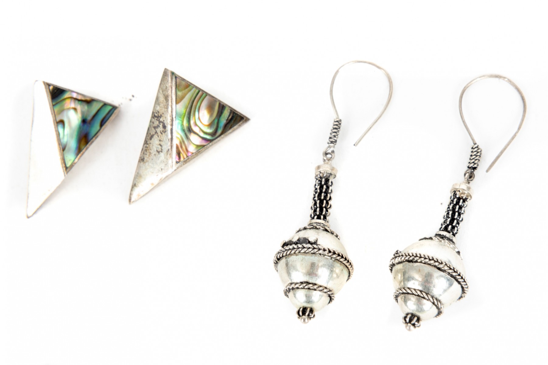 A pair of sterling silver earrings. The first is a pair of pendant style earrings with a rounded base and fish hook style backings. The second pair is an abstract triangle with an offset abalone piece, post and clutch backings.