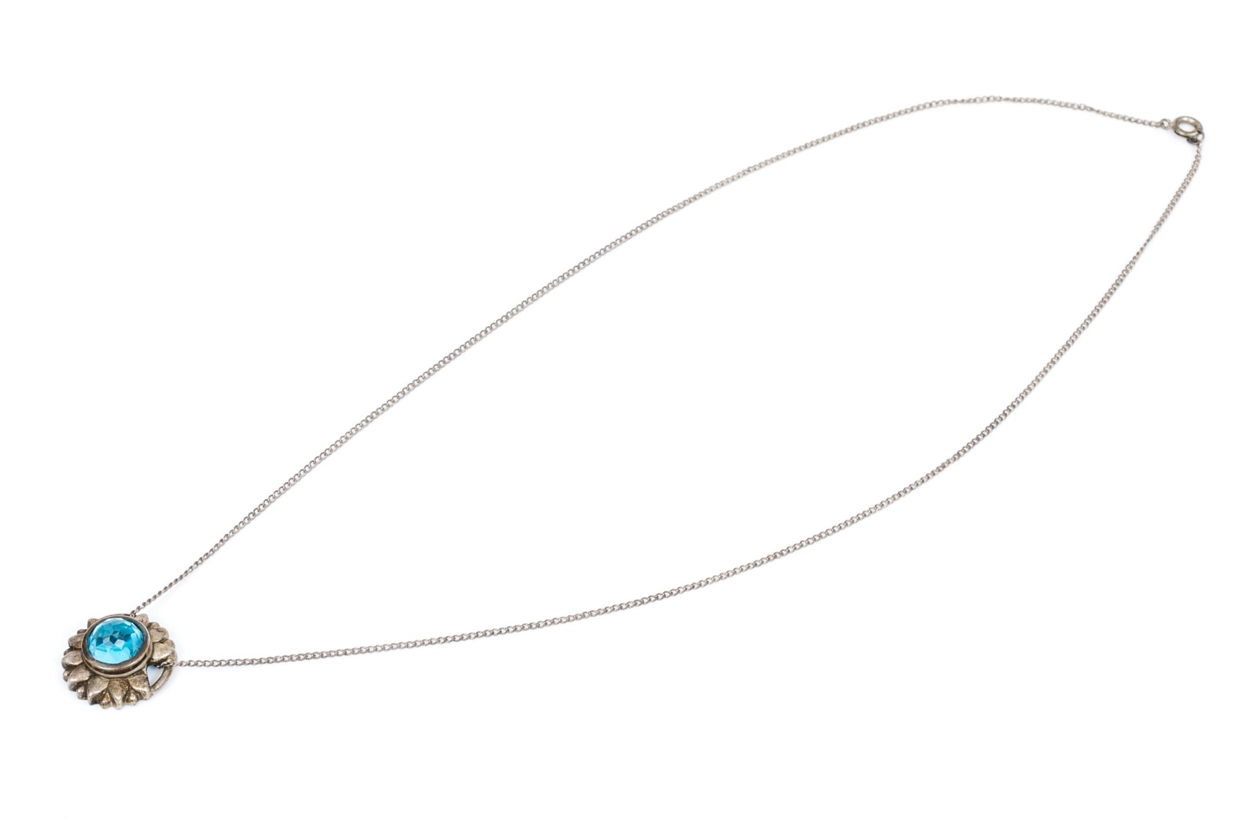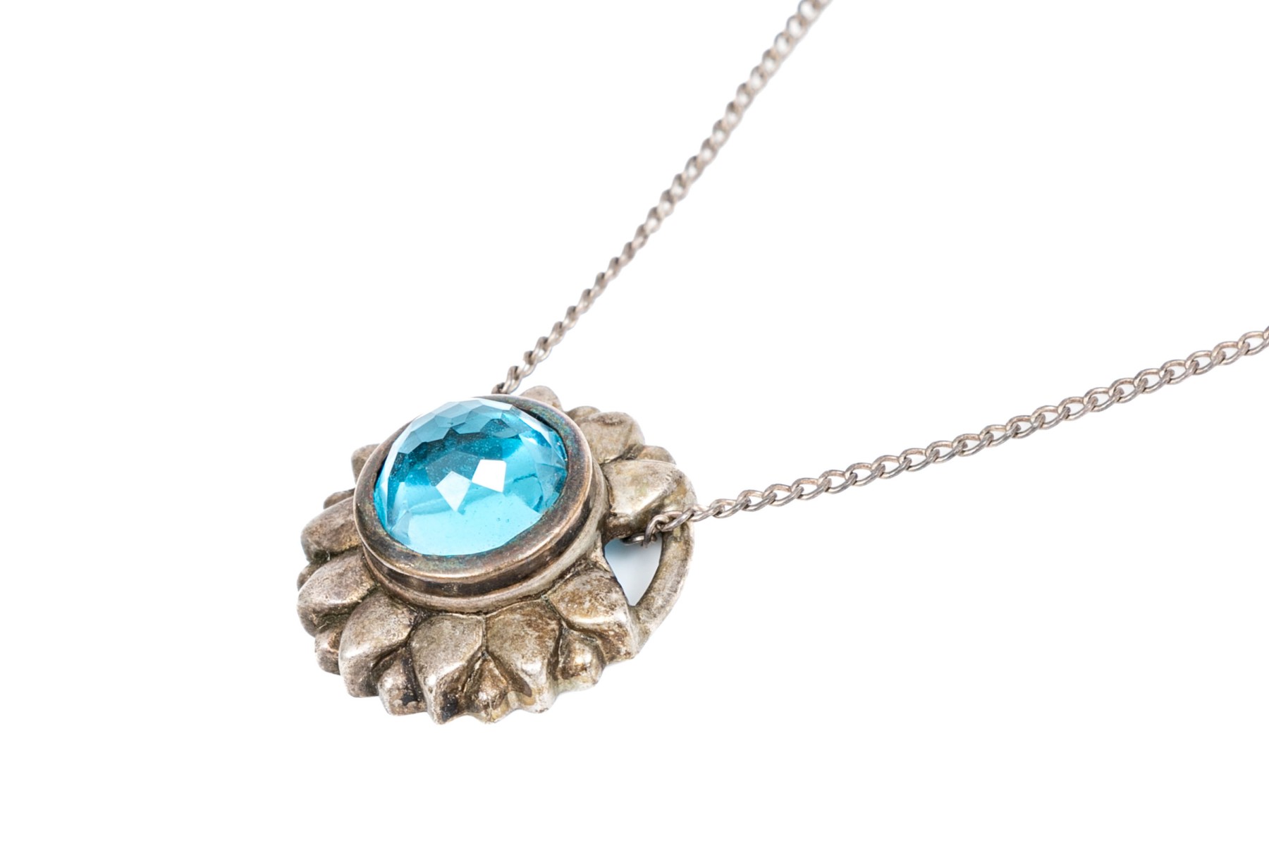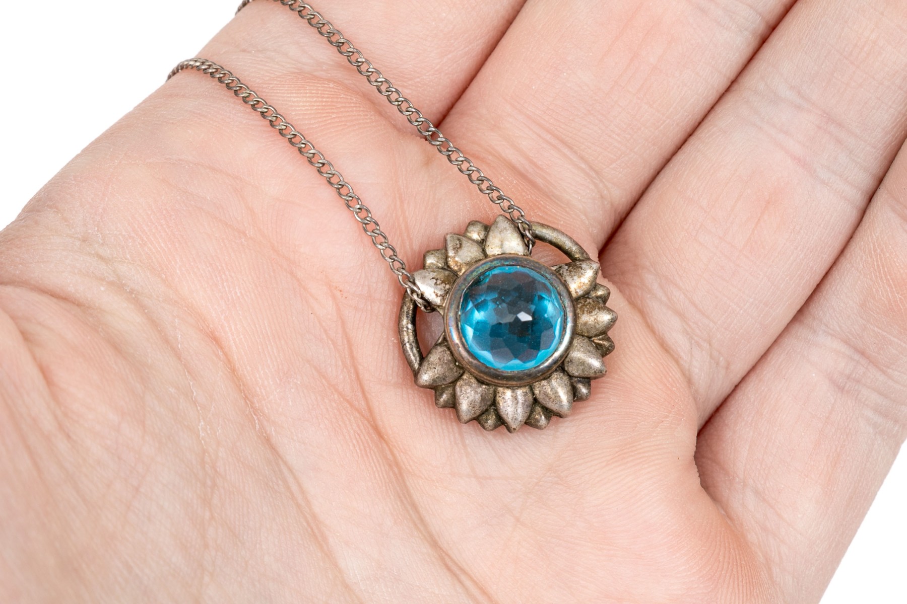 Sterling silver pretty flower motif pendant, set with a center blue topaz, finished with a curb link chain and a spring ring style clasp