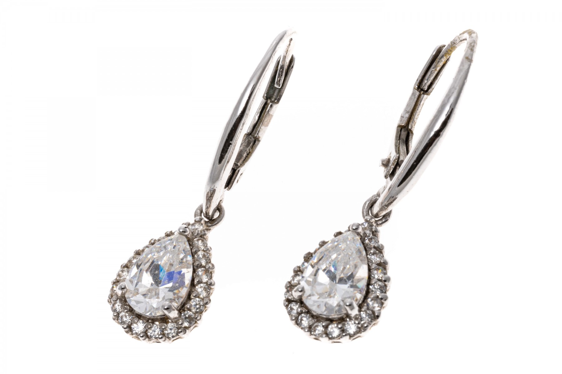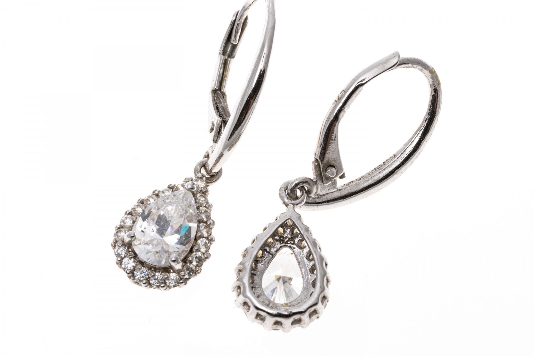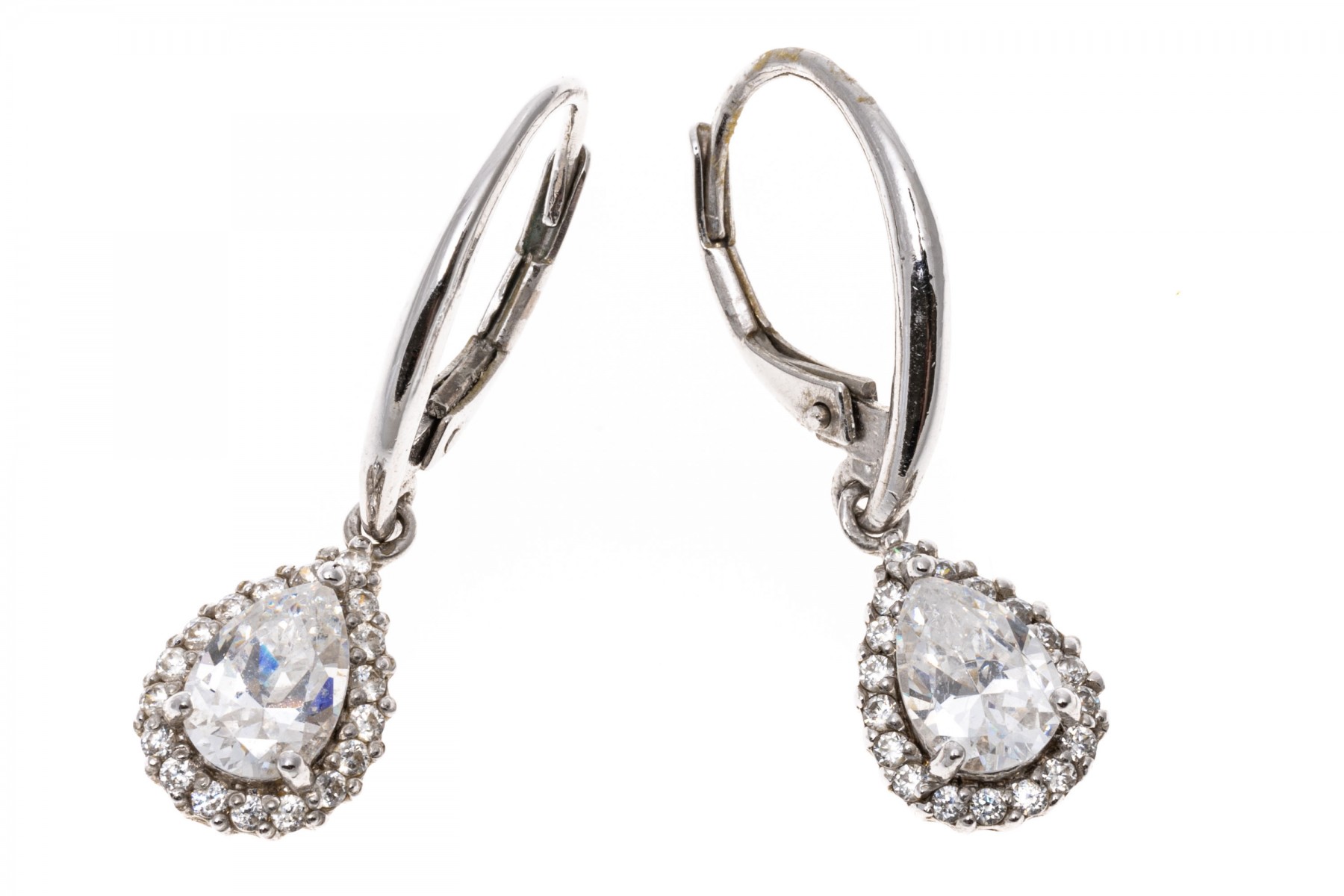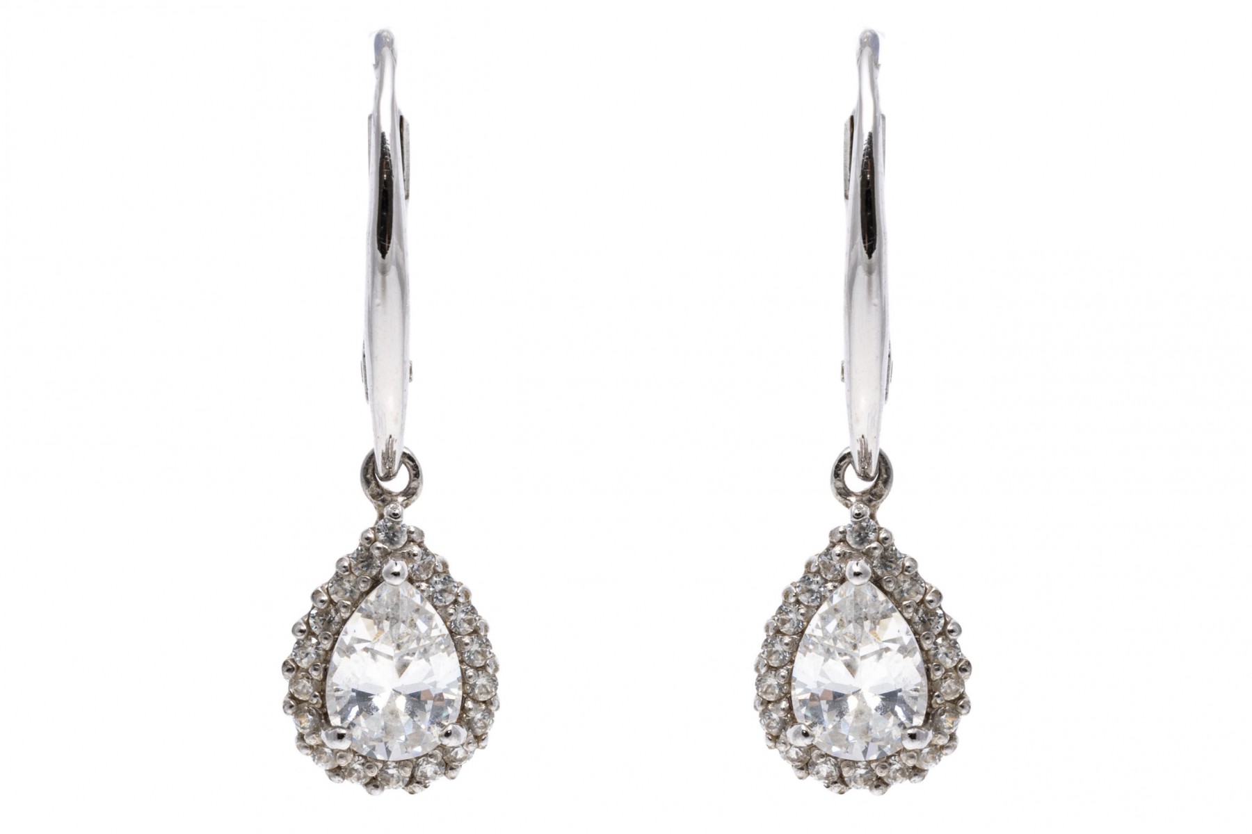 Sterling silver earrings. These pretty sterling silver earrings have a wire top, with a drop pendant set with a center pear shaped, white cz, prong set and framed by a halo of round faceted, white cz stones, also prong set. The earrings are finished with lever style backs.