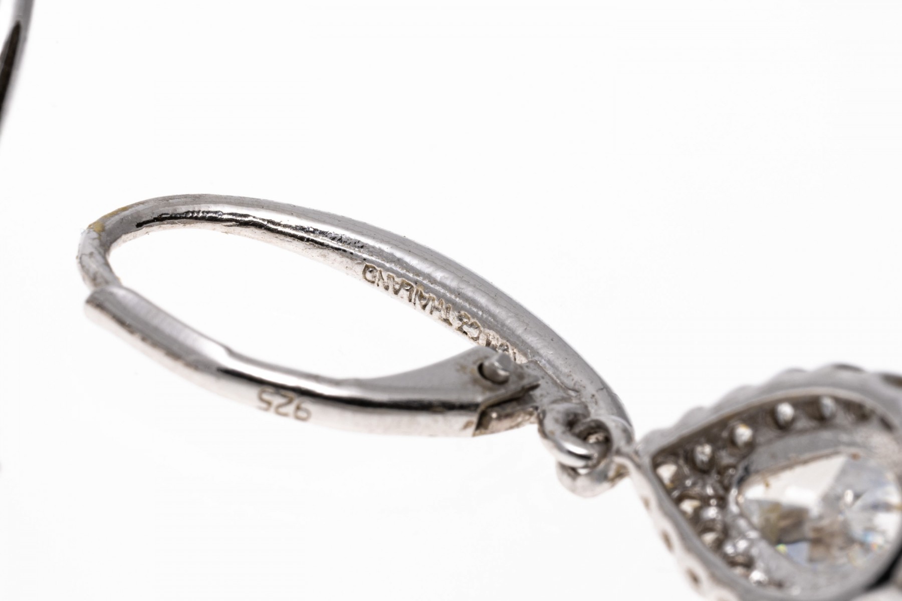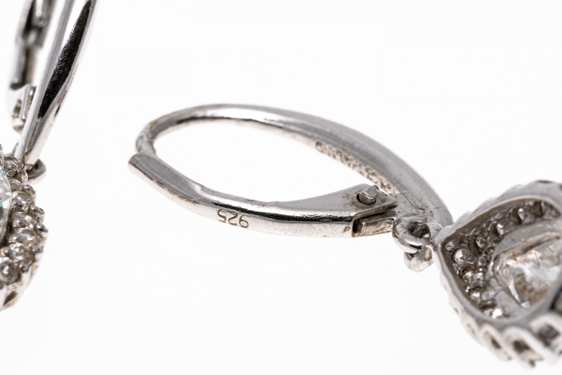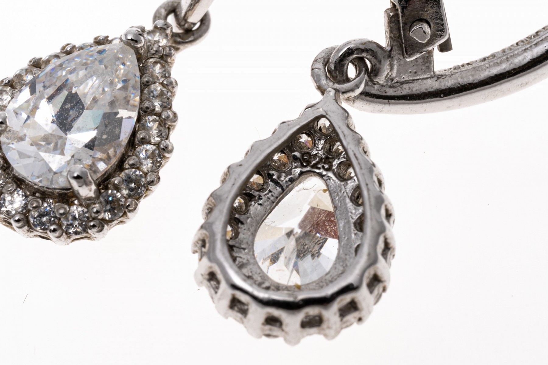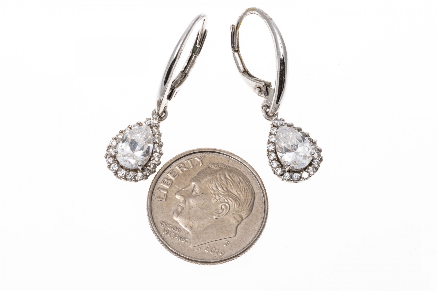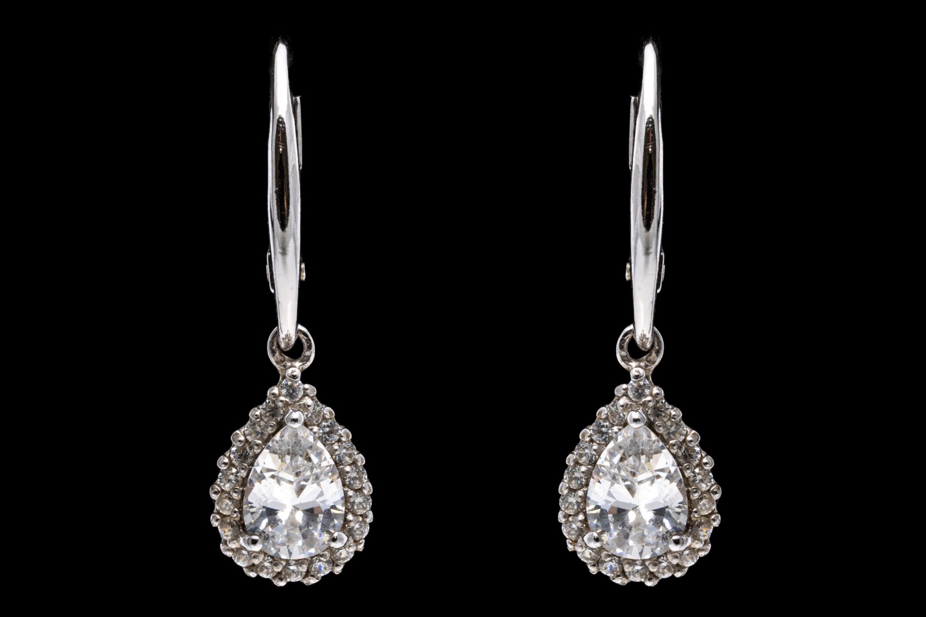 Sterling silver earrings. These pretty sterling silver earrings have a wire top, with a drop pendant set with a center pear shaped, white cz, prong set and framed by a halo of round faceted, white cz stones, also prong set. The earrings are finished with lever style backs.
