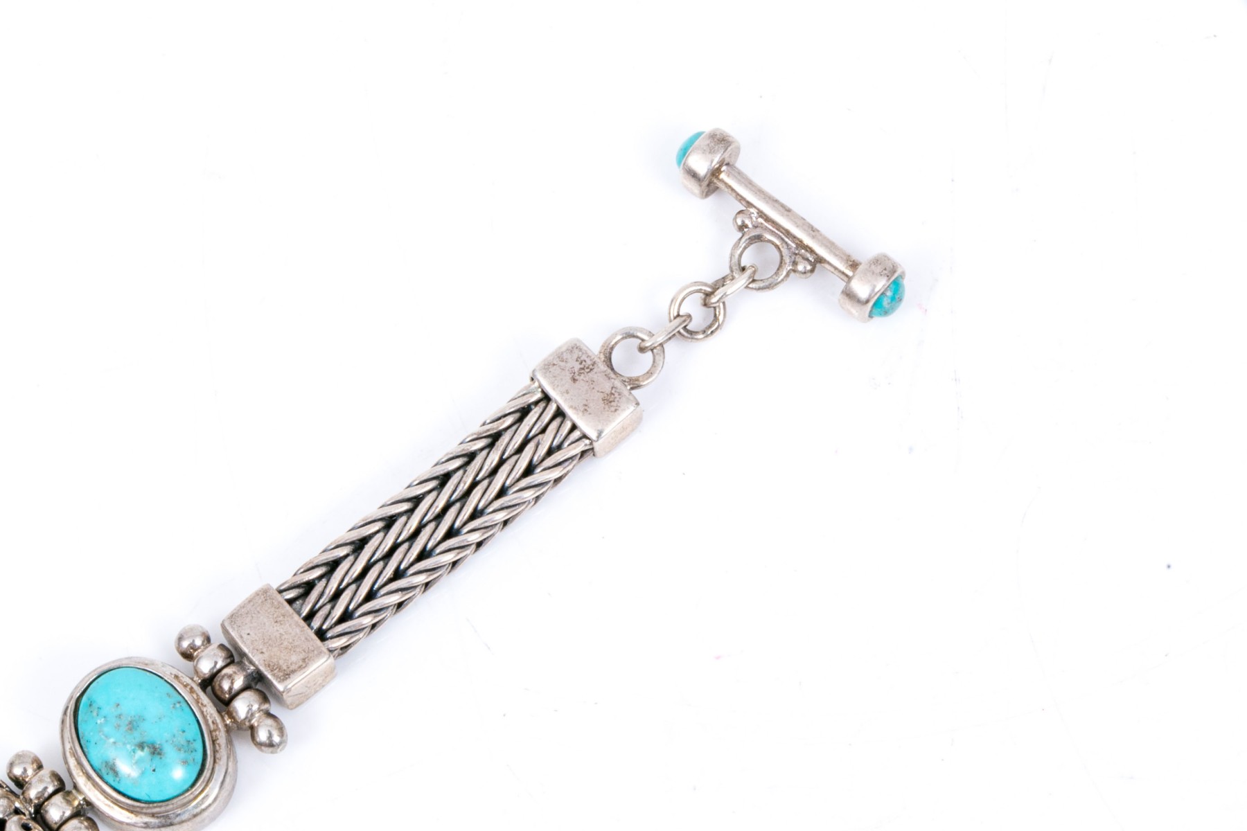 Sterling silver pretty woven foxtail and blue stone bracelet, finished with a toggle style clasp