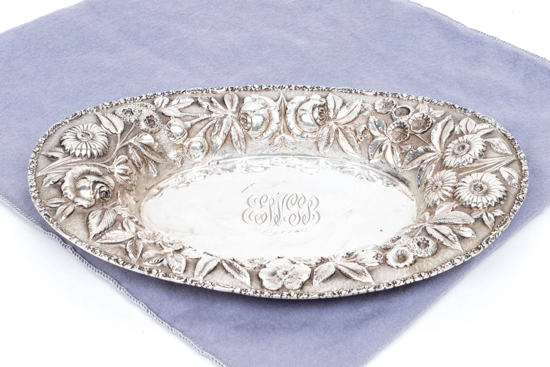 The oval bread plate is monogrammed to the center, in addition to fabulous repousse decoration to the border with flowers in relief.