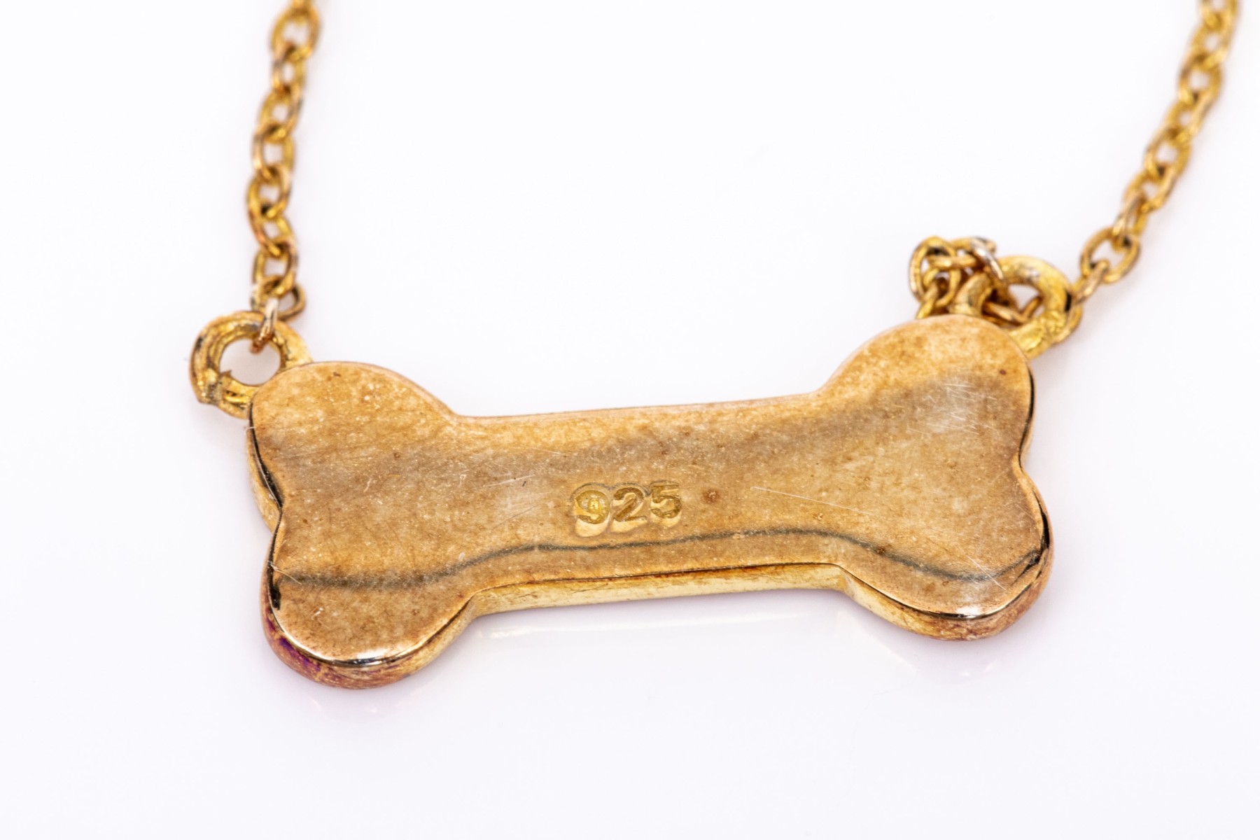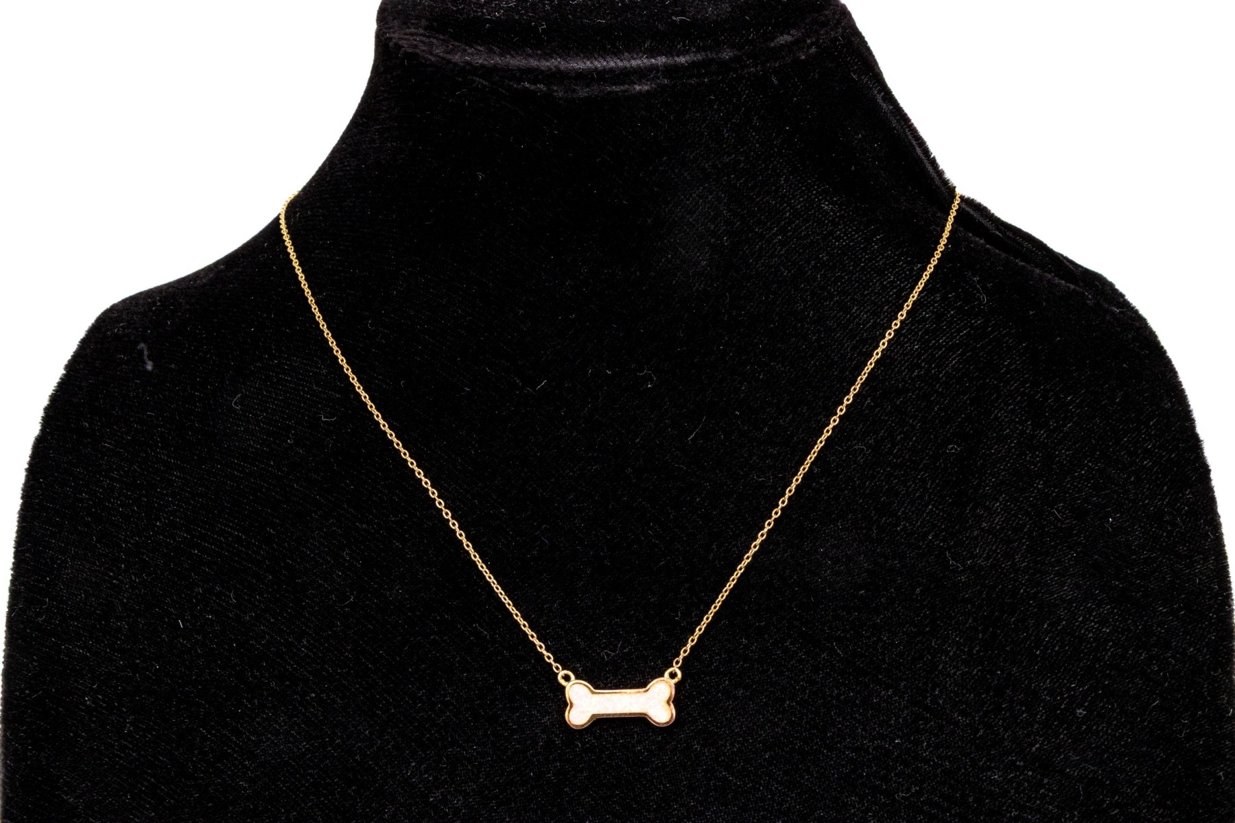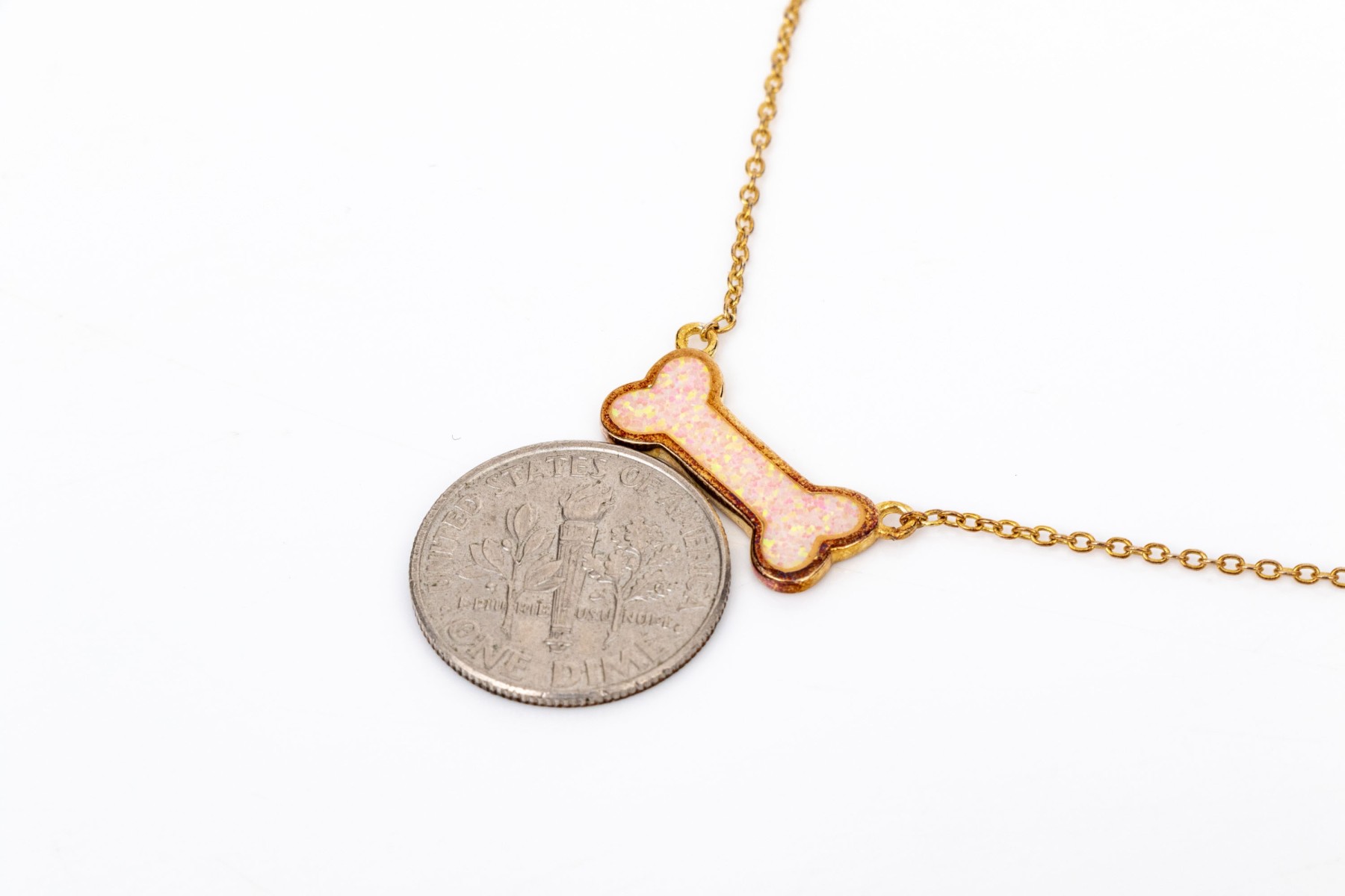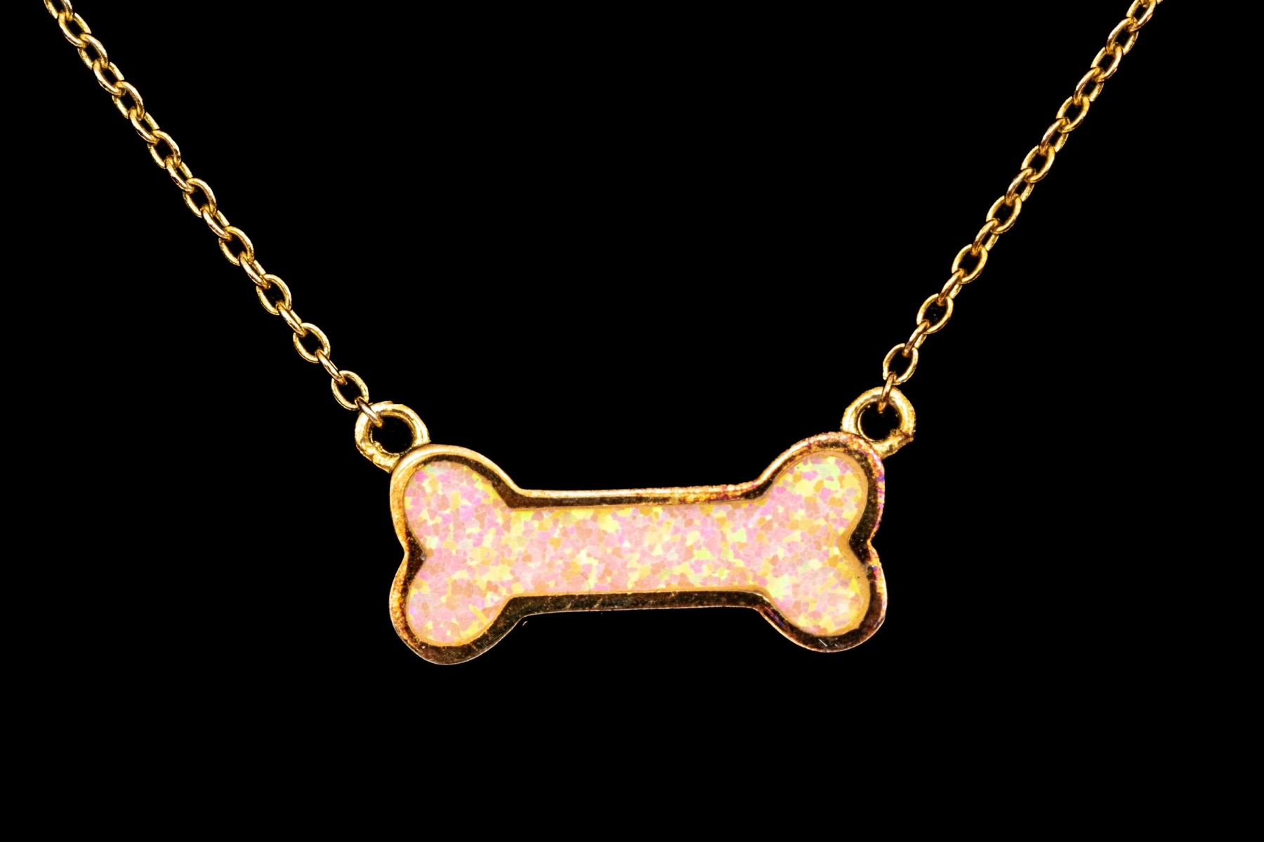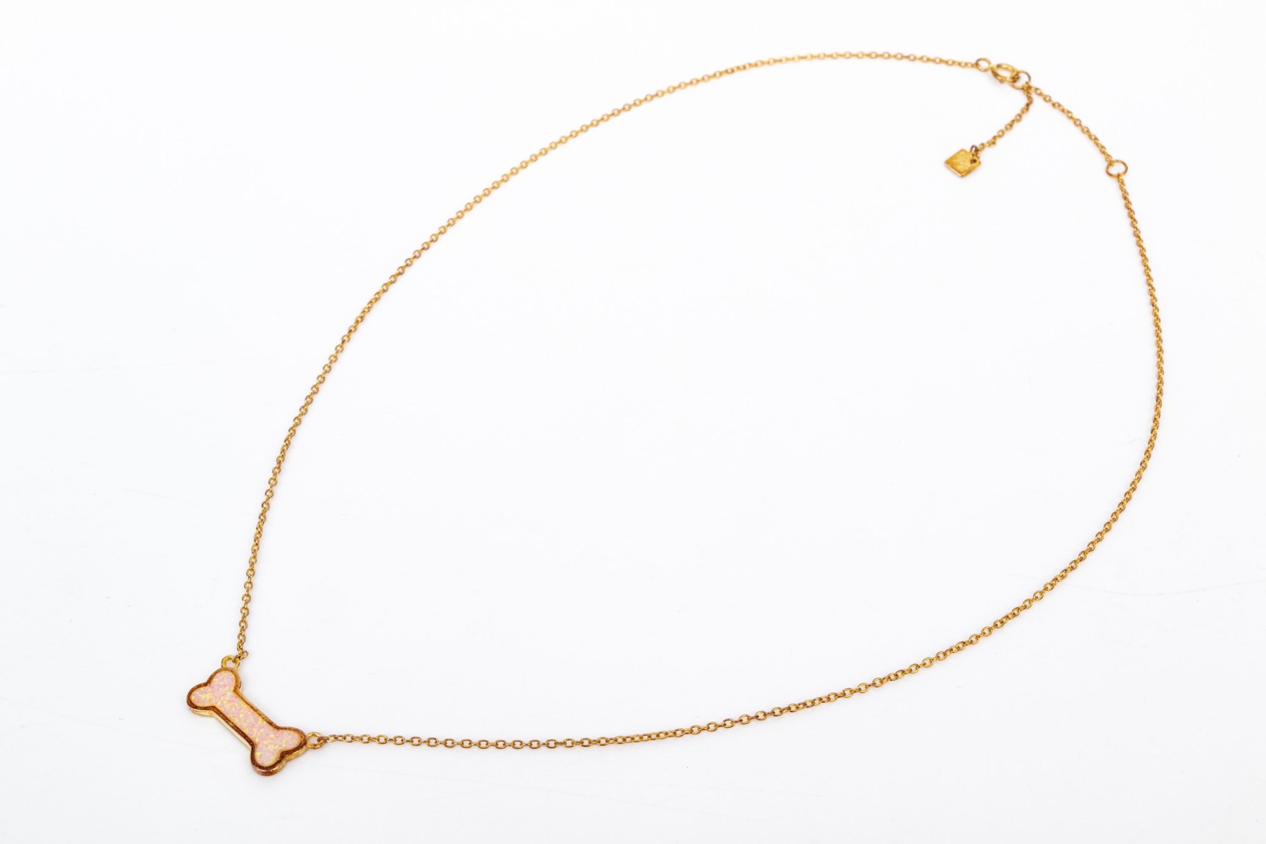 A white opal doublet set charming dogbone motif necklace, made of sterling silver rose vermeil, displayed on a fine sterling silver rose vermeil curb chain, finished with a spring ring style clasp
