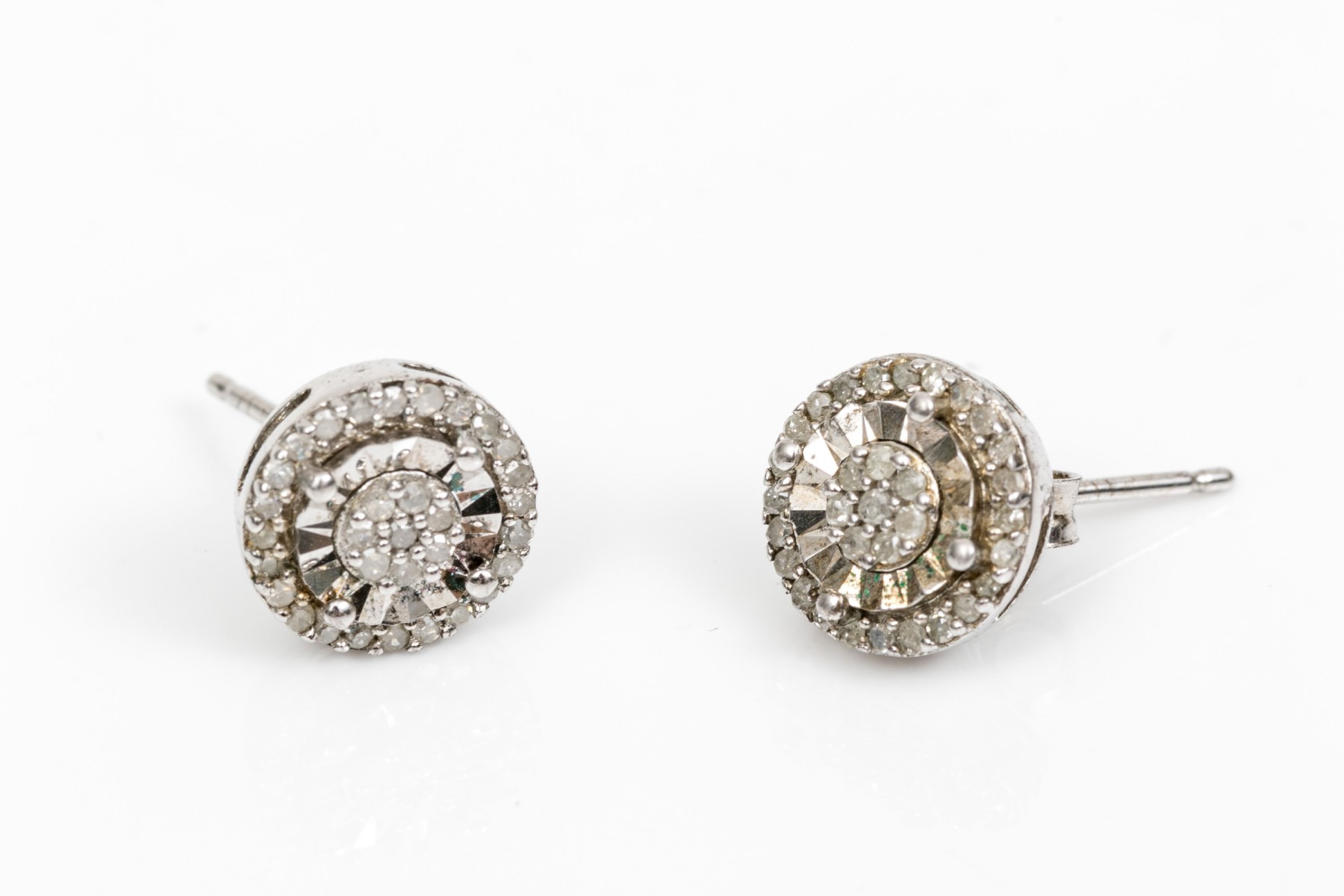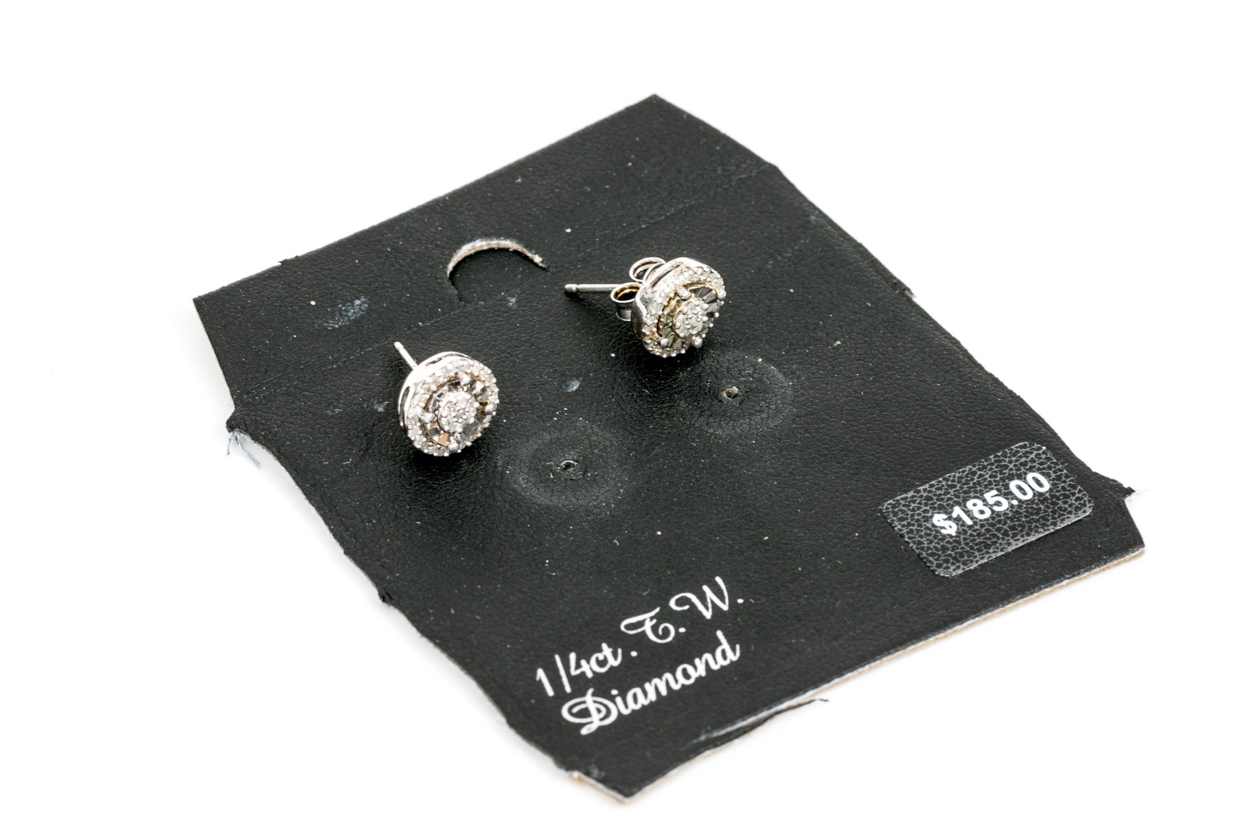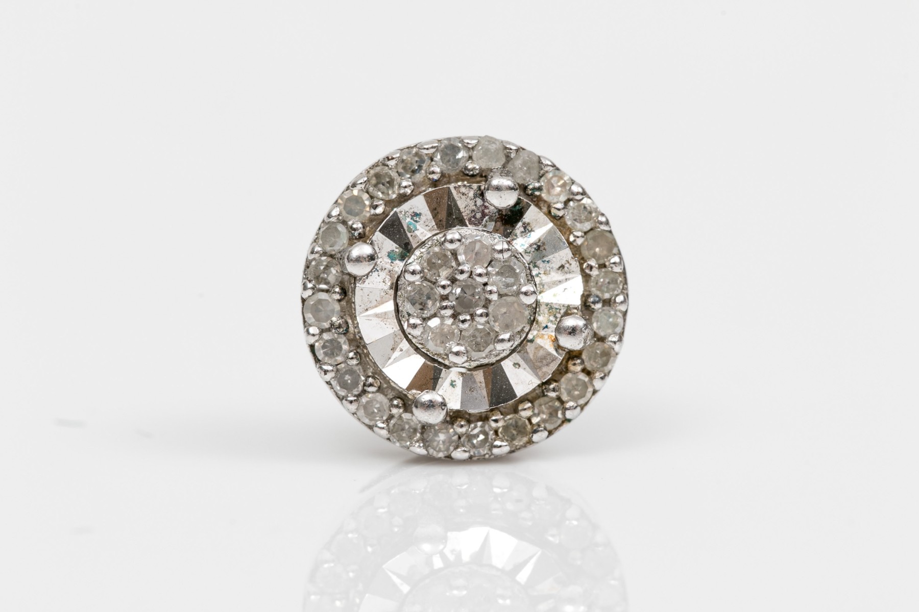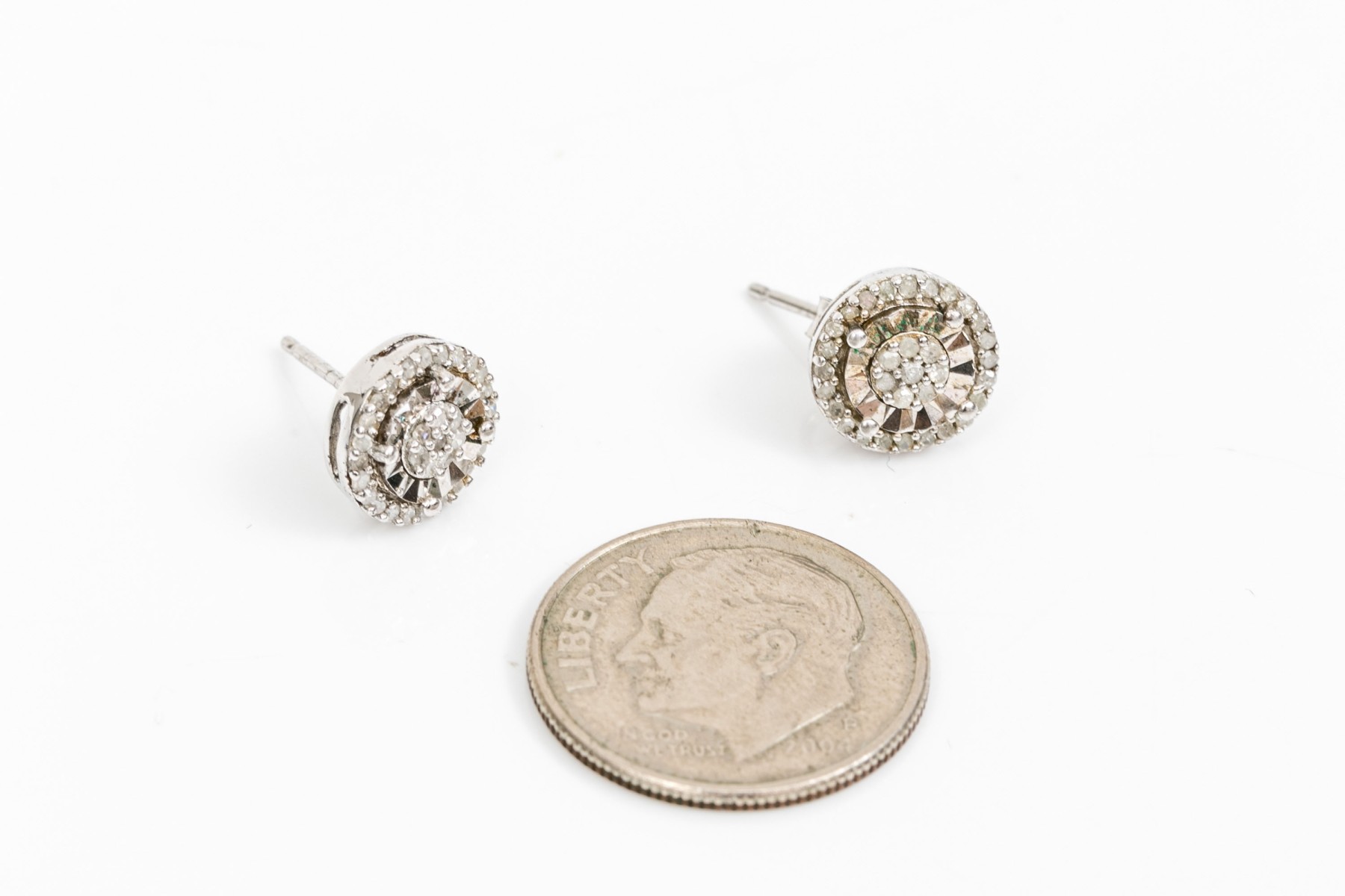Sterling silver round diamond cluster earrings, app. 0.25 TCW, prong set, finished with posts and clutch style backs, one missing