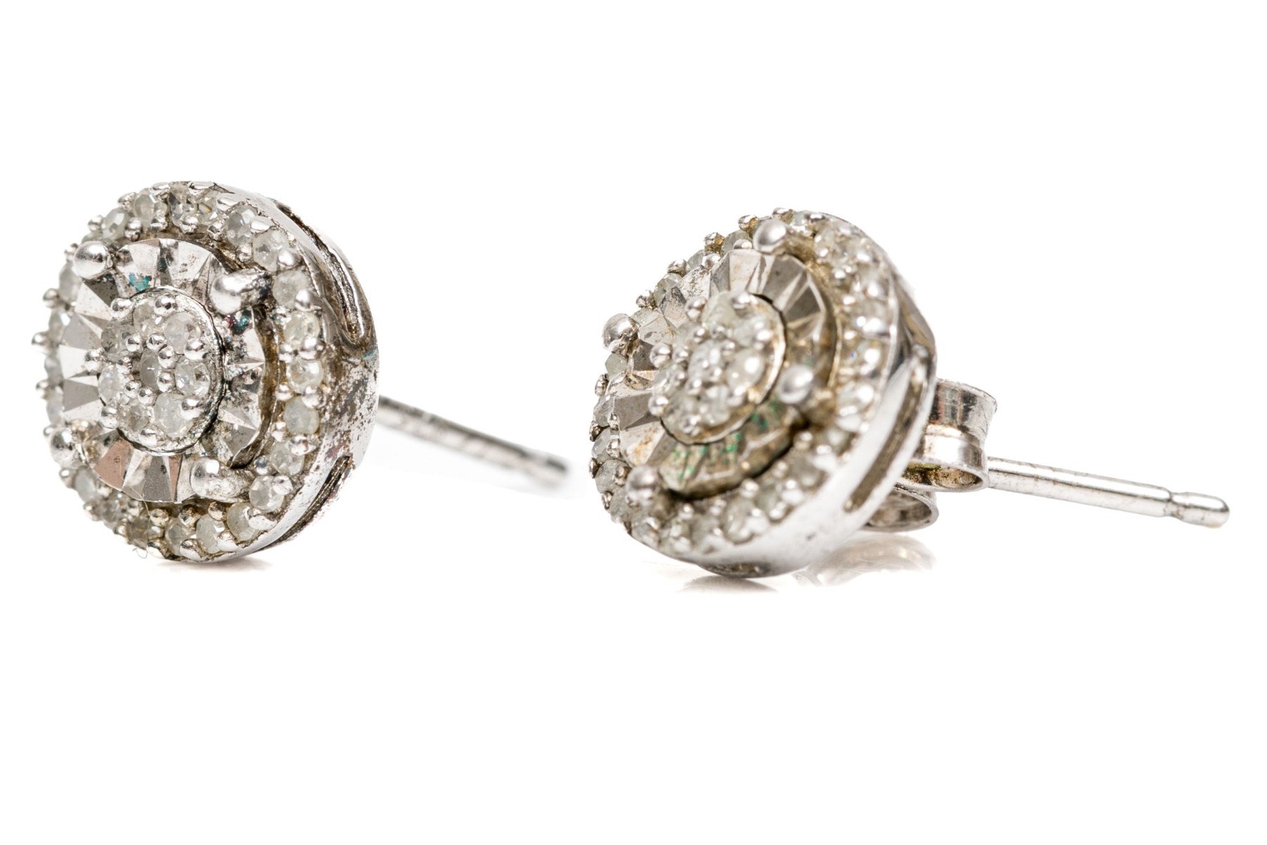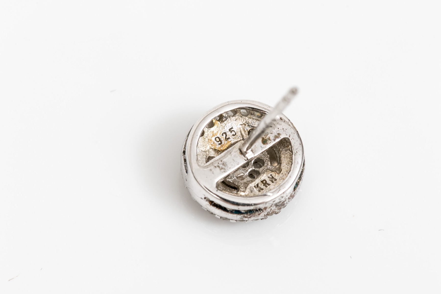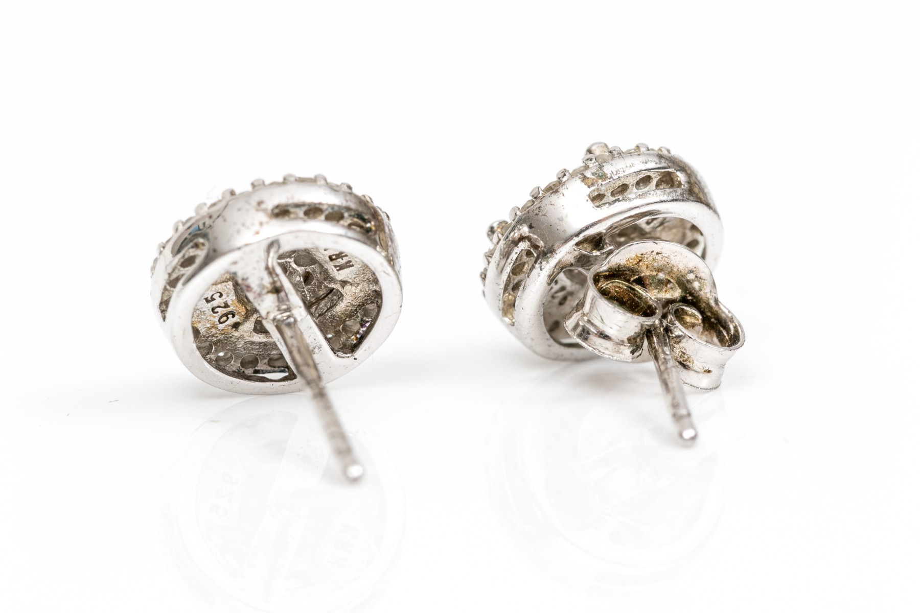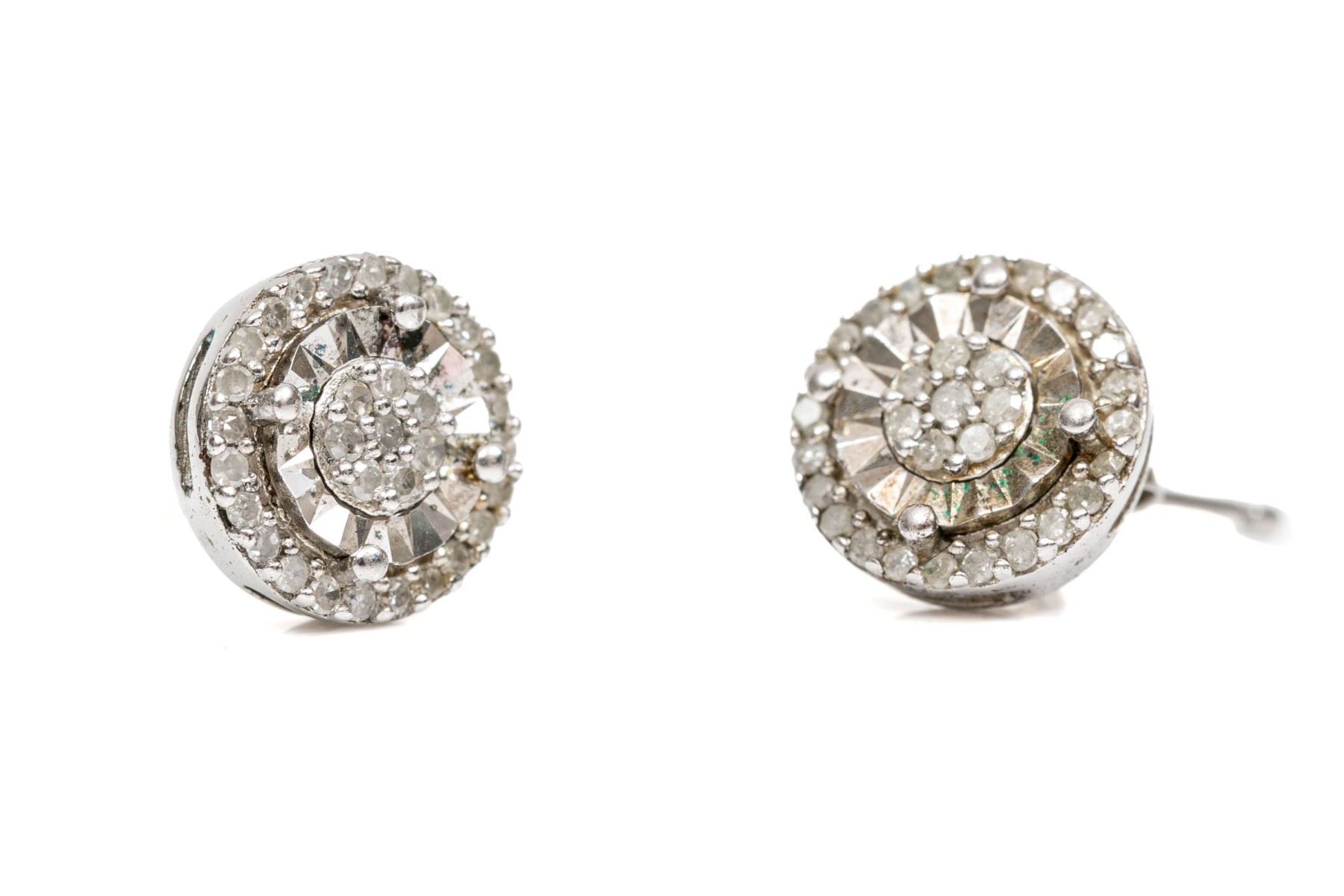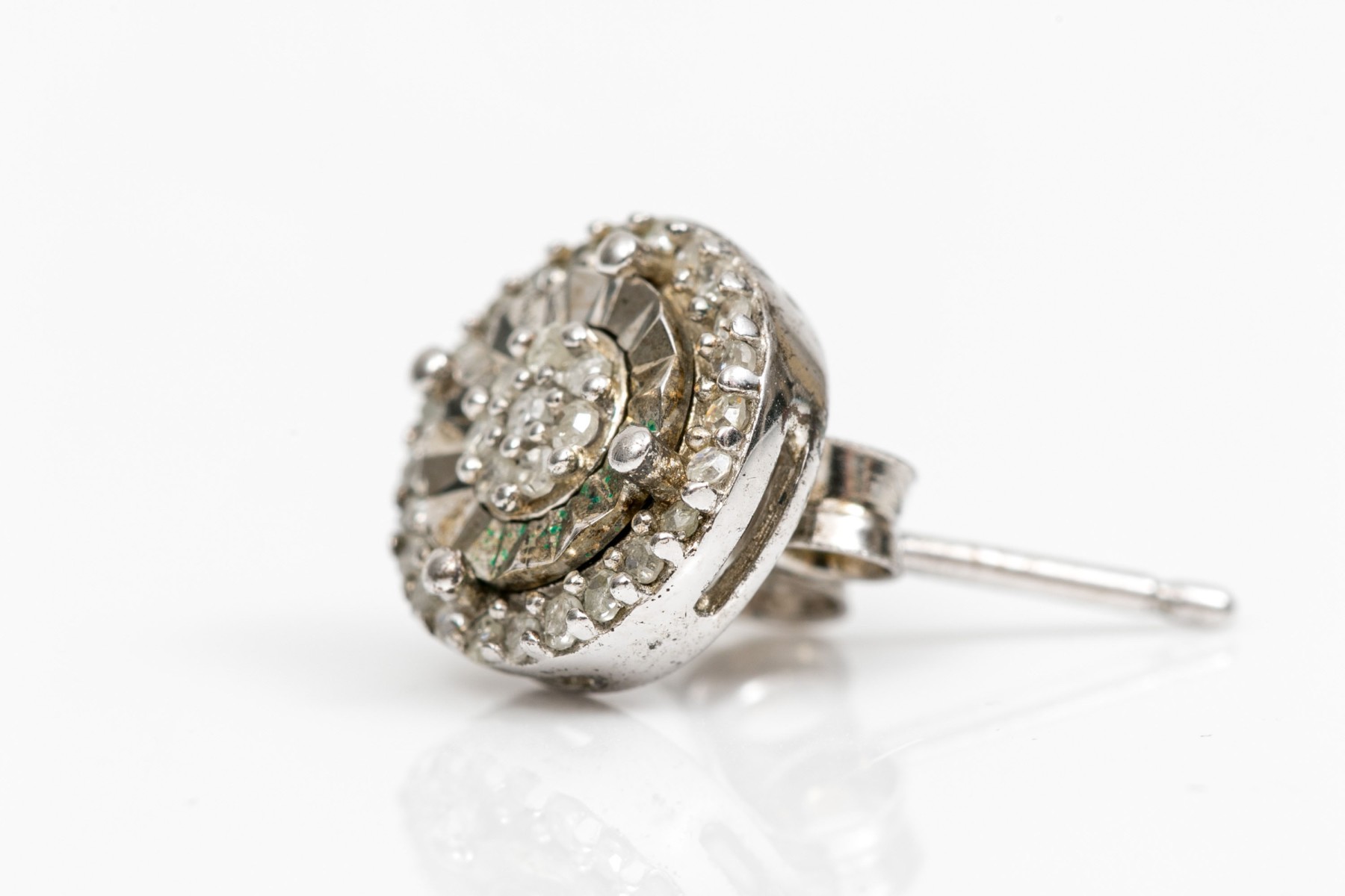 Sterling silver round diamond cluster earrings, app. 0.25 TCW, prong set, finished with posts and clutch style backs, one missing