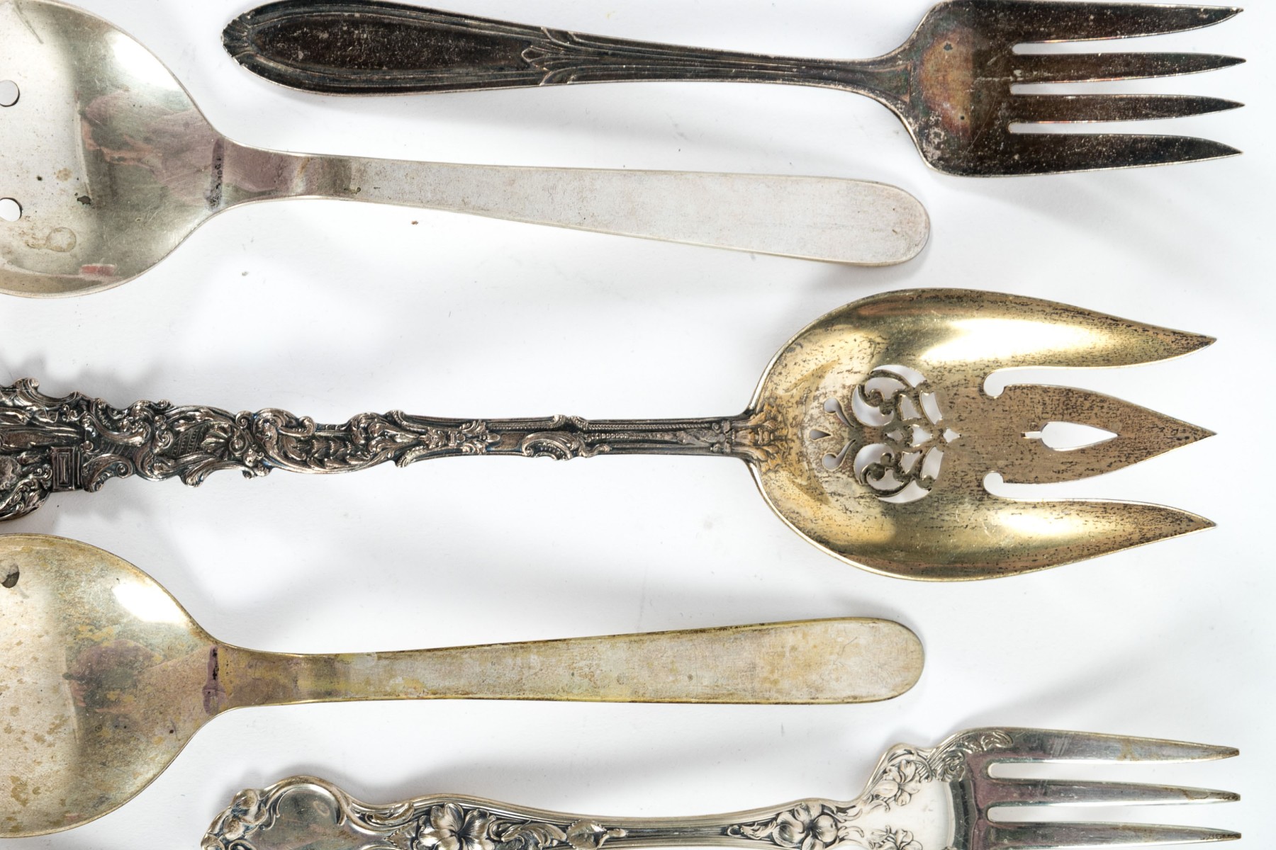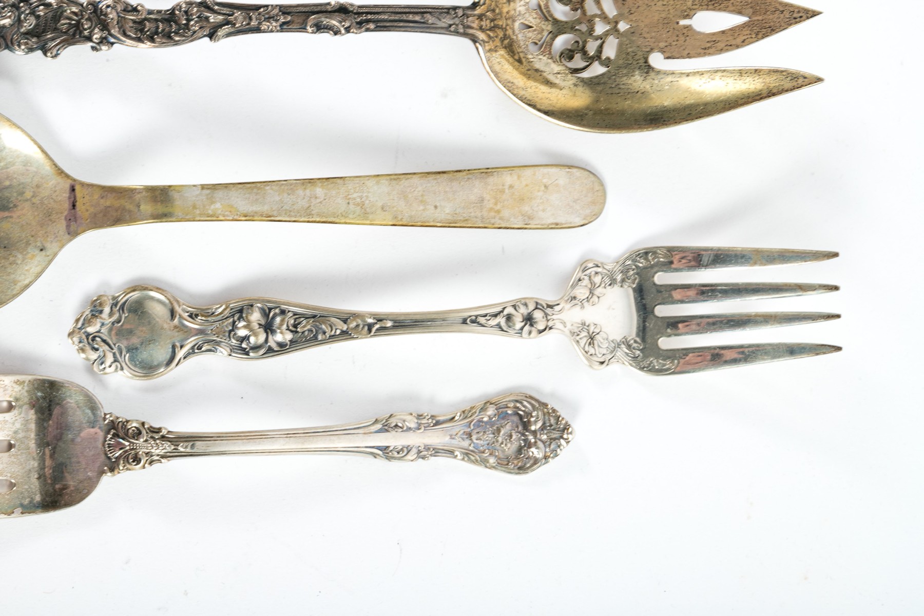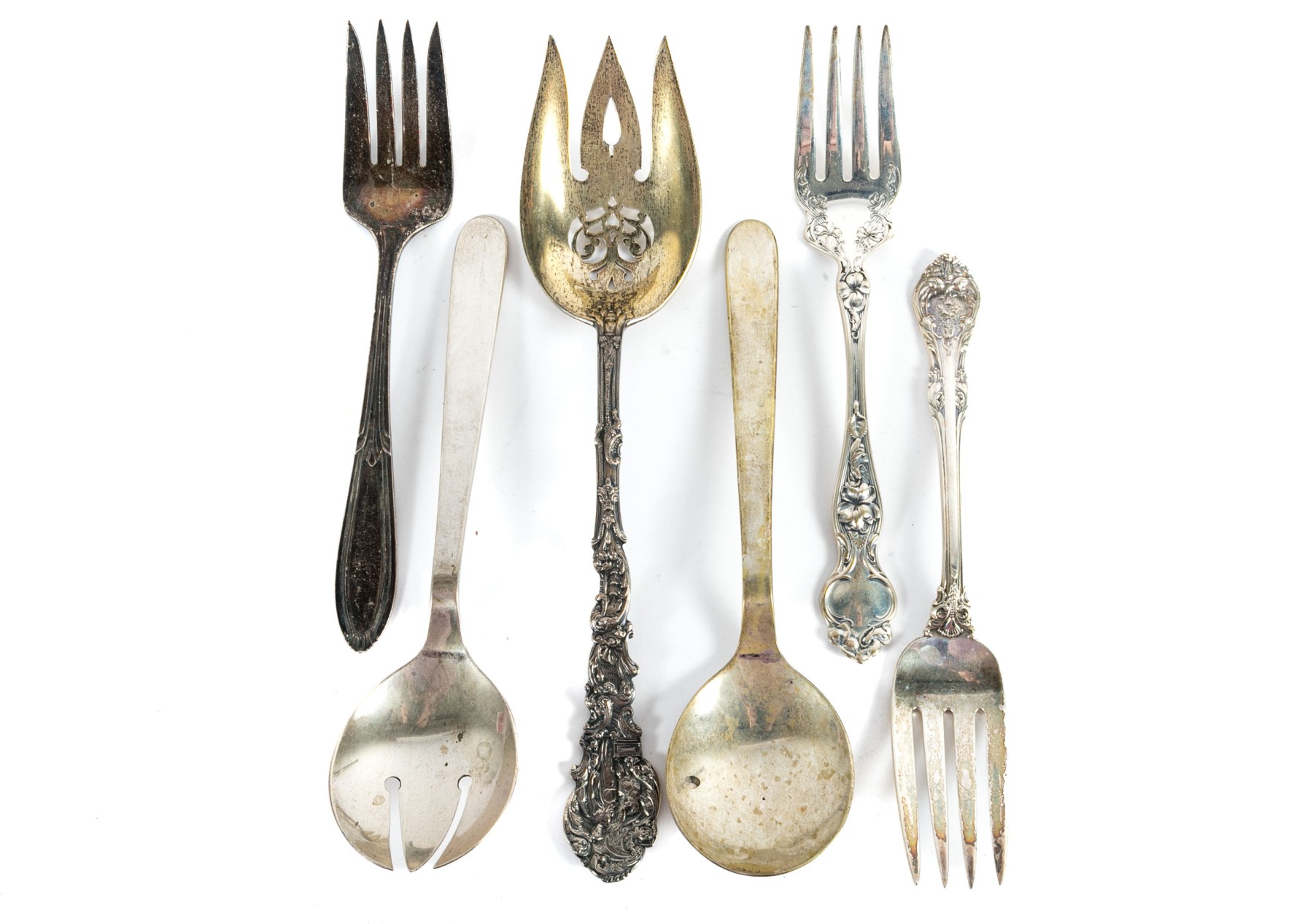 A collection of sterling silver serving utensils with makers include Gorham and R. Wallace & Son. Includes a spoon and spork in simple, matching designs; two similar forks, a fork with an Art Deco style, and a large pierced fork with ornate figural relief along the handle.