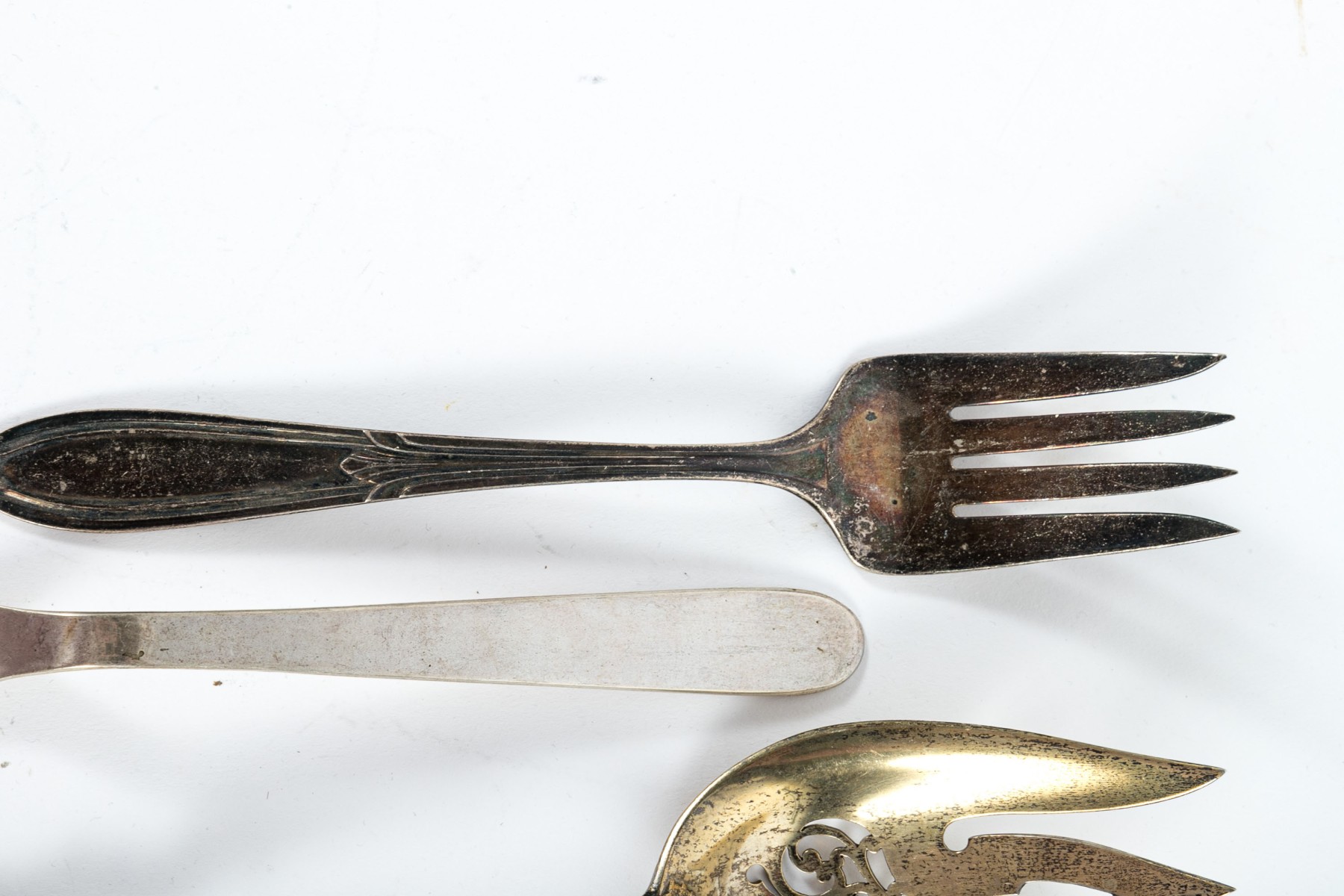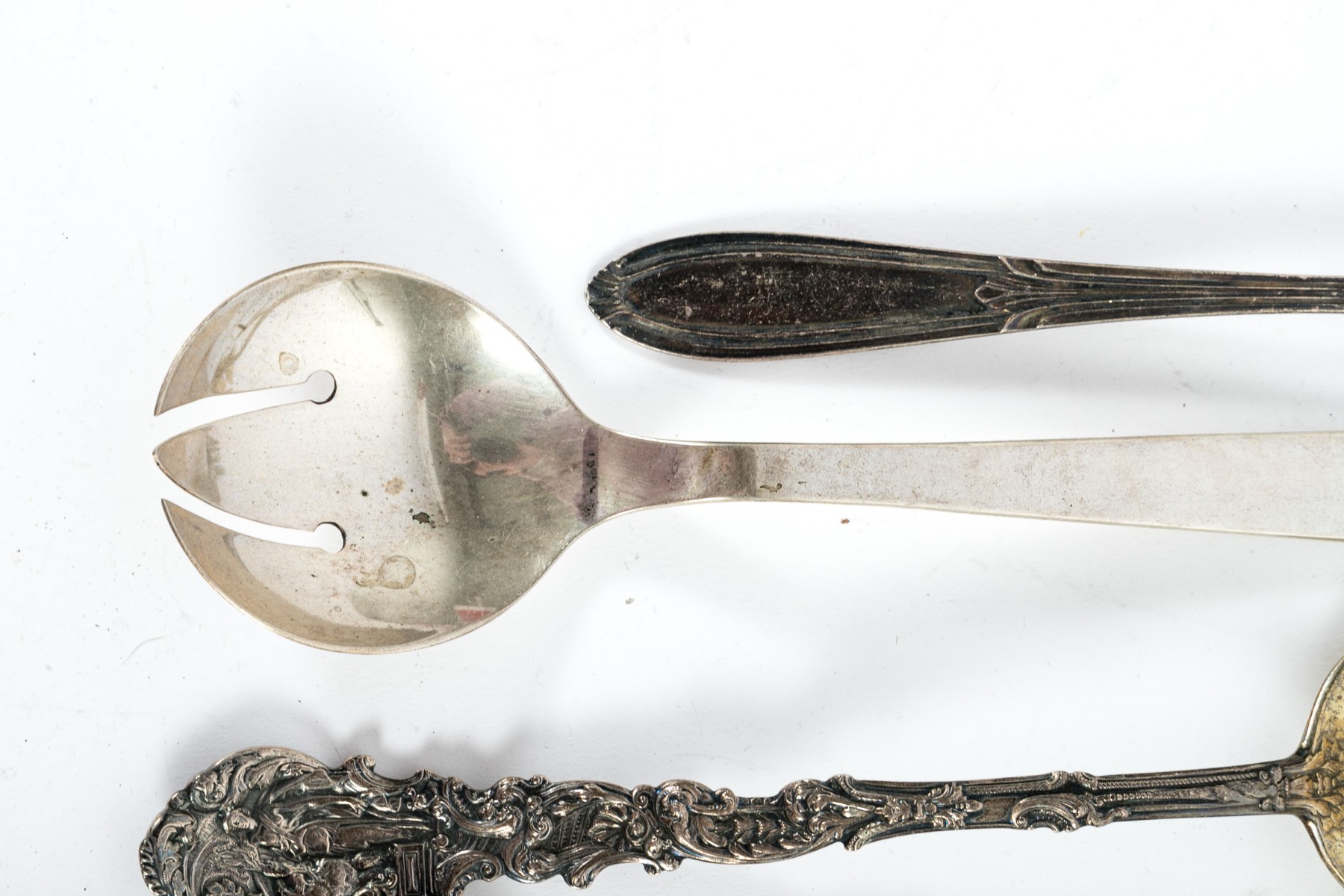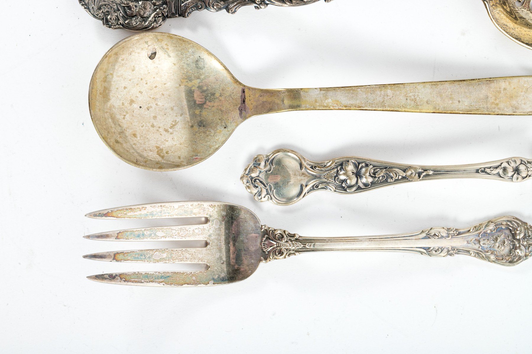 A collection of sterling silver serving utensils with makers include Gorham and R. Wallace & Son. Includes a spoon and spork in simple, matching designs; two similar forks, a fork with an Art Deco style, and a large pierced fork with ornate figural relief along the handle.