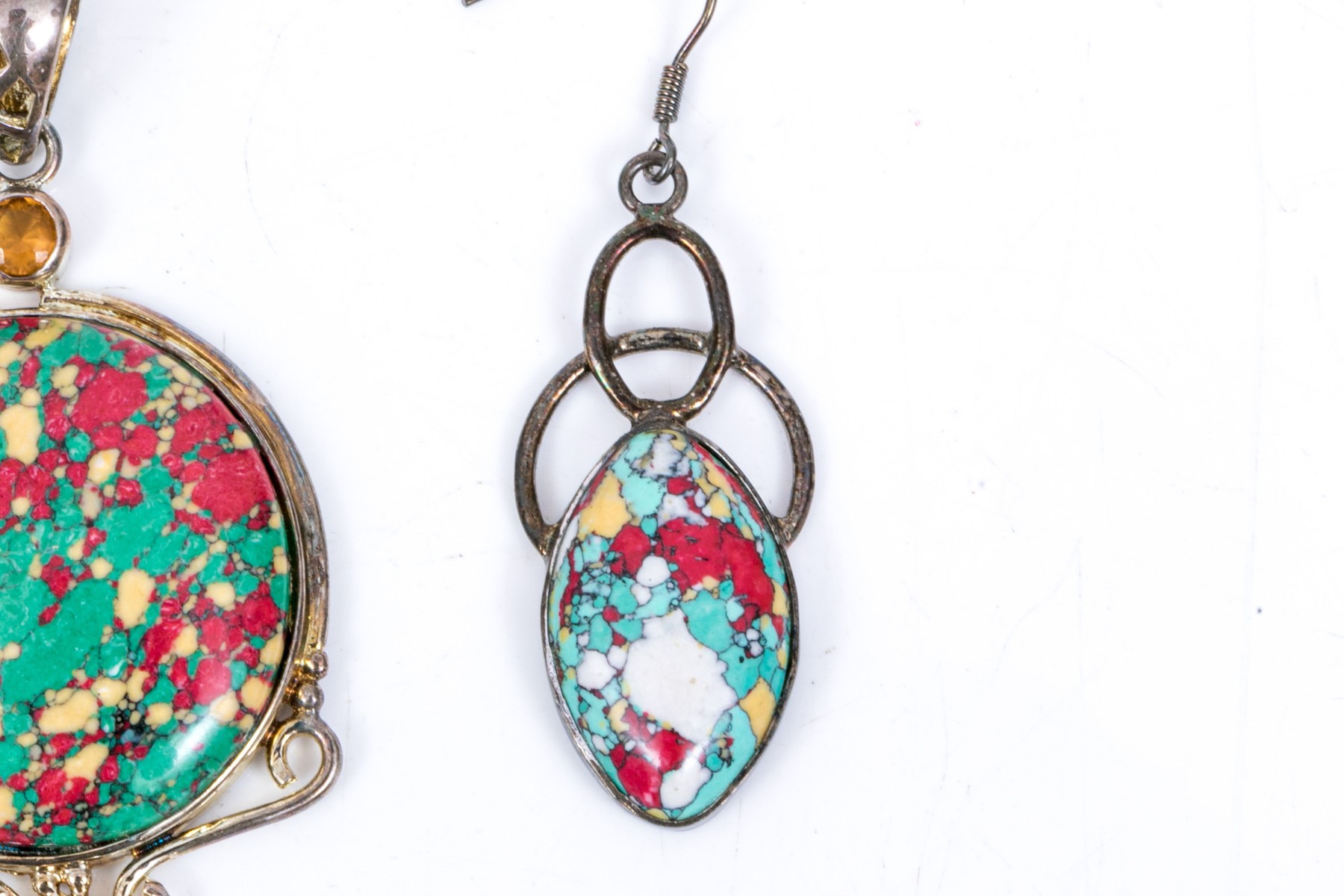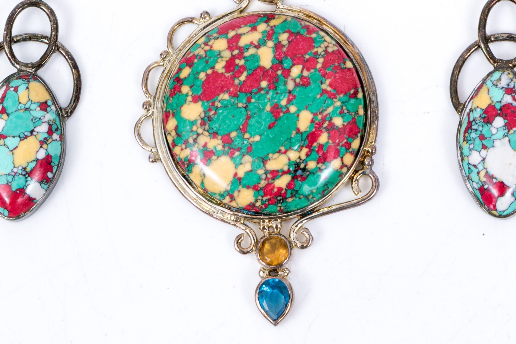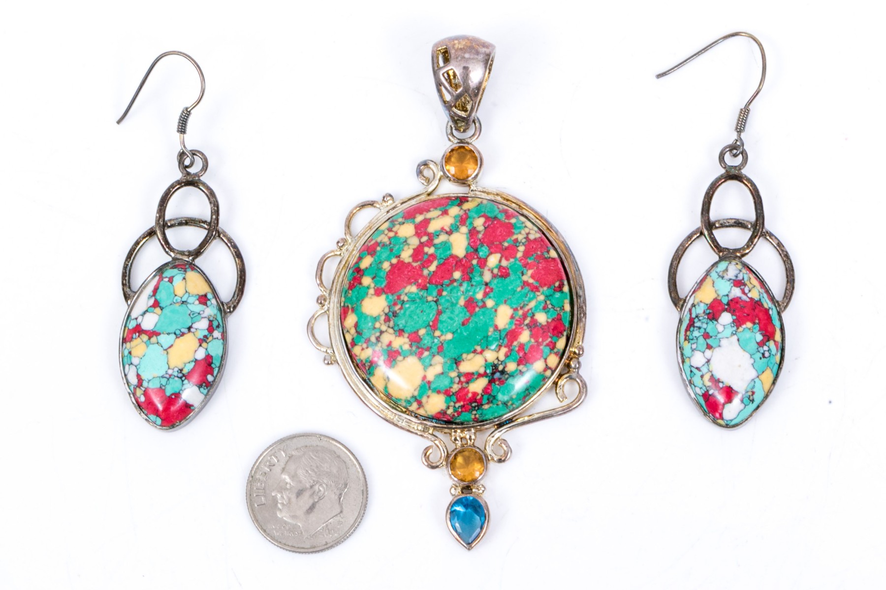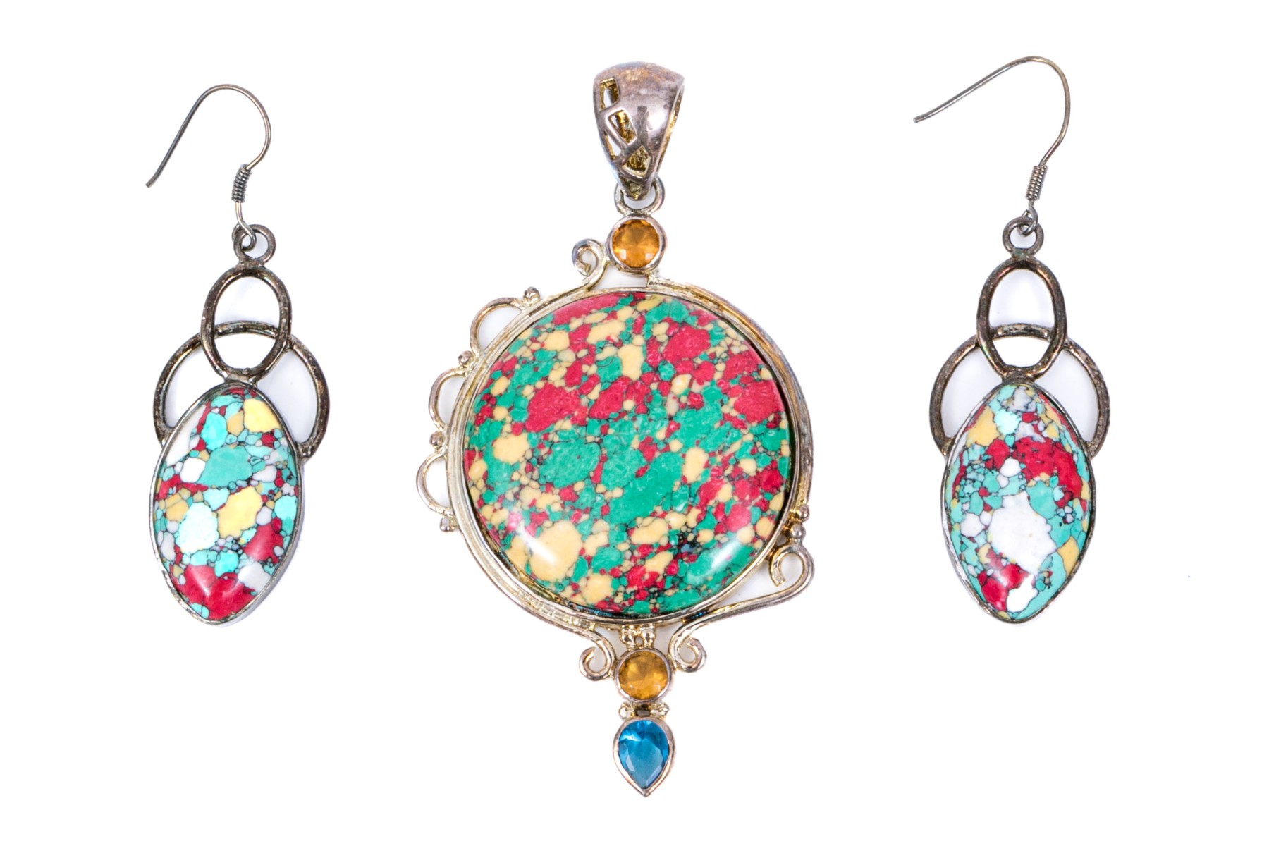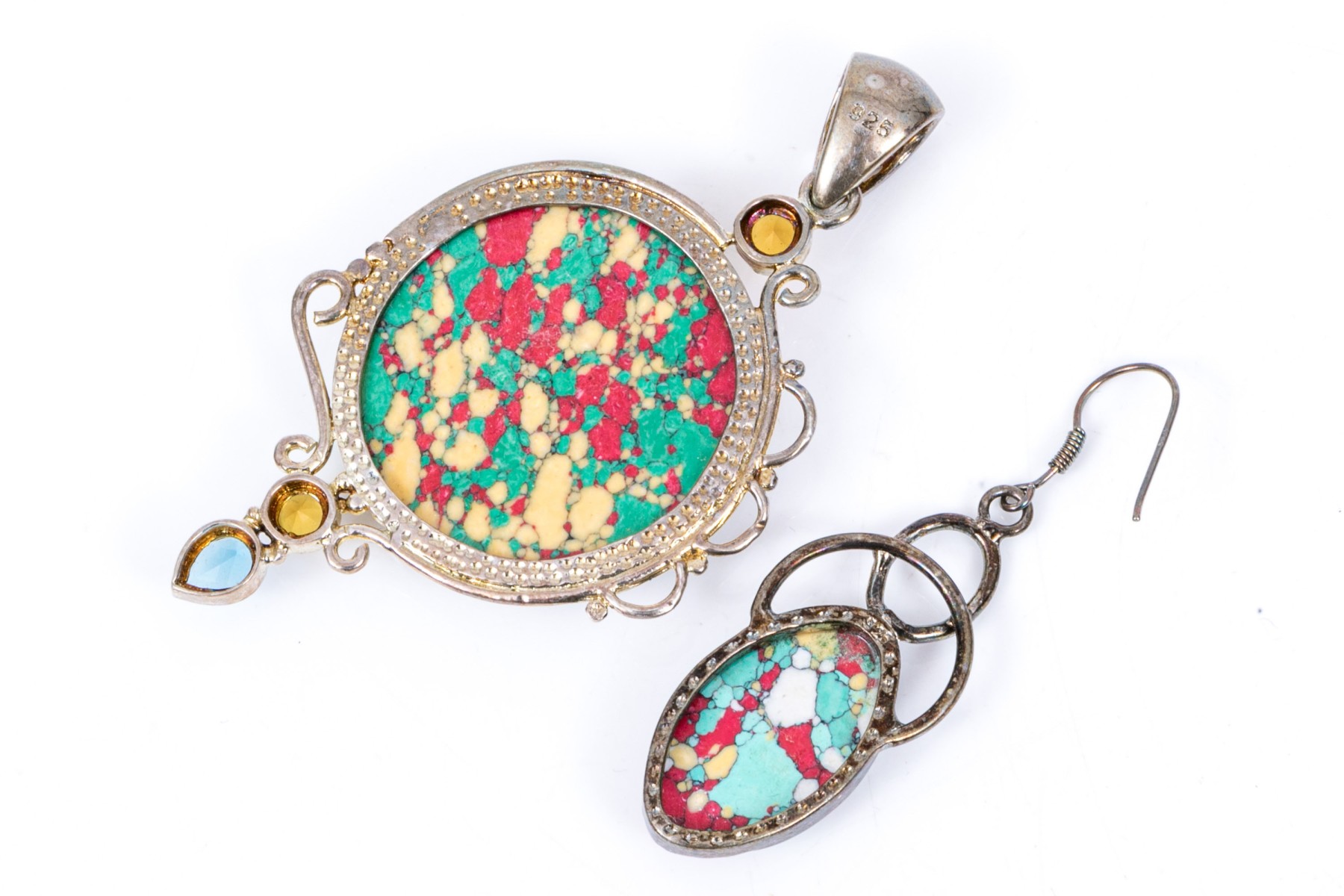 Sterling silver striking multi color glass and composite pendant and matching earrings