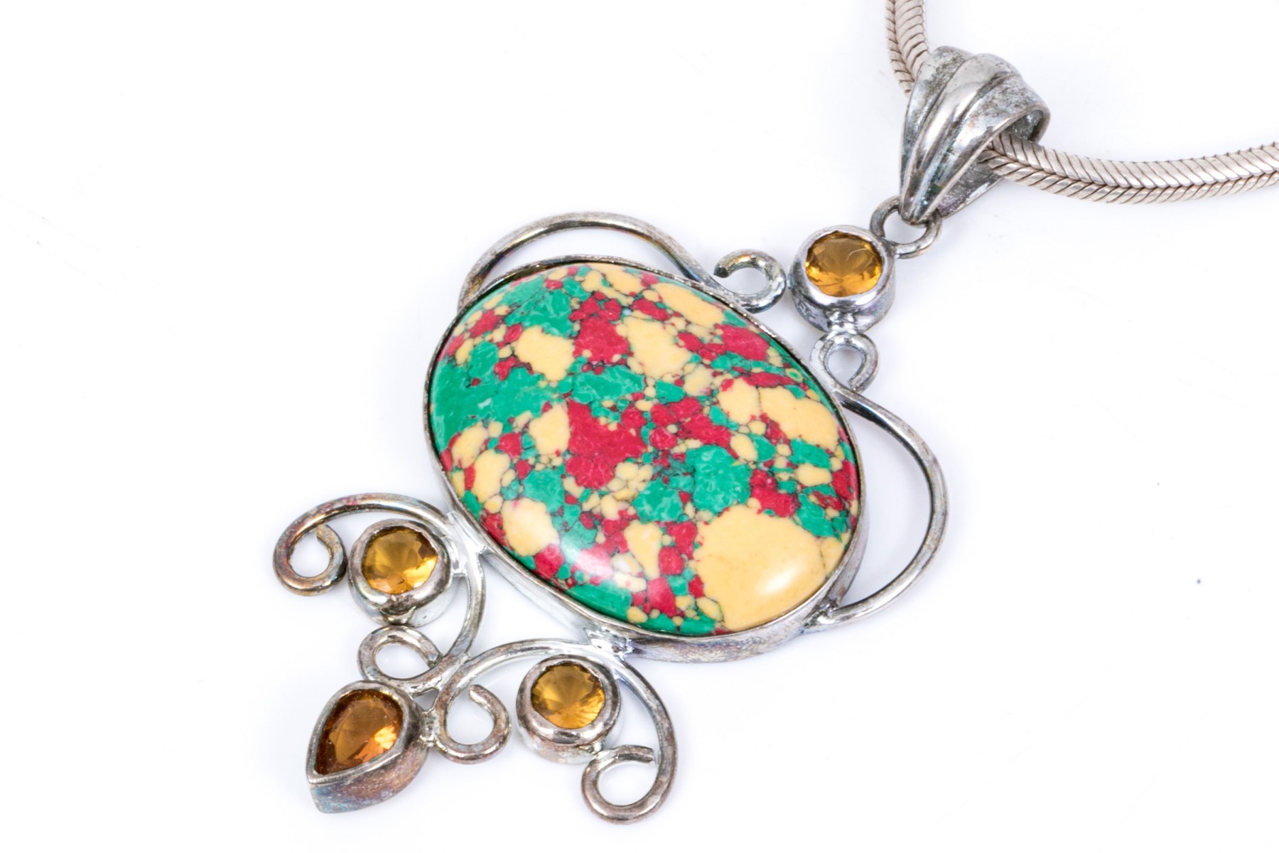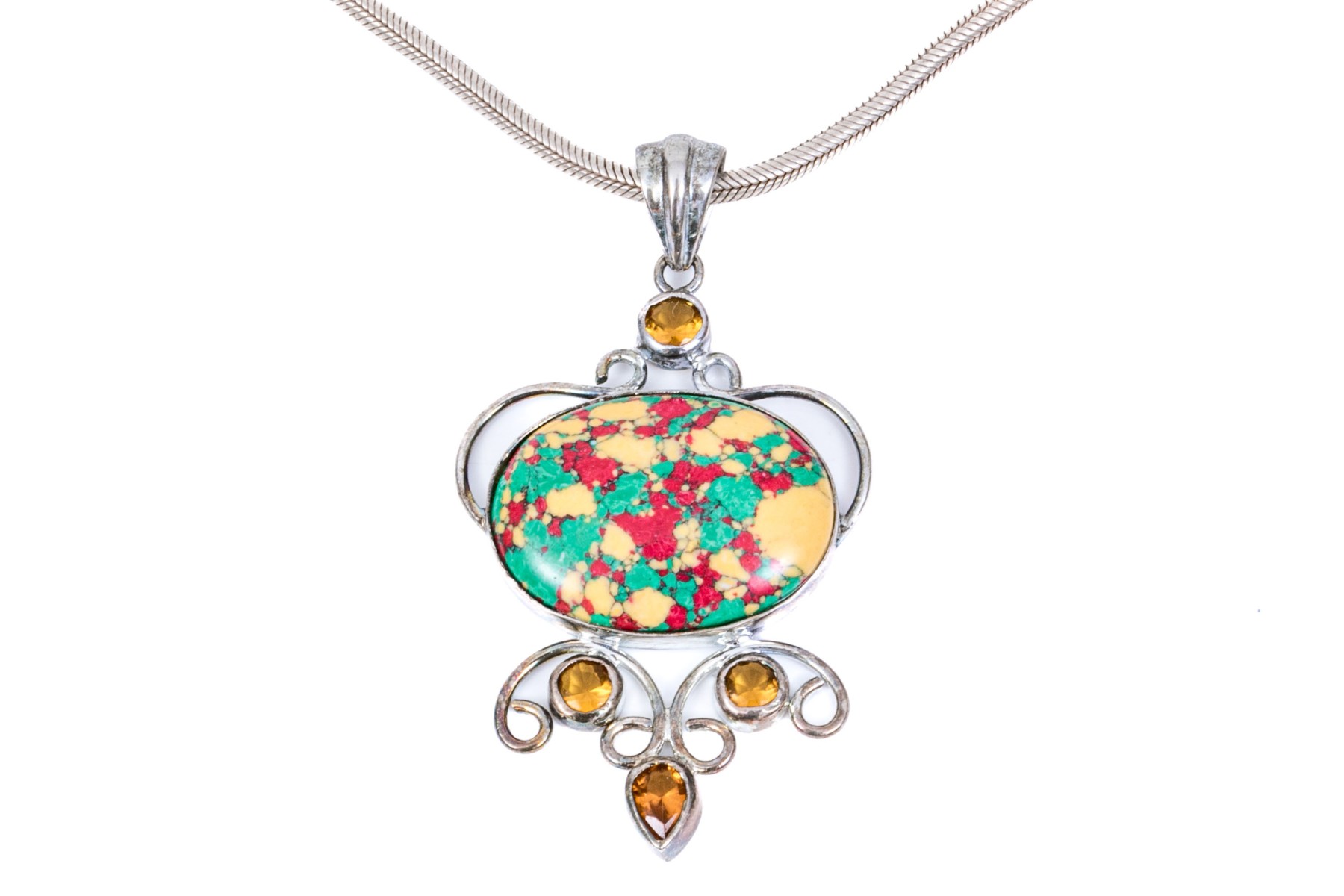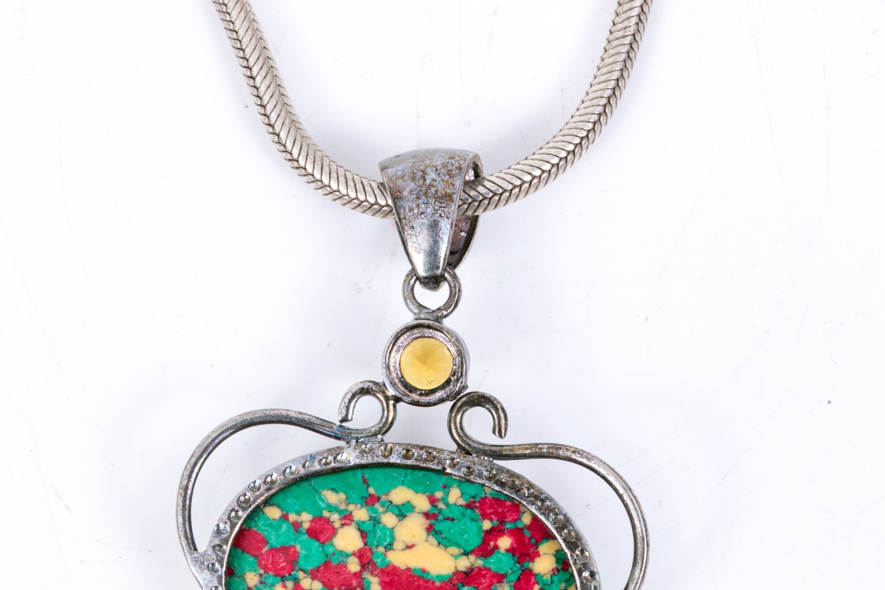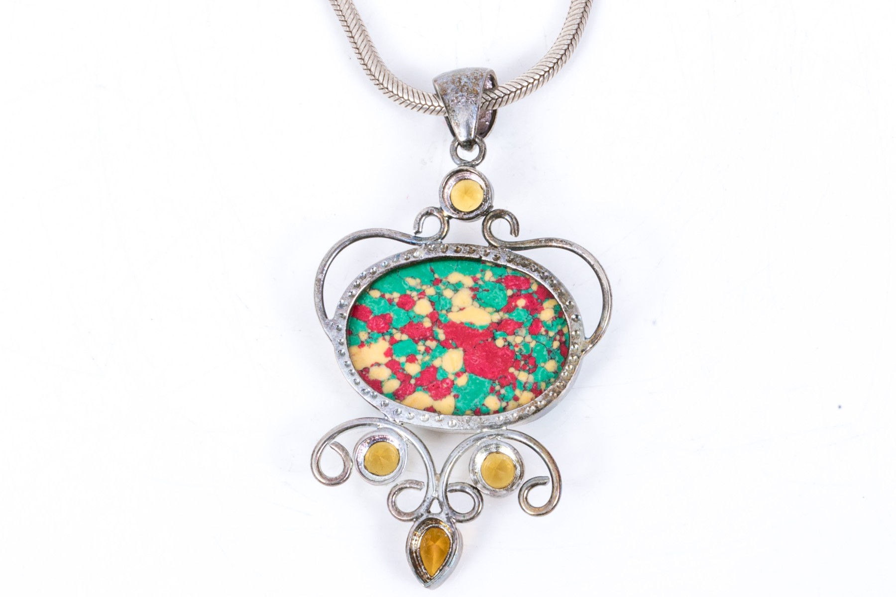 Sterling silver striking multi color glass and composite pendant, on chunky snake chain, finished with a hook style clasp