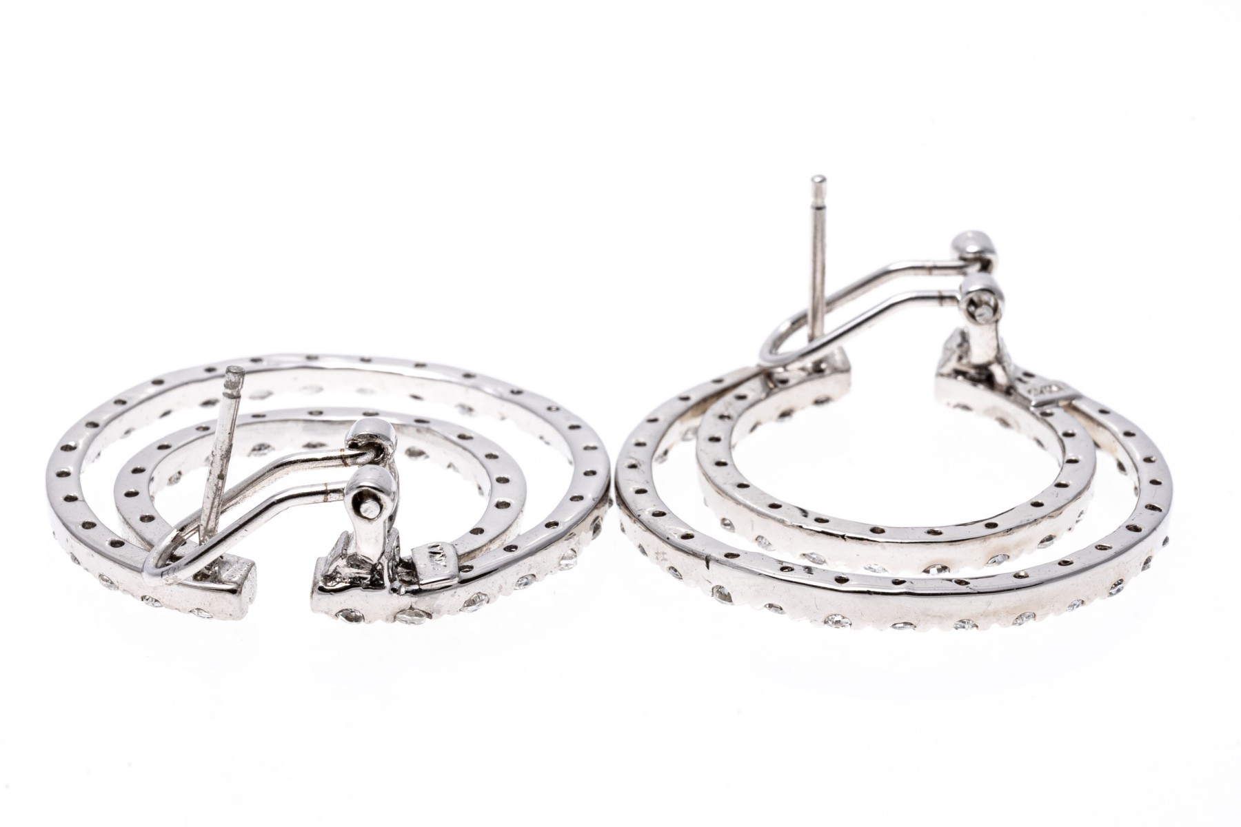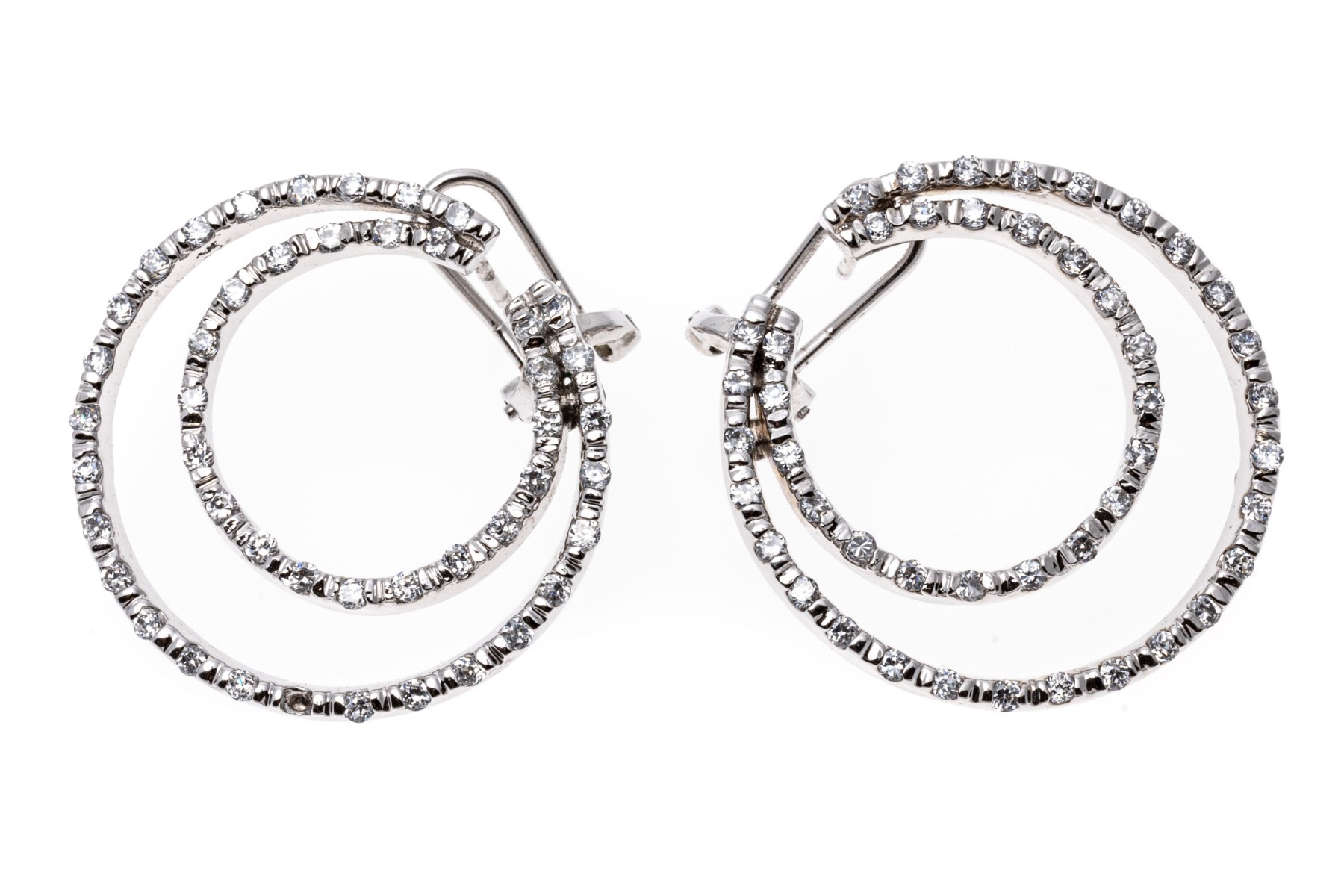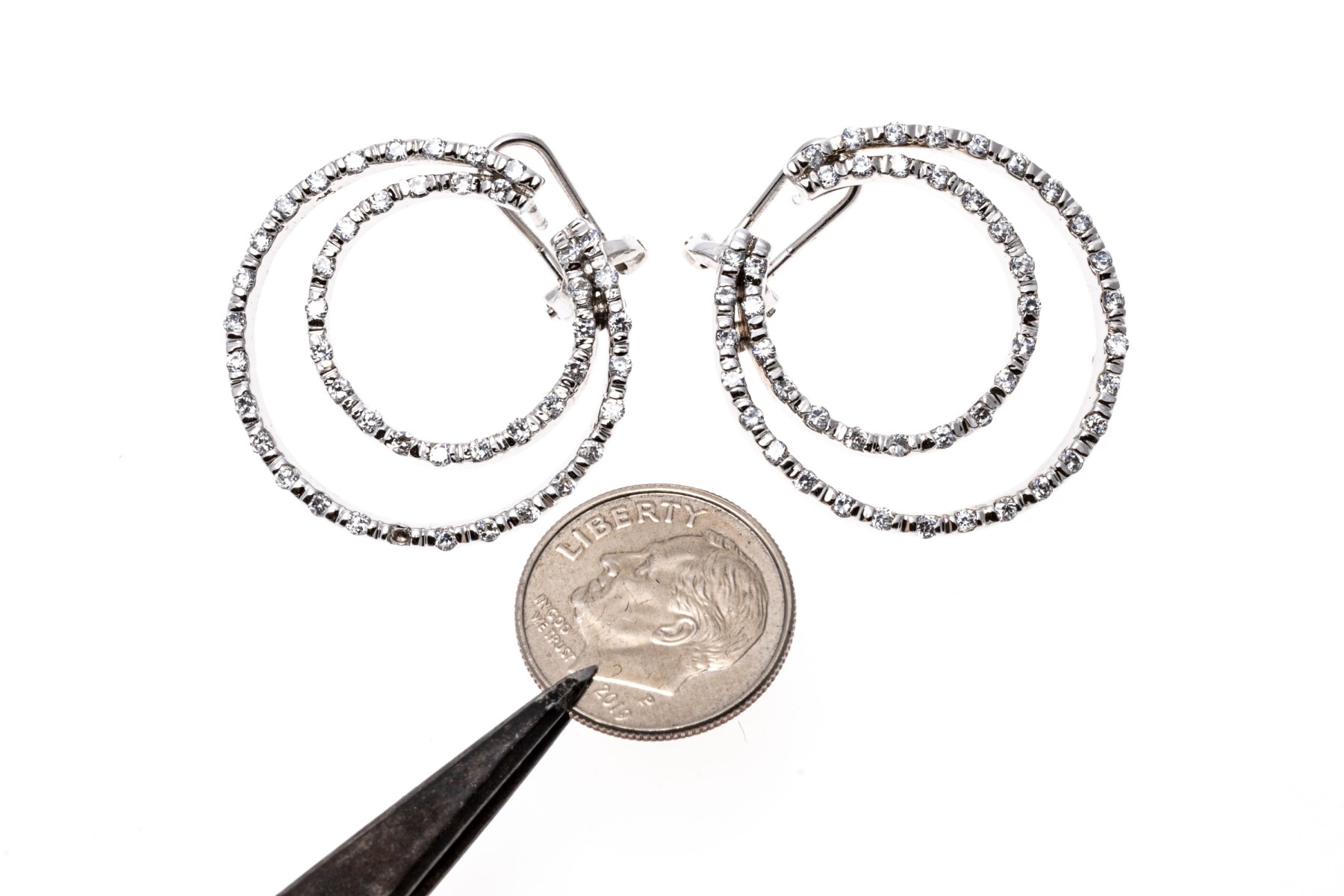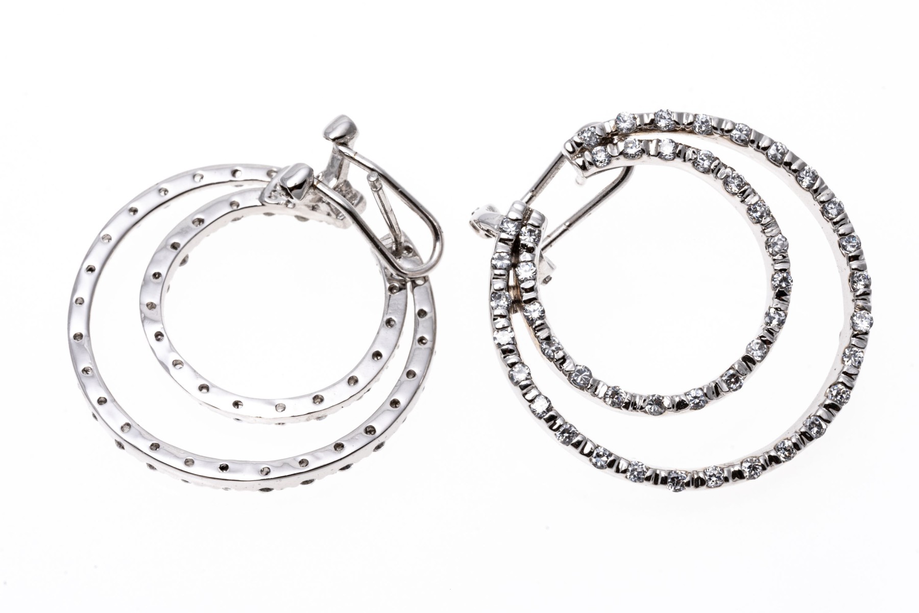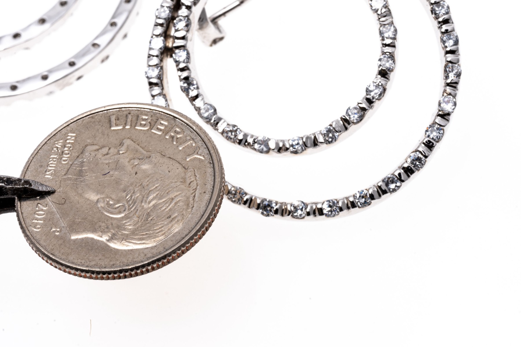 Sterling silver cz earrings. These striking opposing earrings are an on ear button style, set with round brilliant cut cz stones set into two concentric connected circles, to make up an open crescent moon shape. The earrings have posts, with omega style backs.