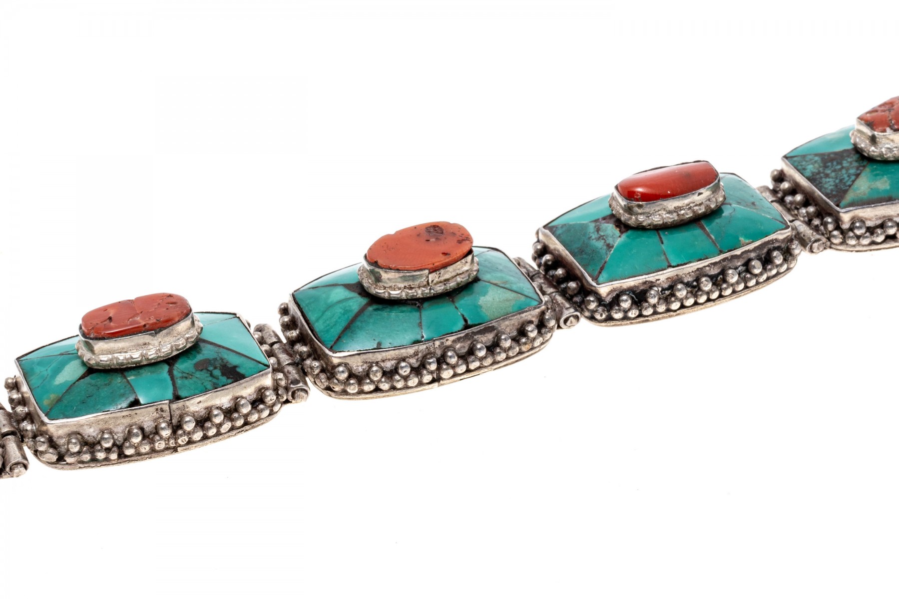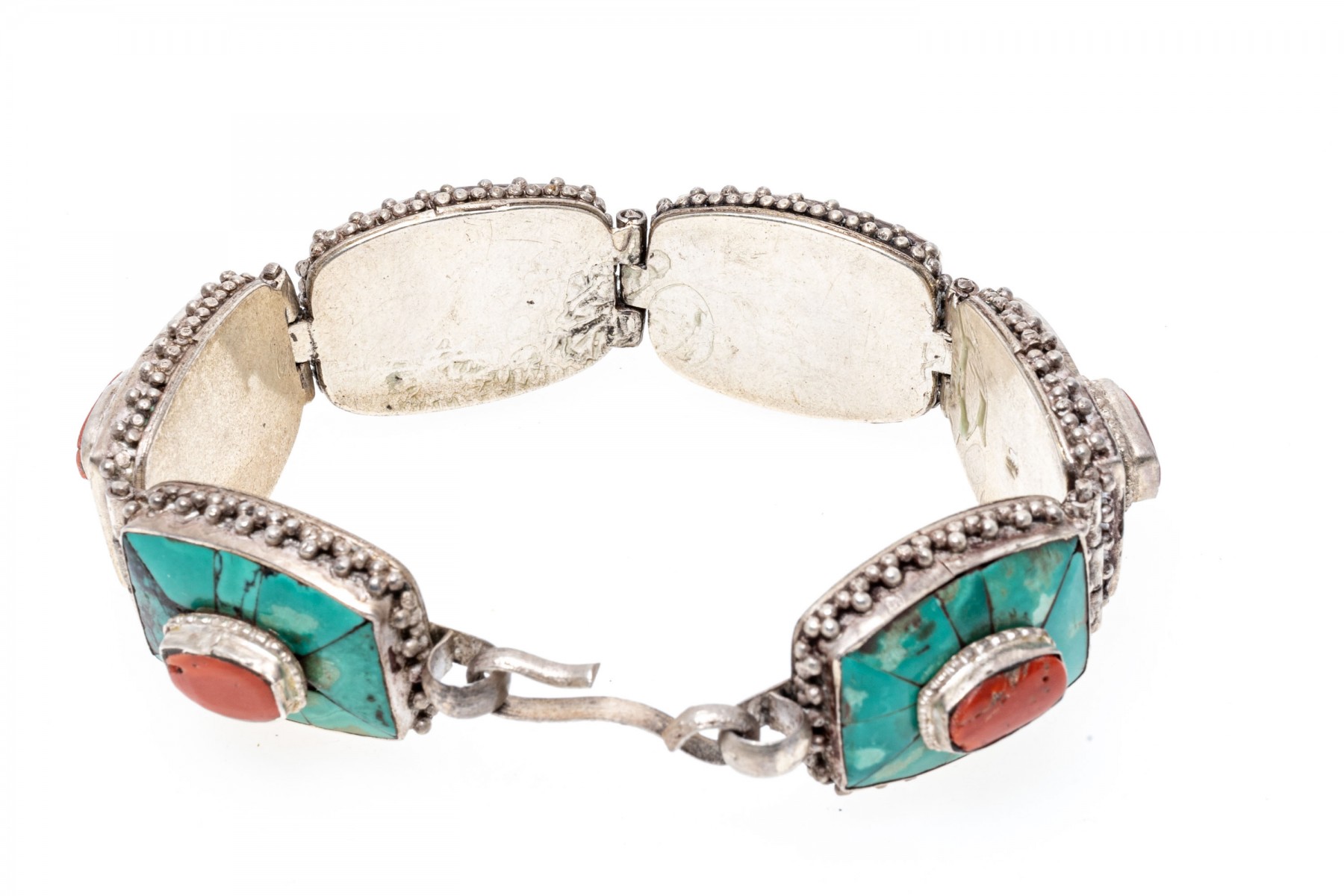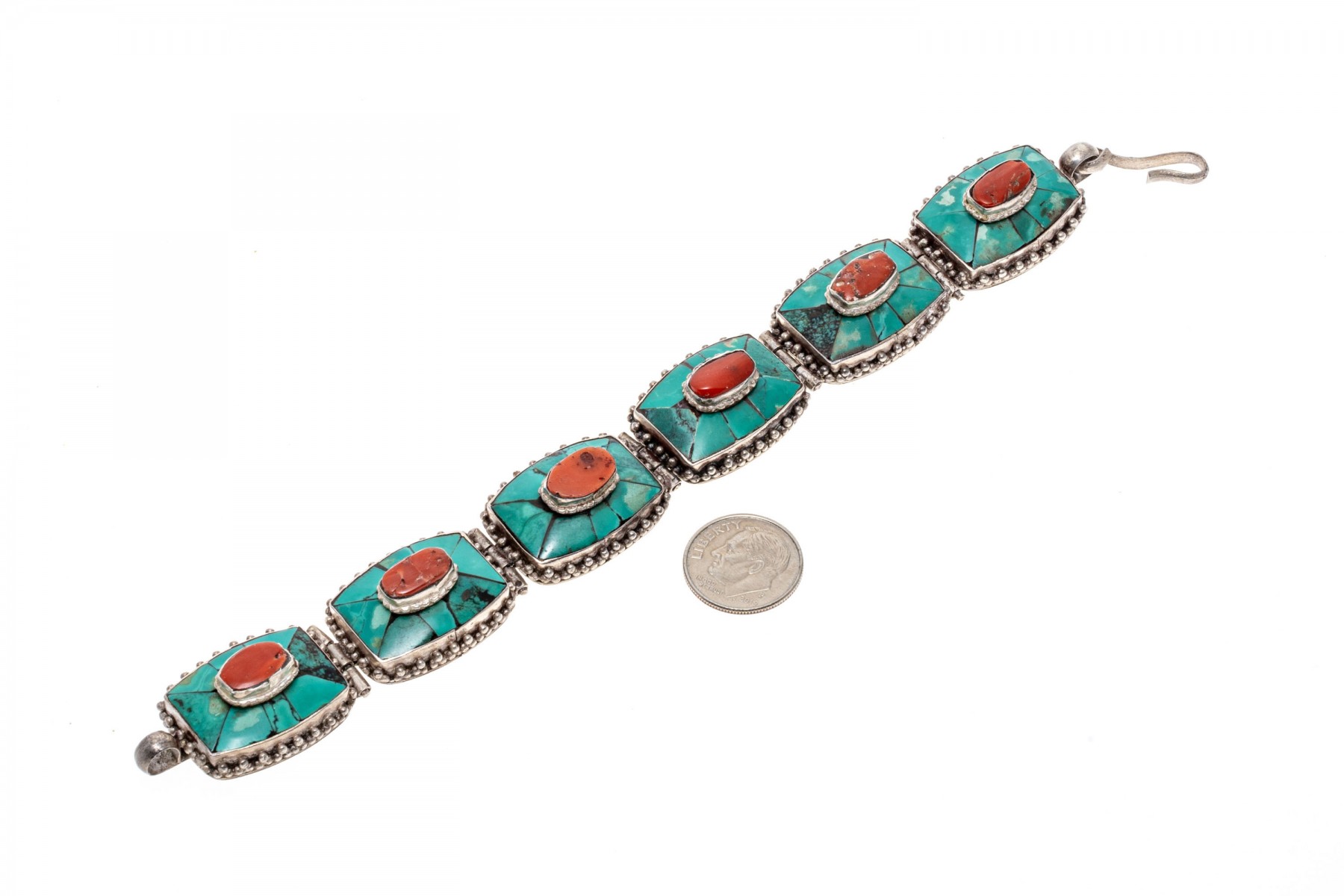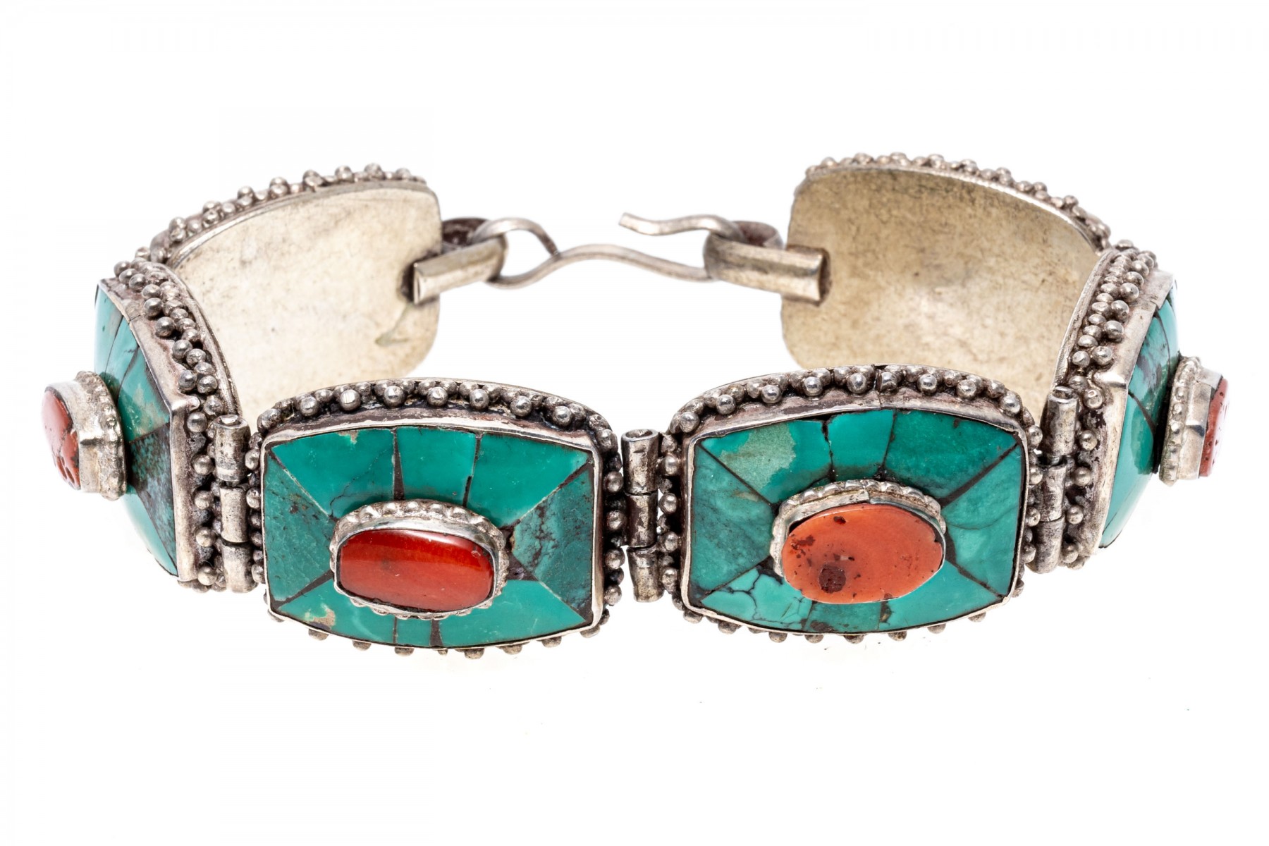 Sterling silver striking Southwestern motif turquoise and coral link bracelet, finished with a hook style clasp