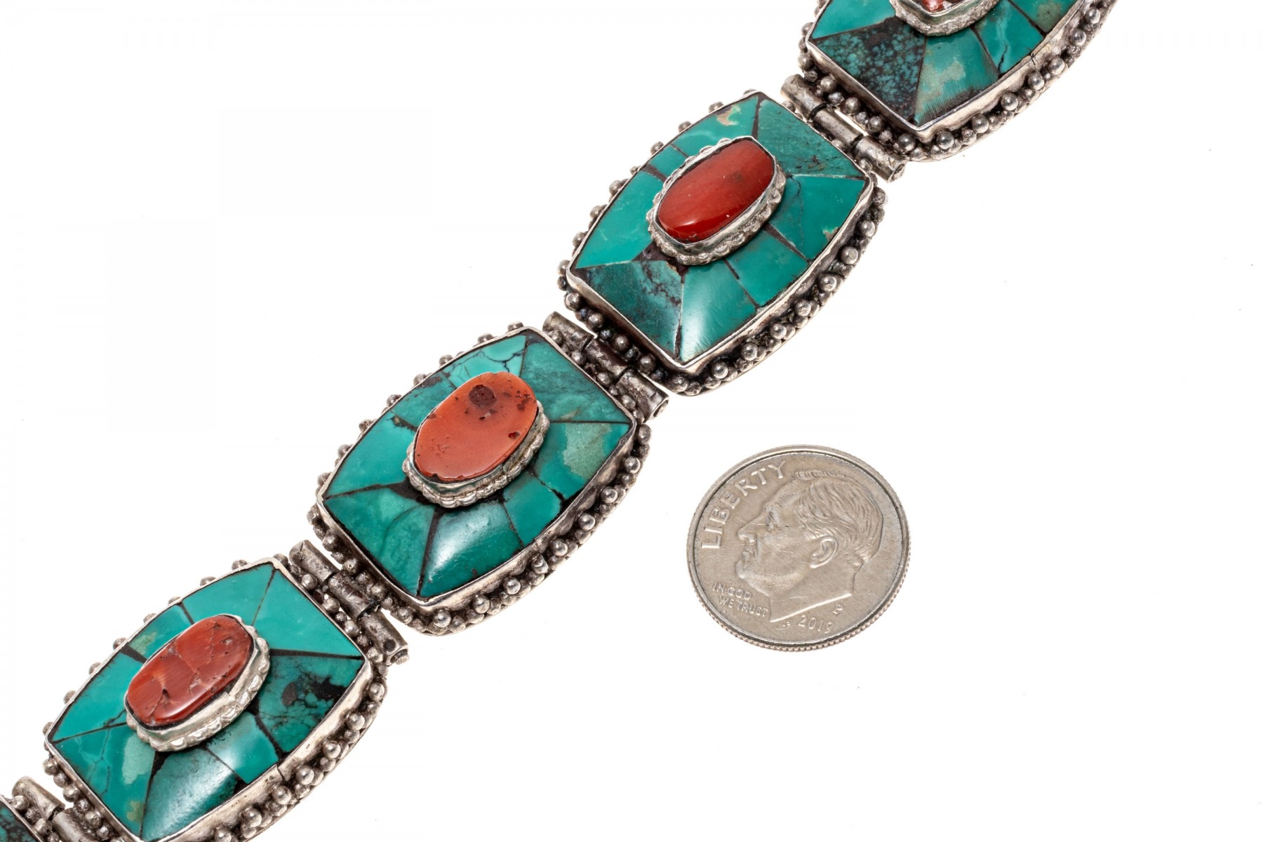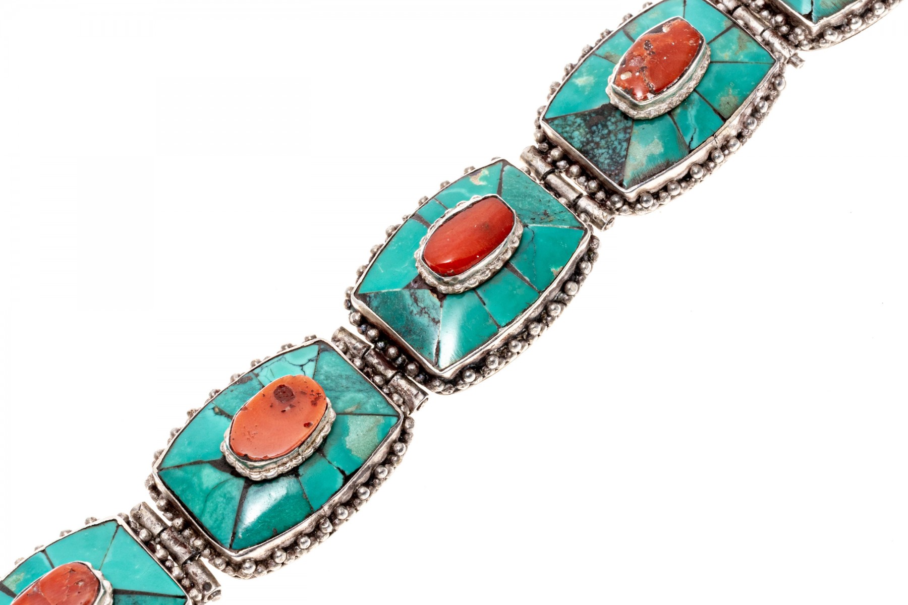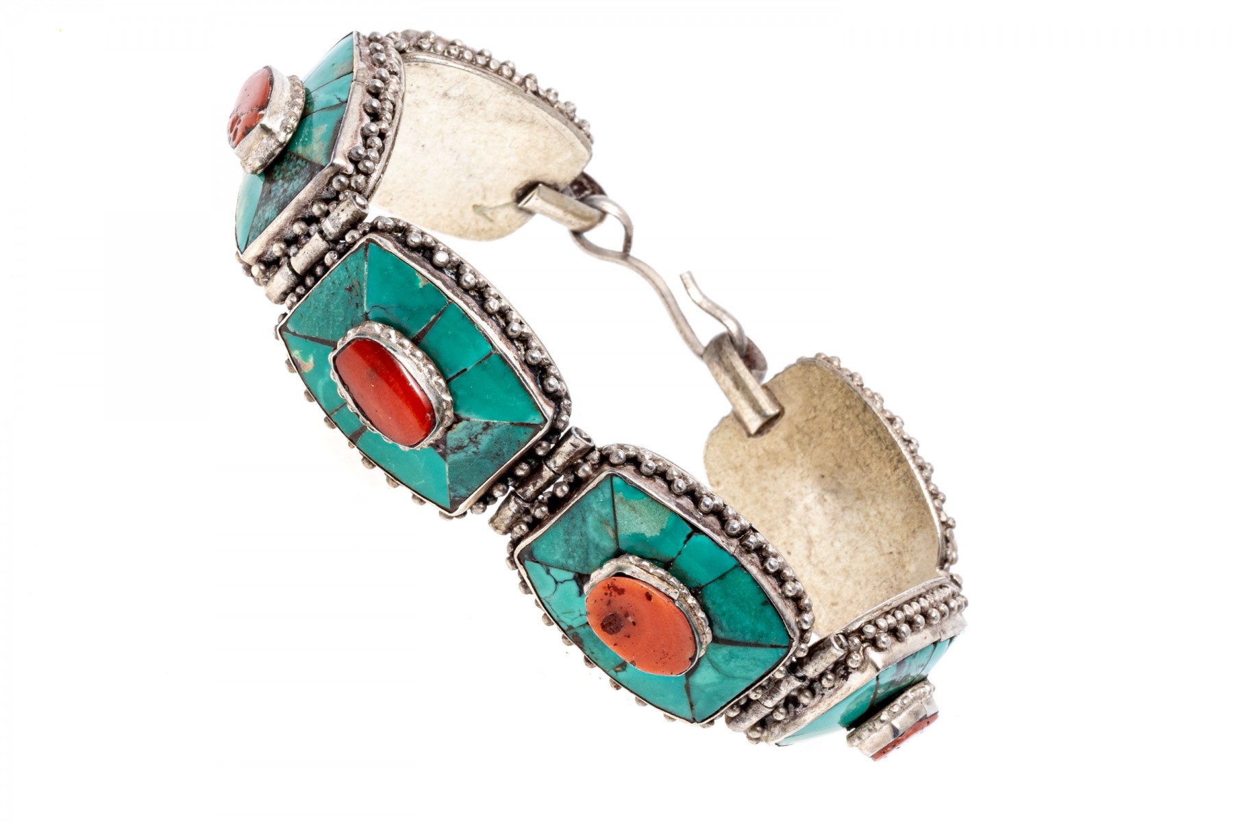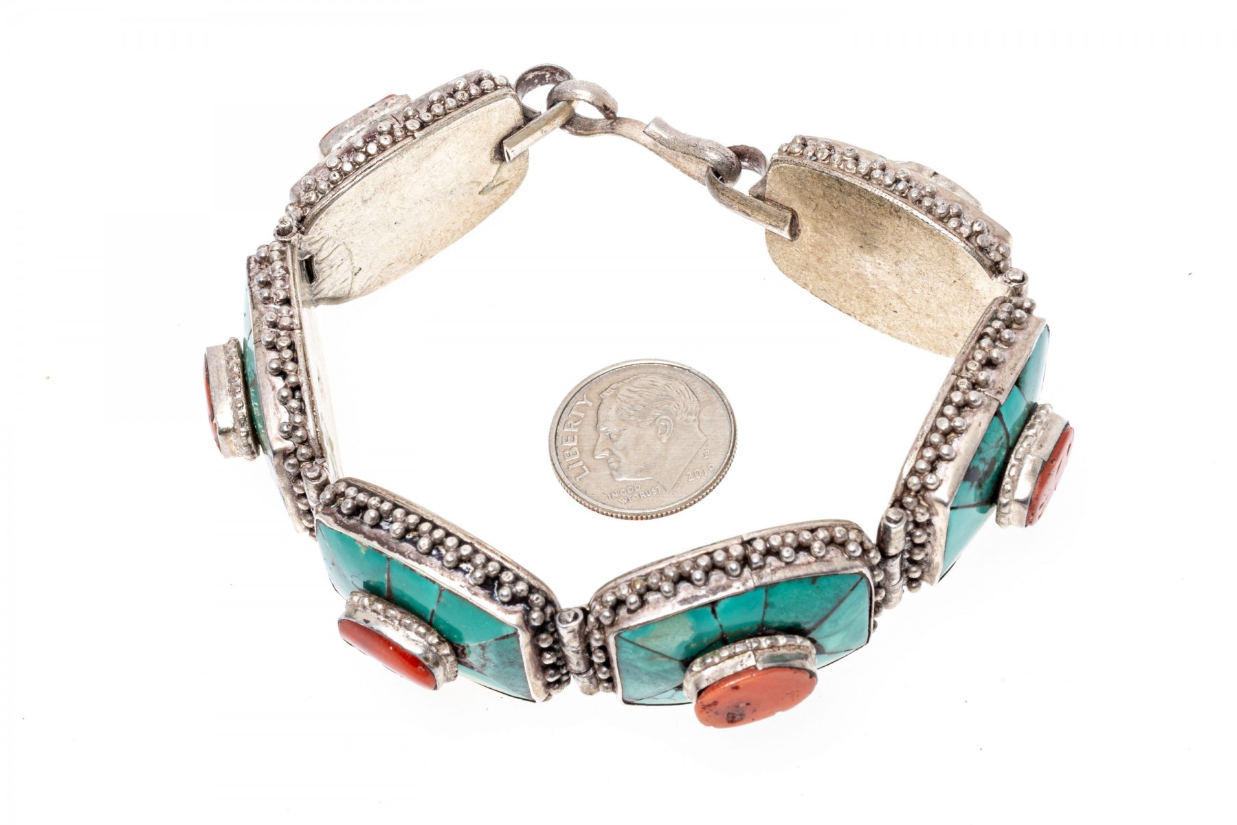 Sterling silver striking Southwestern motif turquoise and coral link bracelet, finished with a hook style clasp